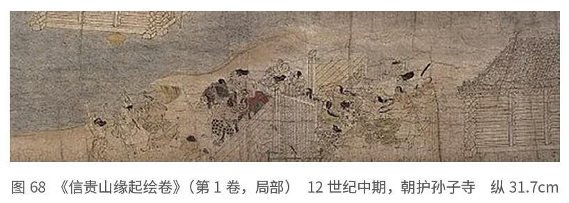 图67是《鸟兽戏画》甲卷,是借用野地里玩耍的兔子、猴子以及鹿等动物比拟为人的一种风俗画。在溪流中兴高采烈地玩水嬉戏的动物形象与当时儿童们充满朝气游戏的情形相重合。有段歌谣写出了当时的情景,很是贴切:“且玩焉,生于世;且戏焉,生于世;且听玩童之声,或然此身亦动乎?”〔出自平安末期的歌谣集《梁尘秘抄》,编者为后白河法皇,作于治承年间,即1180年前后〕日本美术对待三维空间的表现采取了“拨无”〔佛教用语,意思是“推开、顶回、不顾”。道元在《正法眼藏》中使用过这个词〕的态度。源丰宗曾这样说过:欧洲的世界观是空间性的,而日本的世界观是时间性的(源,1987)。确实,看看《信贵山缘起绘卷》(图68)之类的绘卷就会同意这种观点。在时间的流逝中所发生的难以预料的偶发事件,被如此生动的“游戏心”所捕捉、绘就类似的画卷恐怕是绝无仅有的吧。命莲使魔法驱散装米的草袋队列,草袋像大雁群渐渐消失于远方。这样的描绘,虽说也顾及到了空间的纵深,但在这里与时间的流逝紧密相连、息息相关。