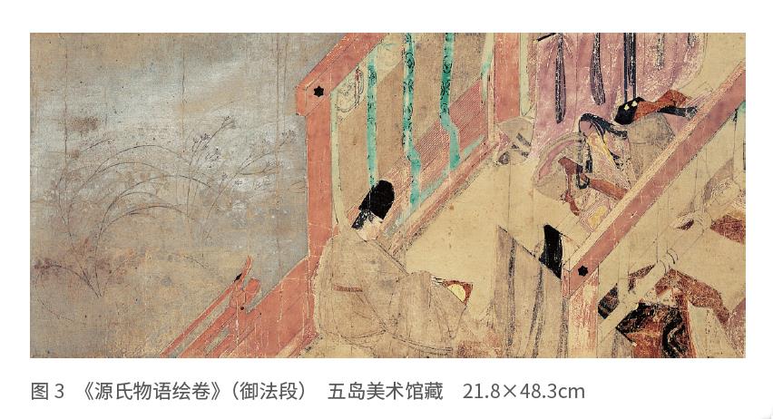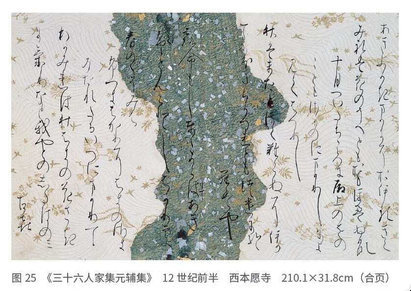 正如前面说过的,9世纪末,遣唐使制度被取消,接着日本式的装饰样式在王朝贵族的手中产生并发展成熟。这些与游戏之间密不可分的关系,通过赛画游戏的观赏方式可窥一斑。赛画是当时流行于贵族之间的赛物游戏之一种,左右双方拿出名家高手的绘画,或写有诗歌的册子或画卷,比赛绘画的完成度和装帧。穿戴华贵的贵族们欢聚一堂,会场装饰得宛如庭园中滨洲,极尽风雅之能事,堪称名副其实的美之游戏。《源氏物语绘卷》(图3)和西本愿寺本《三十六人家集》(图25)是为赛画的平安贵族准备的、“美之消遣”的道具。