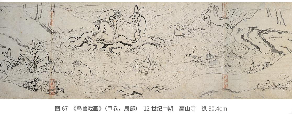 《今昔物语》讲到过11世纪上半叶有个与众不同的僧人义清阿阇梨画“滑稽画”〔日语“をこ絵”,注重讽刺、滑稽的戏画,是以线描为主的绘画〕的故事。“乌浒”(をこ)这个日语词意为愚蠢,但当时似乎并没有轻蔑的意思,反而像是一种赞美的话。话说有个人拿了张加长的纸死皮赖脸地要义清作画,义清在纸上啪的一下画了个小点状的东西就停笔了。求画人急了要他多画些,这次义清在纸的一端画了个执弓射箭的人物,在纸的另一端画了个靶子,然后在两者之间划一条线,表示箭在飞行的状态。求画人看后画生气地说:“这样的话,其他东西不就画不上去了吗?”据说义清装作若无其事的样子不予理睬。