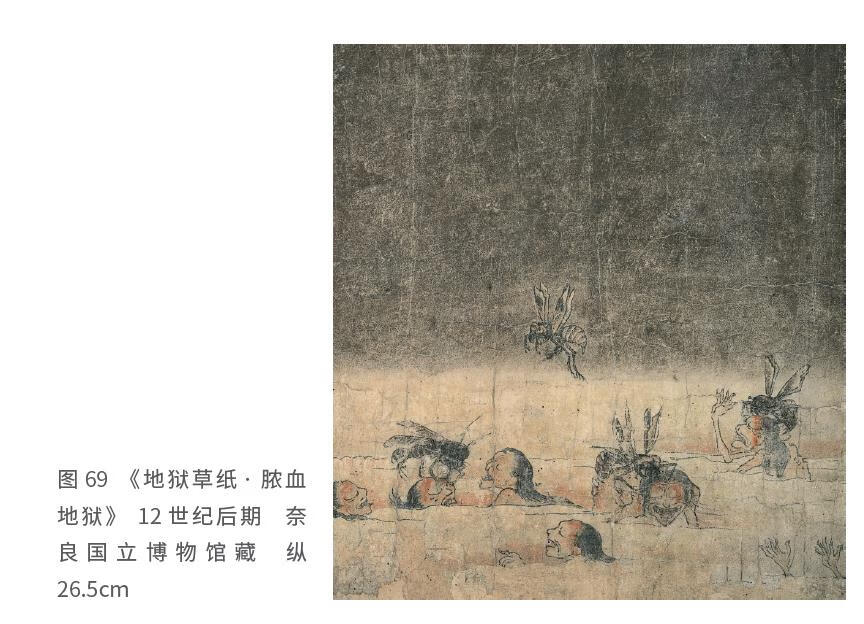 同样的幽默精神在规诫性的宗教绘卷“六道绘”〔六道绘:指反映地狱、饿鬼、畜生、阿修罗、人间、天道各界情景的绘画〕中依然存在,它大胆地揭示了现实的焦虑和丑恶。让我们来看看《地狱草纸》,在亡者坠入的粪池里,巨大的粪蛆长着胡子,睁大眼睛窥觎着,一脸的食人成性的表情。而脓池中长得像是从怪兽漫画中走出来的“最猛大虫”死死地咬住溺亡者,哀叫着的亡者脸部也如同漫画般夸张(图69)。不言而喻,这种幽默表现都是有意而为之的。