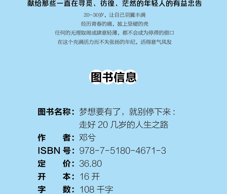 梦想要有了就别停下来 走好20几岁的人生之路邓兮从思想形象人格交际沟通耐力职场等各个方面给予20岁的年轻人诸多建议书籍