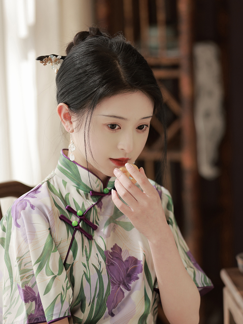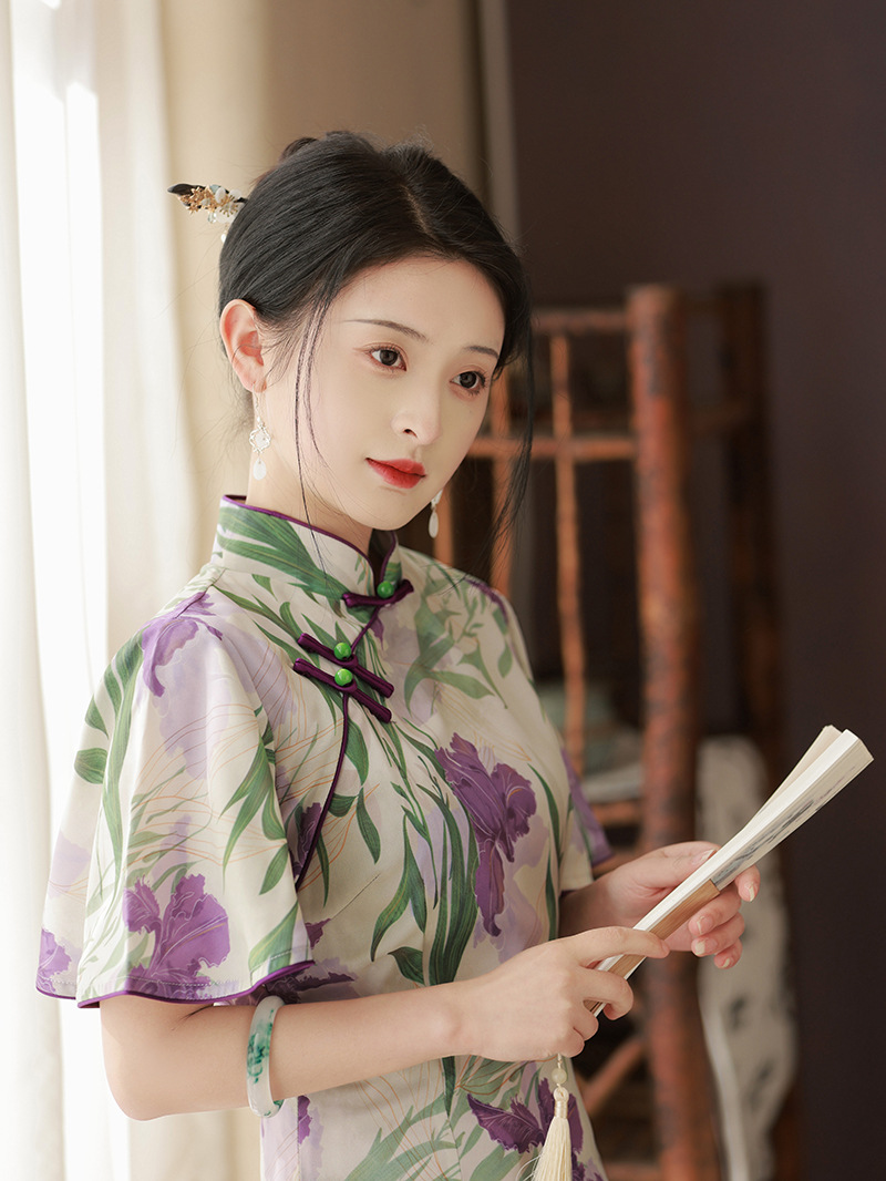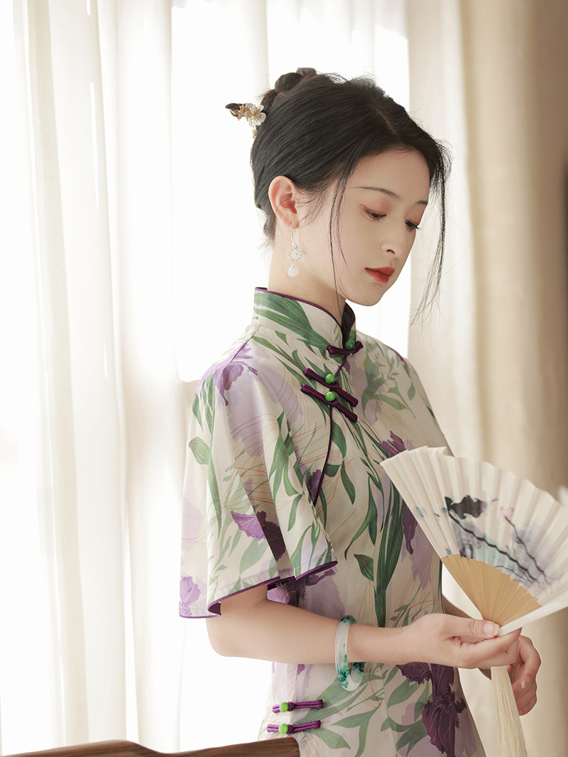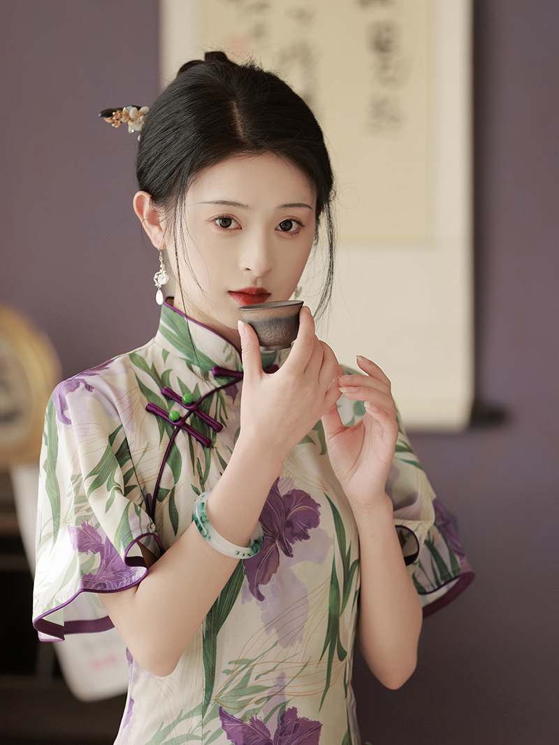 改良奥戴复古国风气质修身中紫色旗袍XL-23067