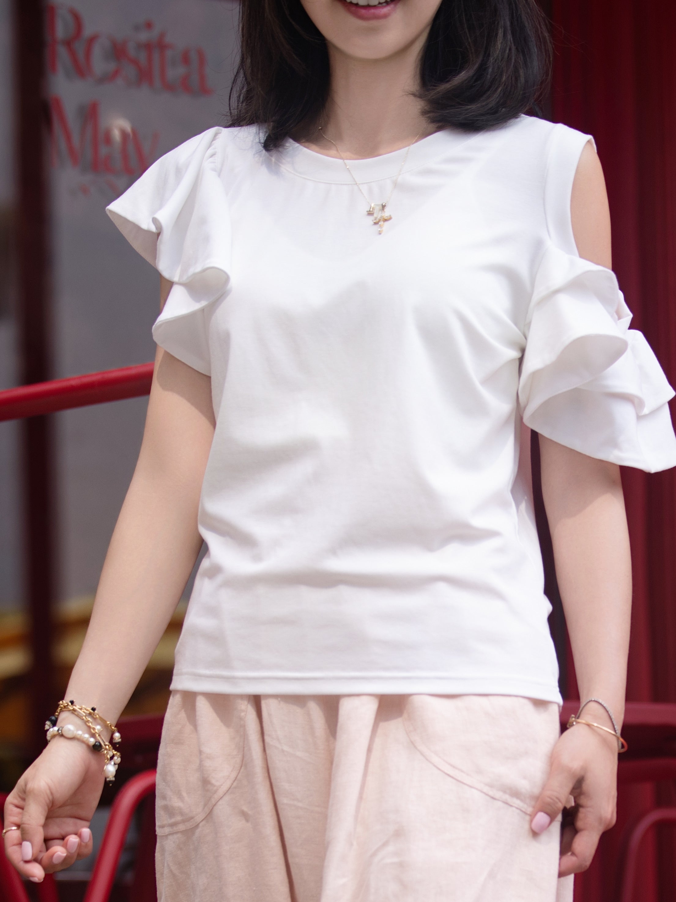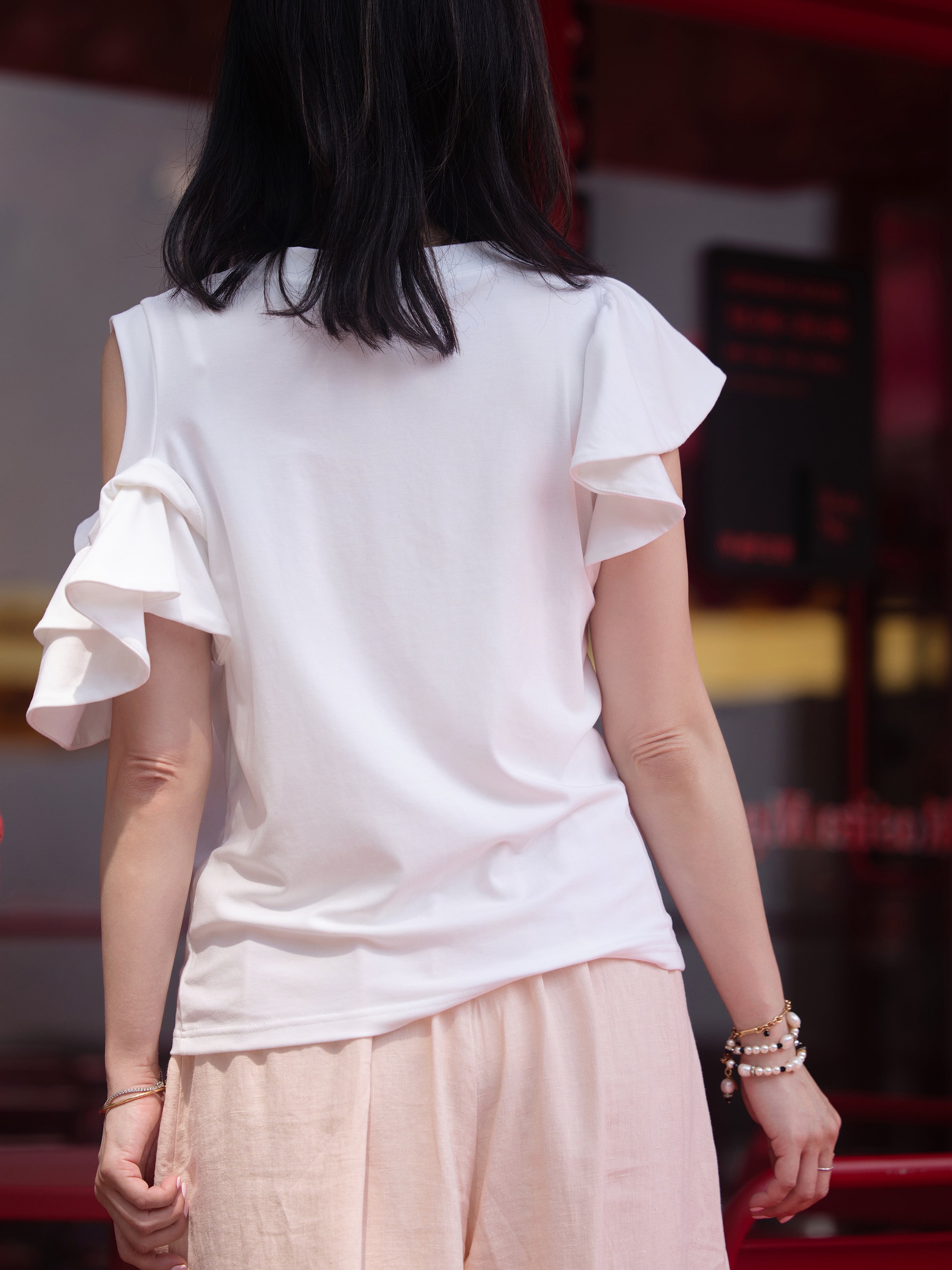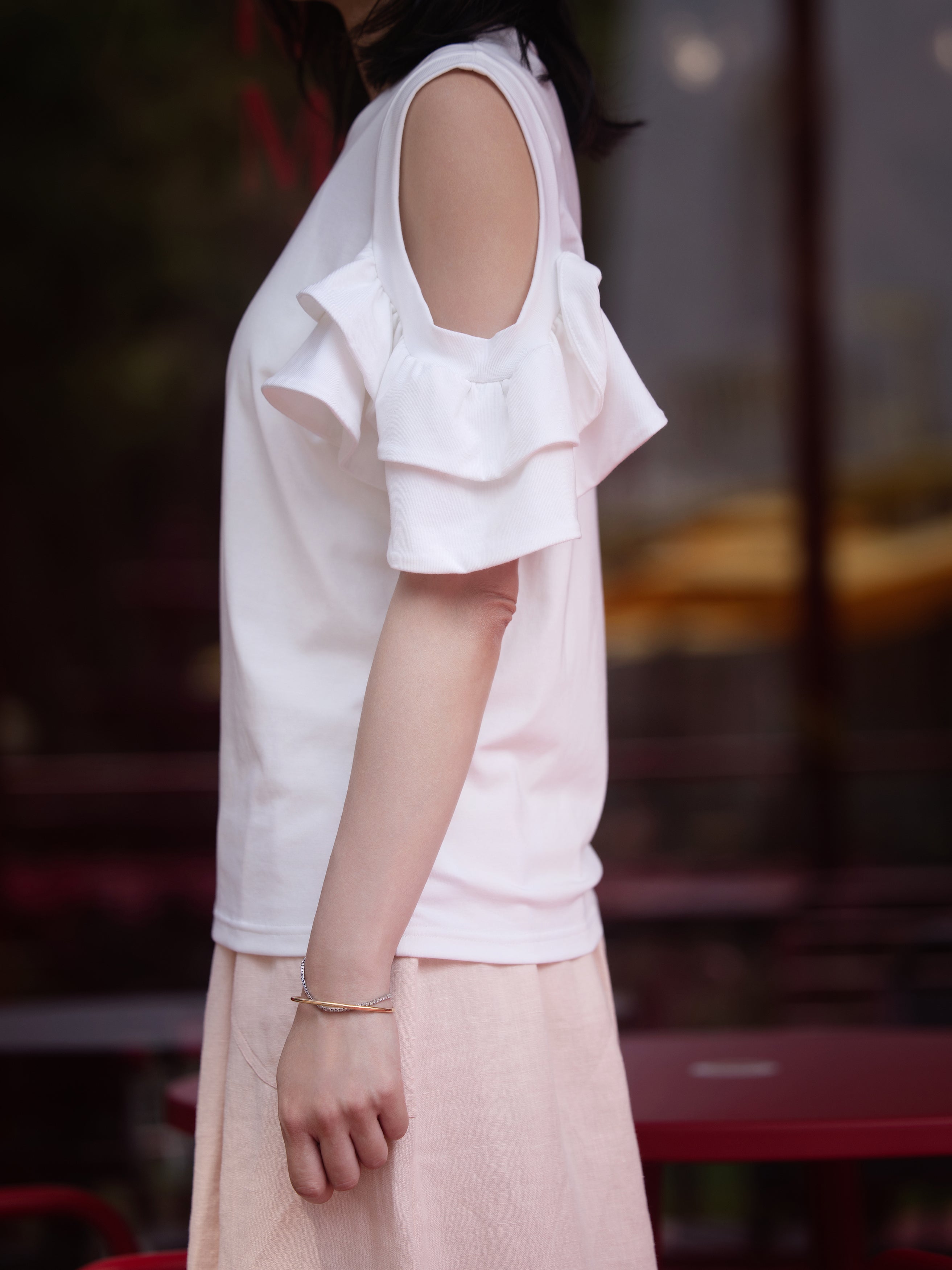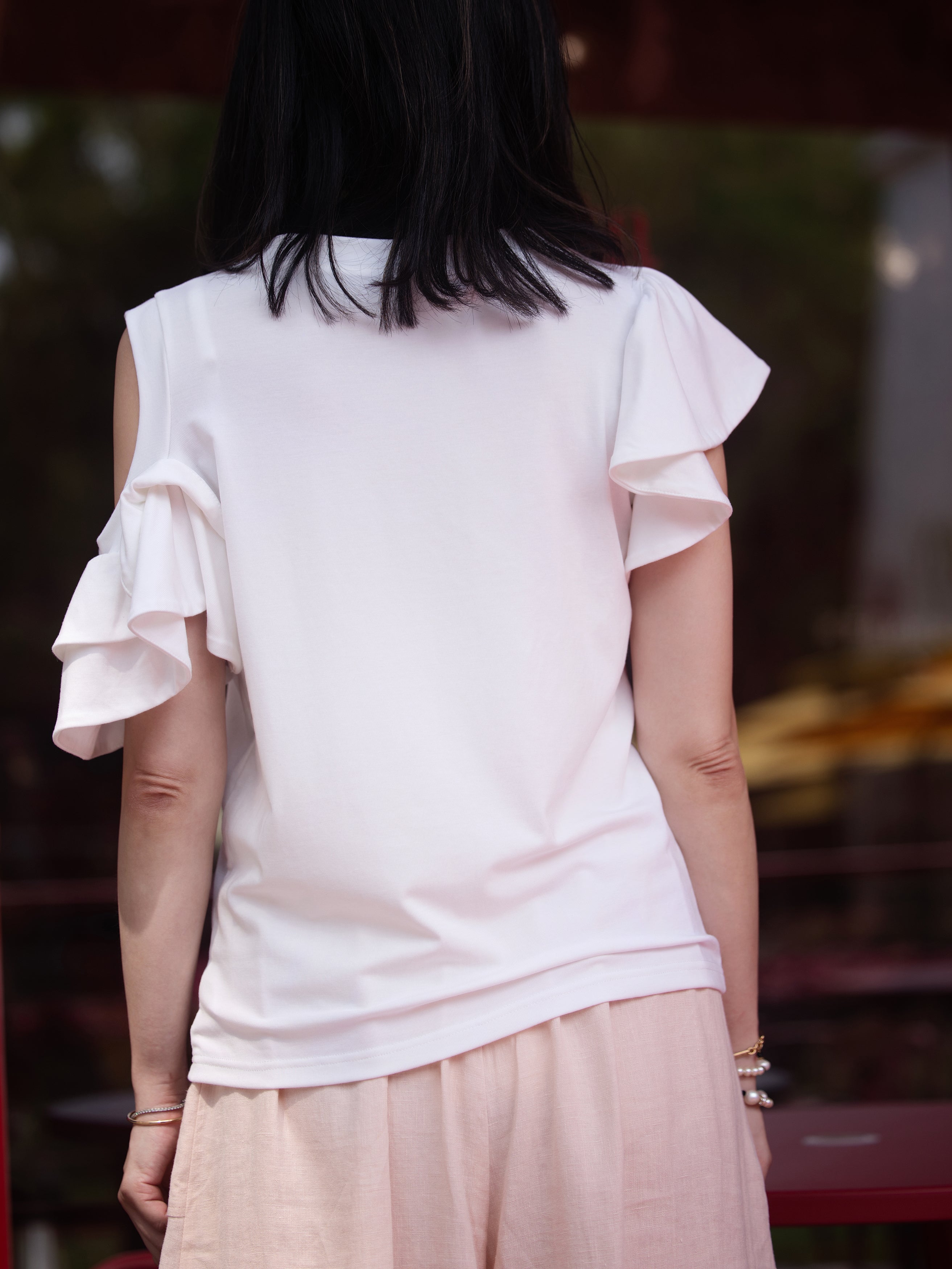 TYNVIE 平纹针织露肩荷叶边袖上衣 - 白色