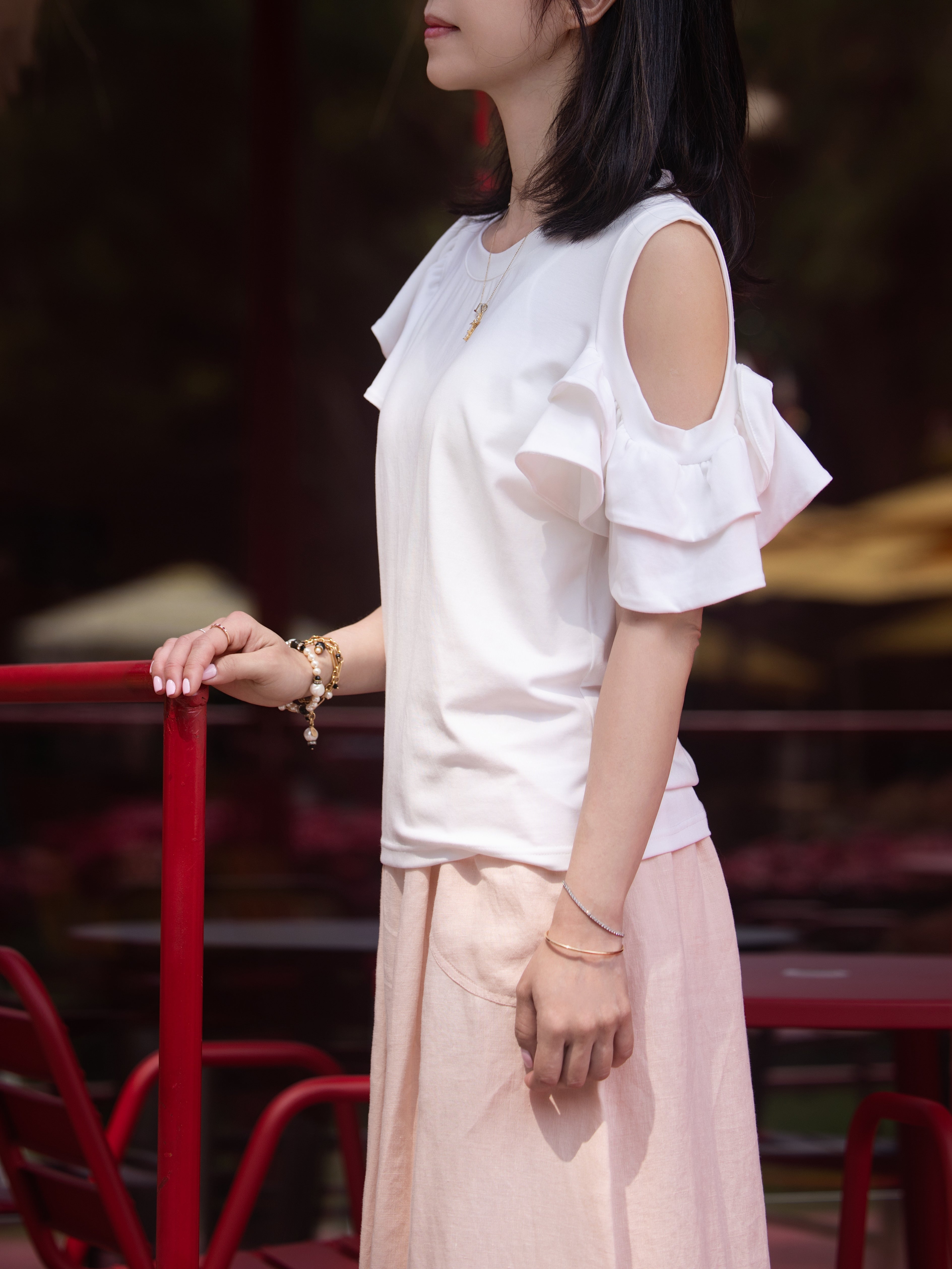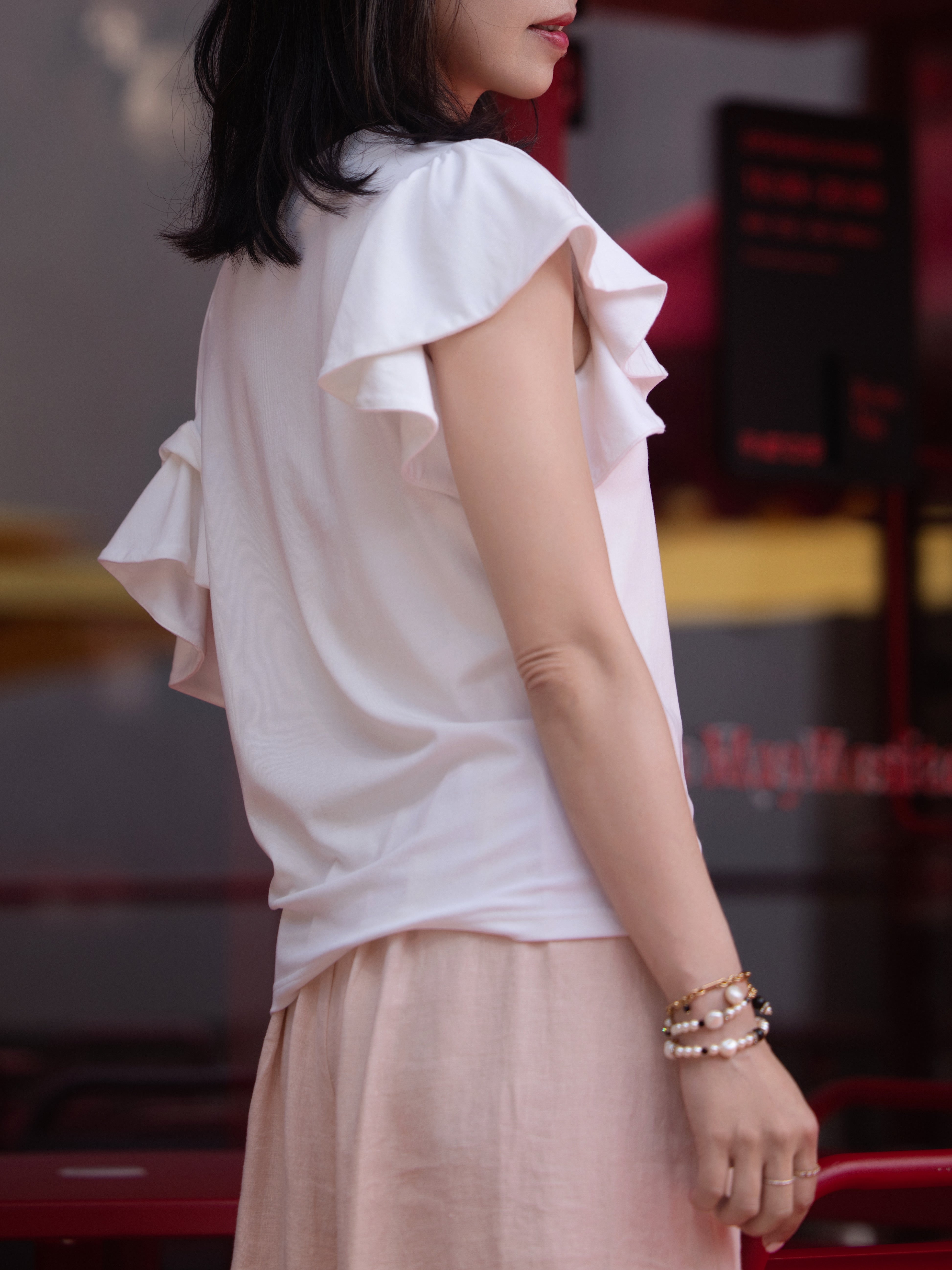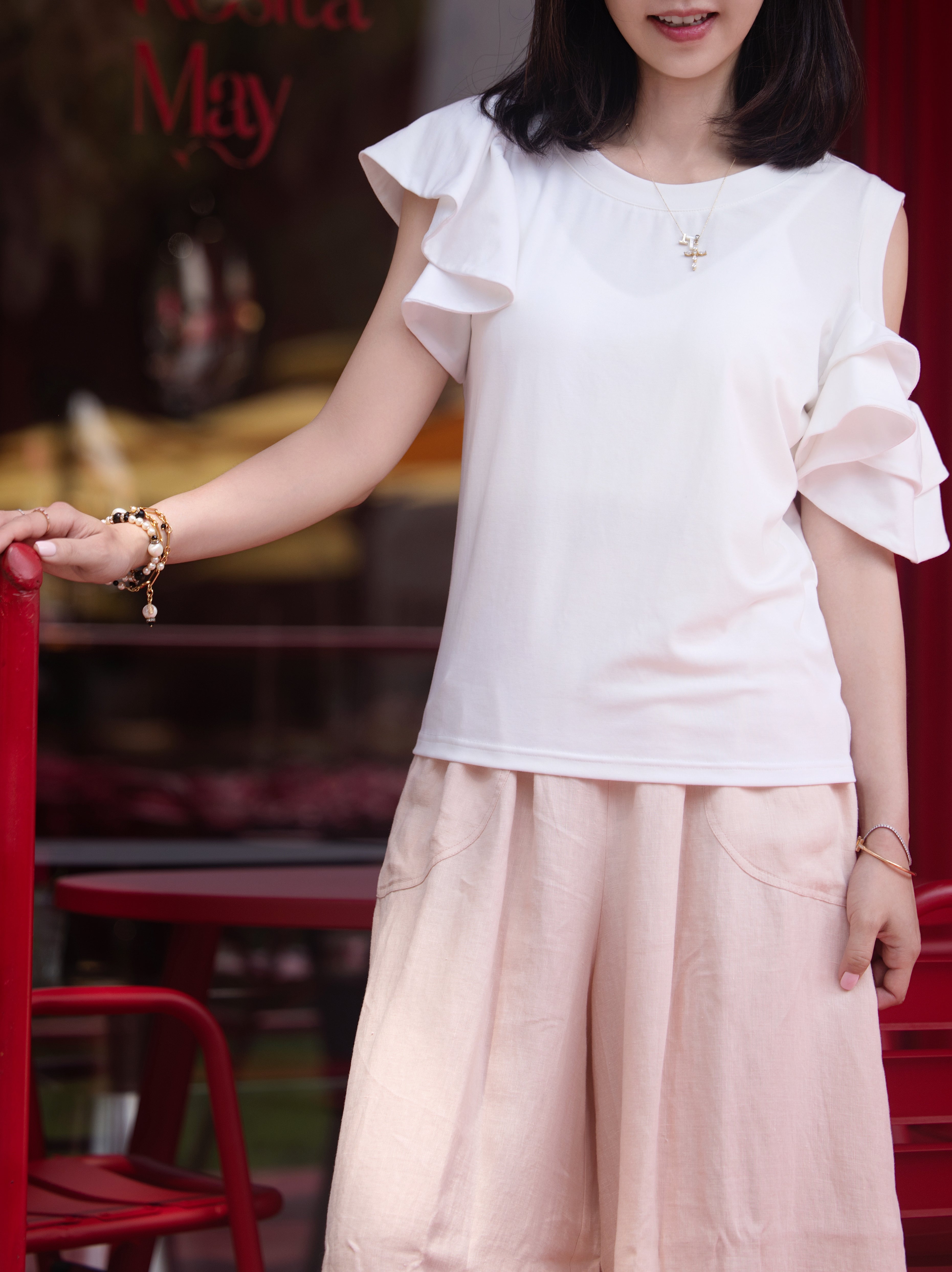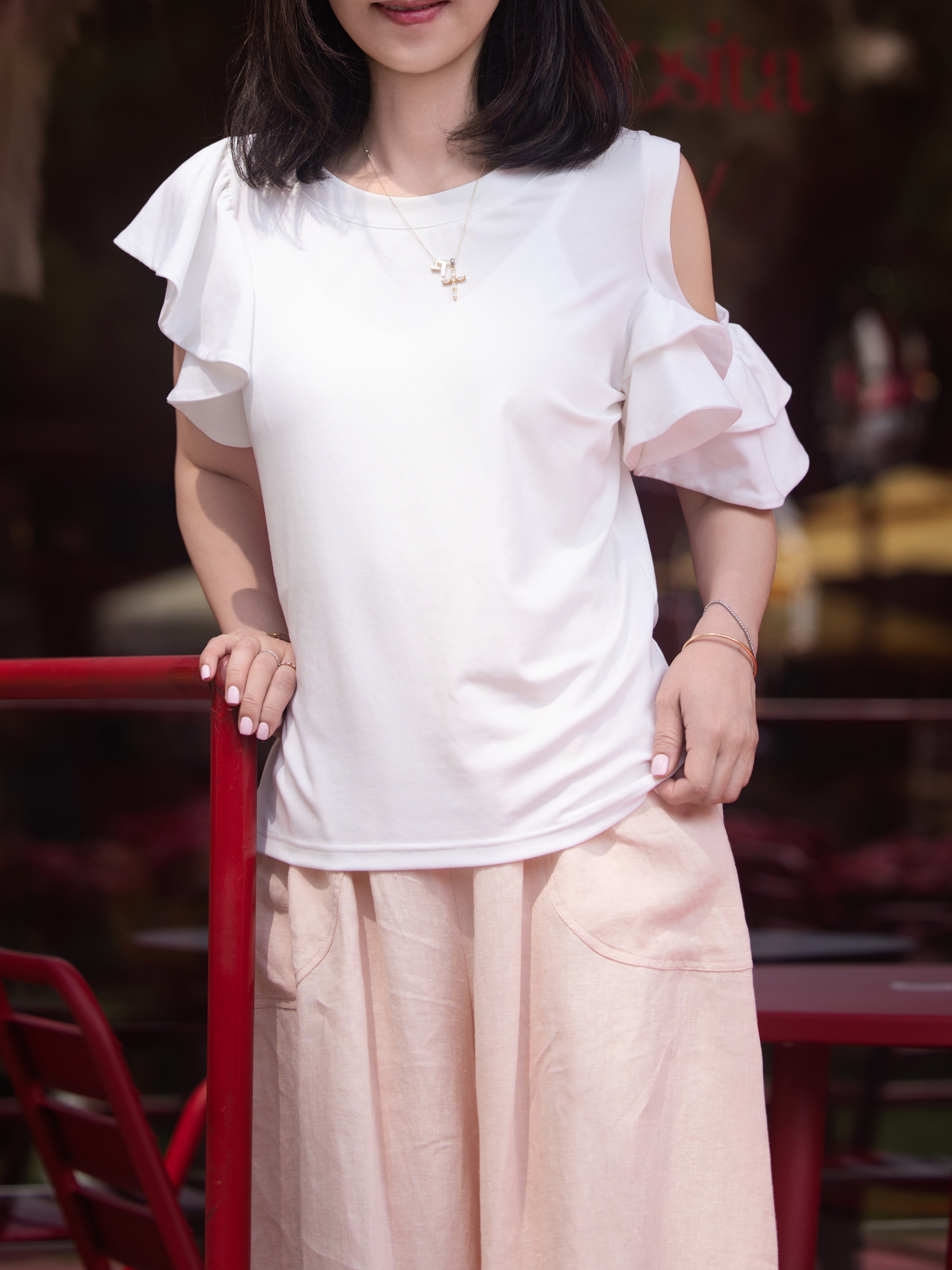 TYNVIE 平纹针织露肩荷叶边袖上衣 - 白色