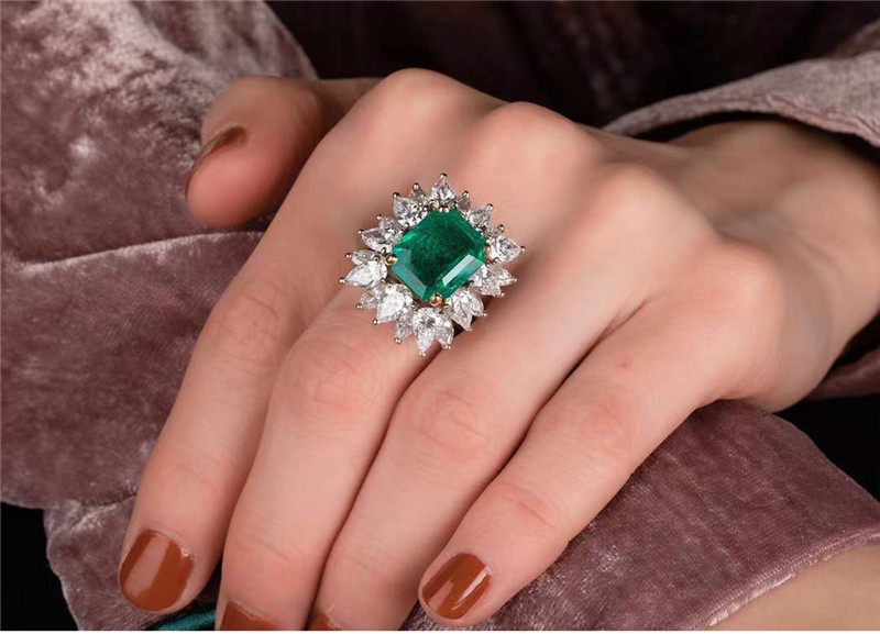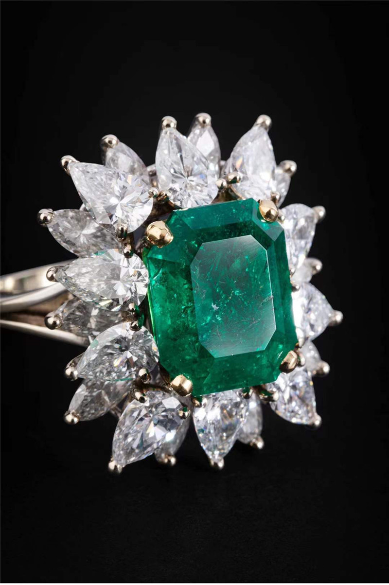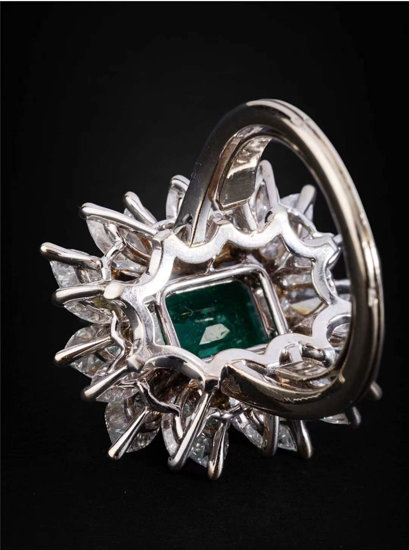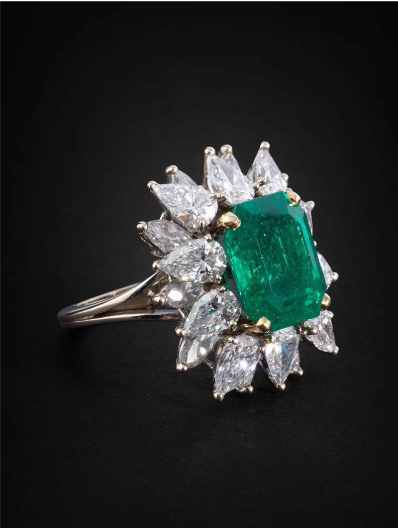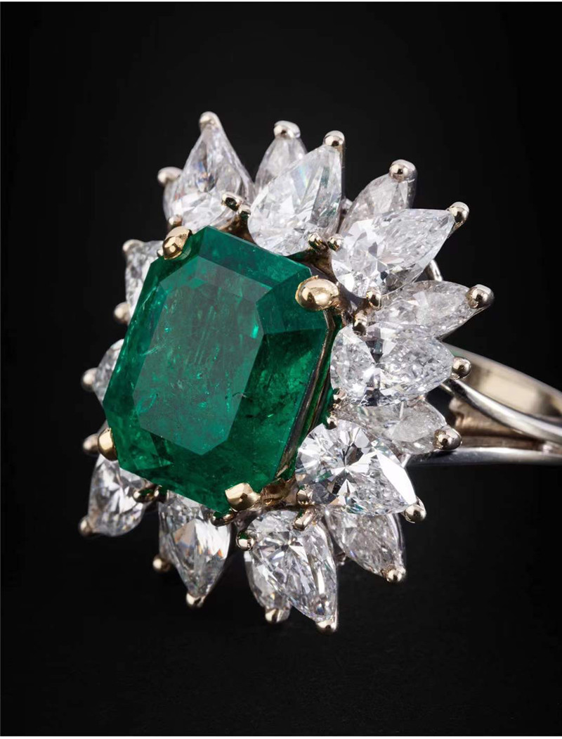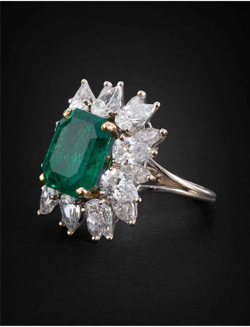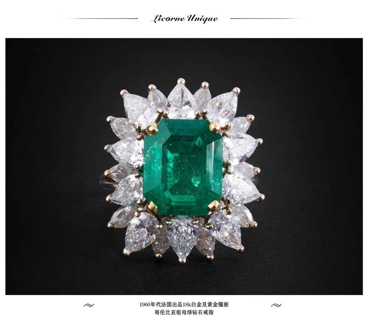 独角鹿西洋古董首饰珠宝法国18k白金及黄金镶嵌祖母绿钻石戒指
