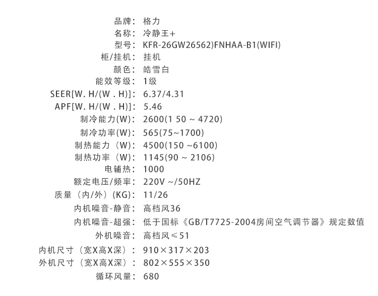 格力·冷静王+变频冷暖大一匹一级能效挂机空调 KFR-26GW/(26562)FNhAa-B1(WIFI)(皓雪白)