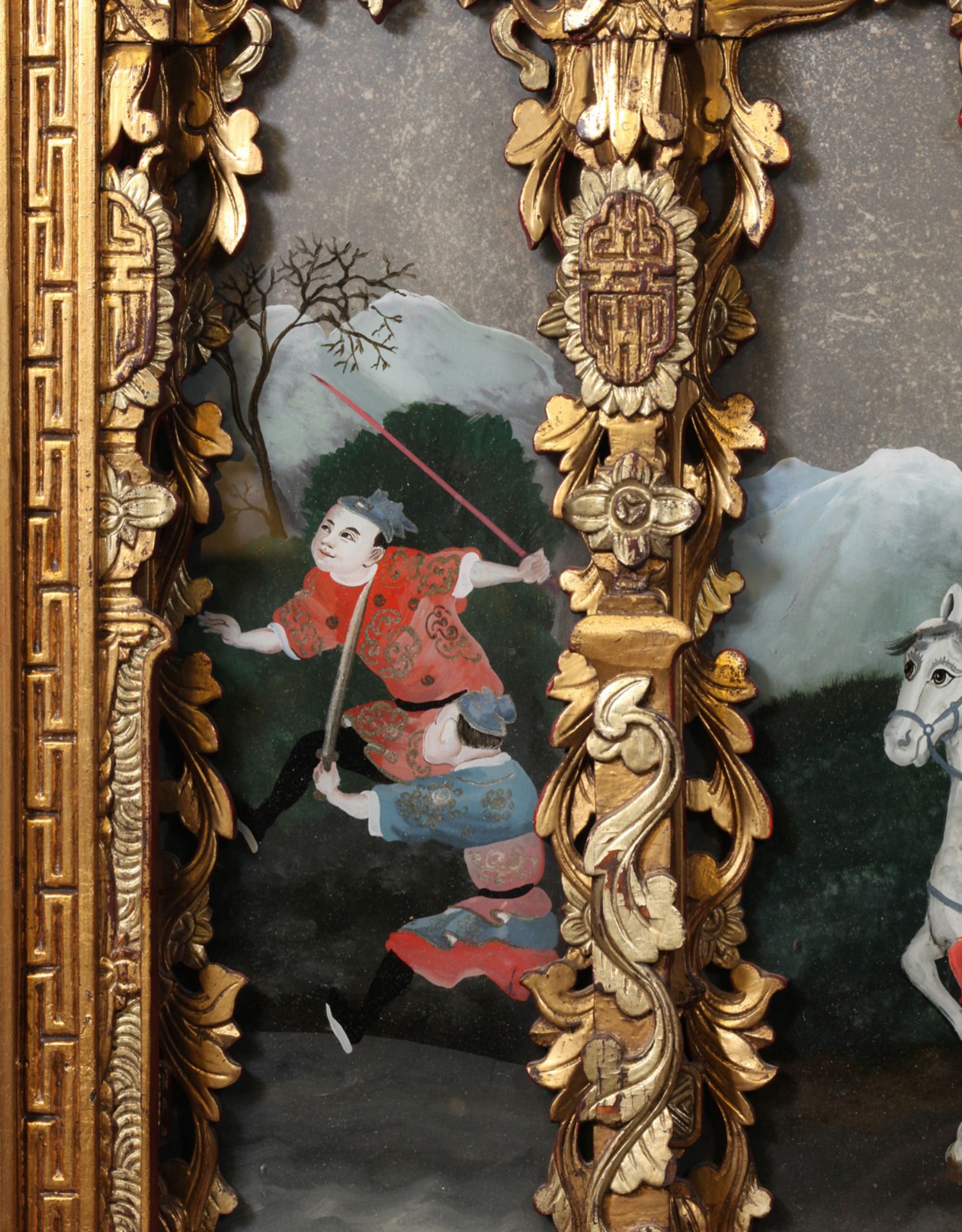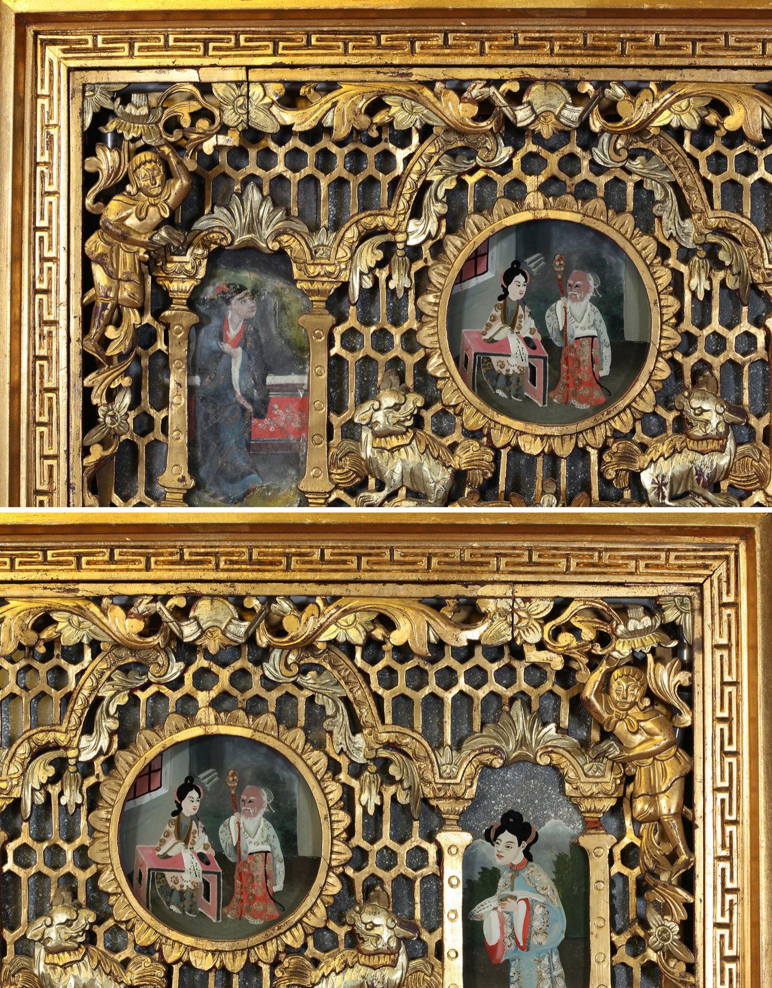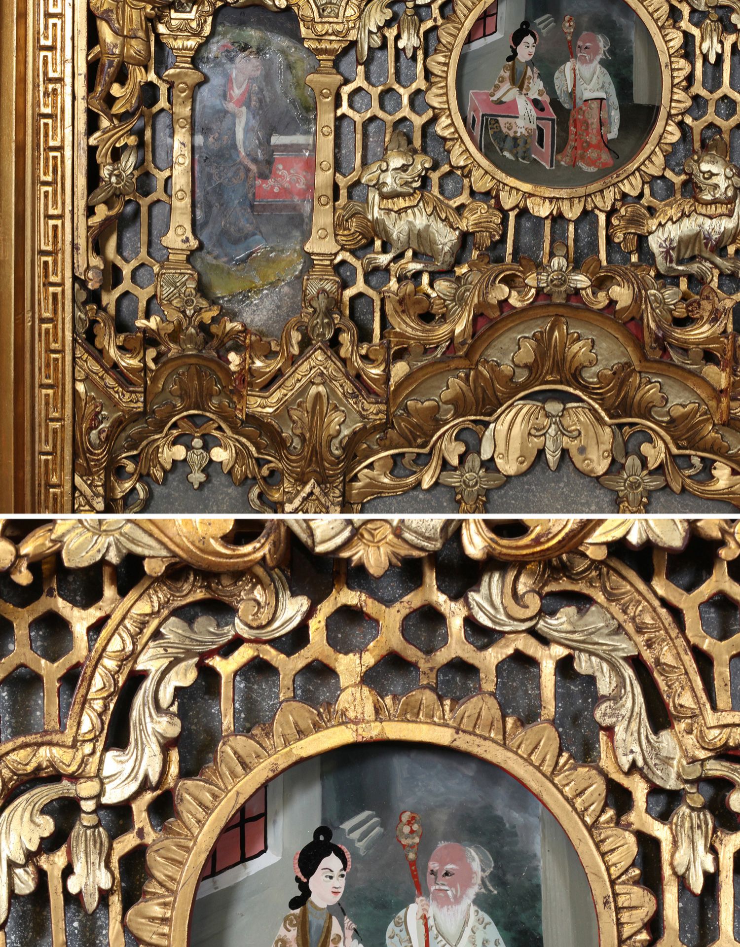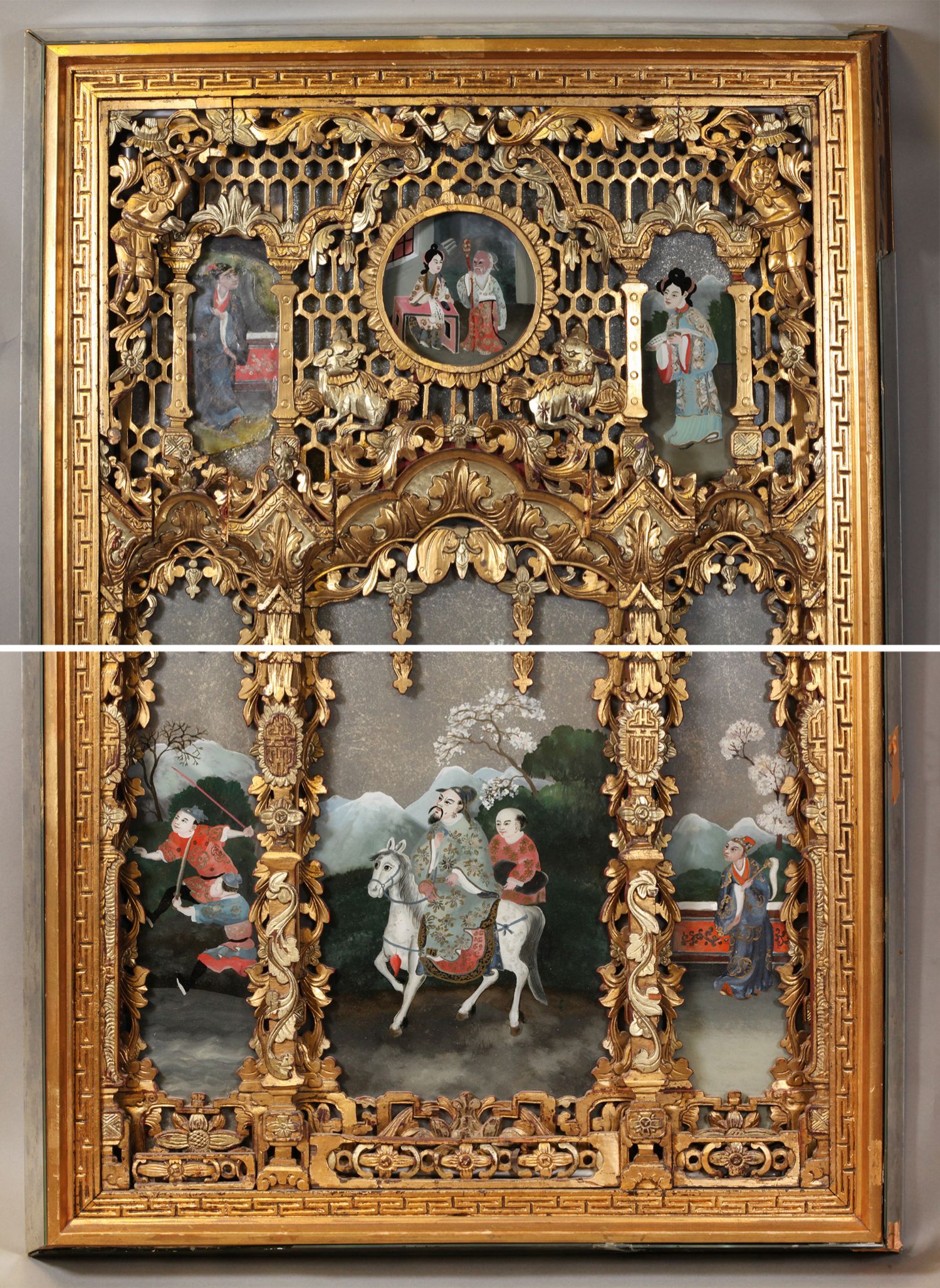 独角鹿西洋古董家居装饰墙壁挂饰中国镂雕金漆木框人物故事玻璃画