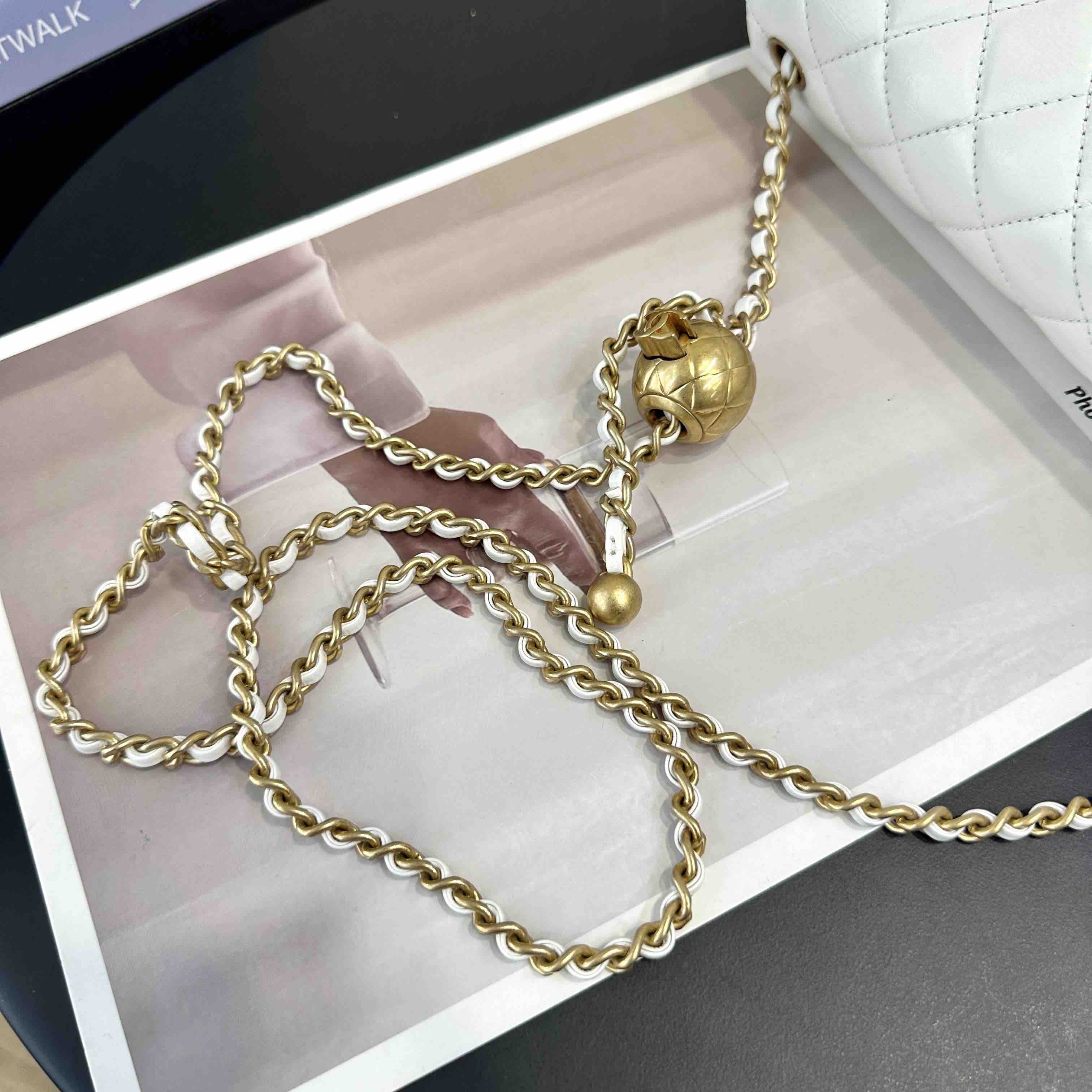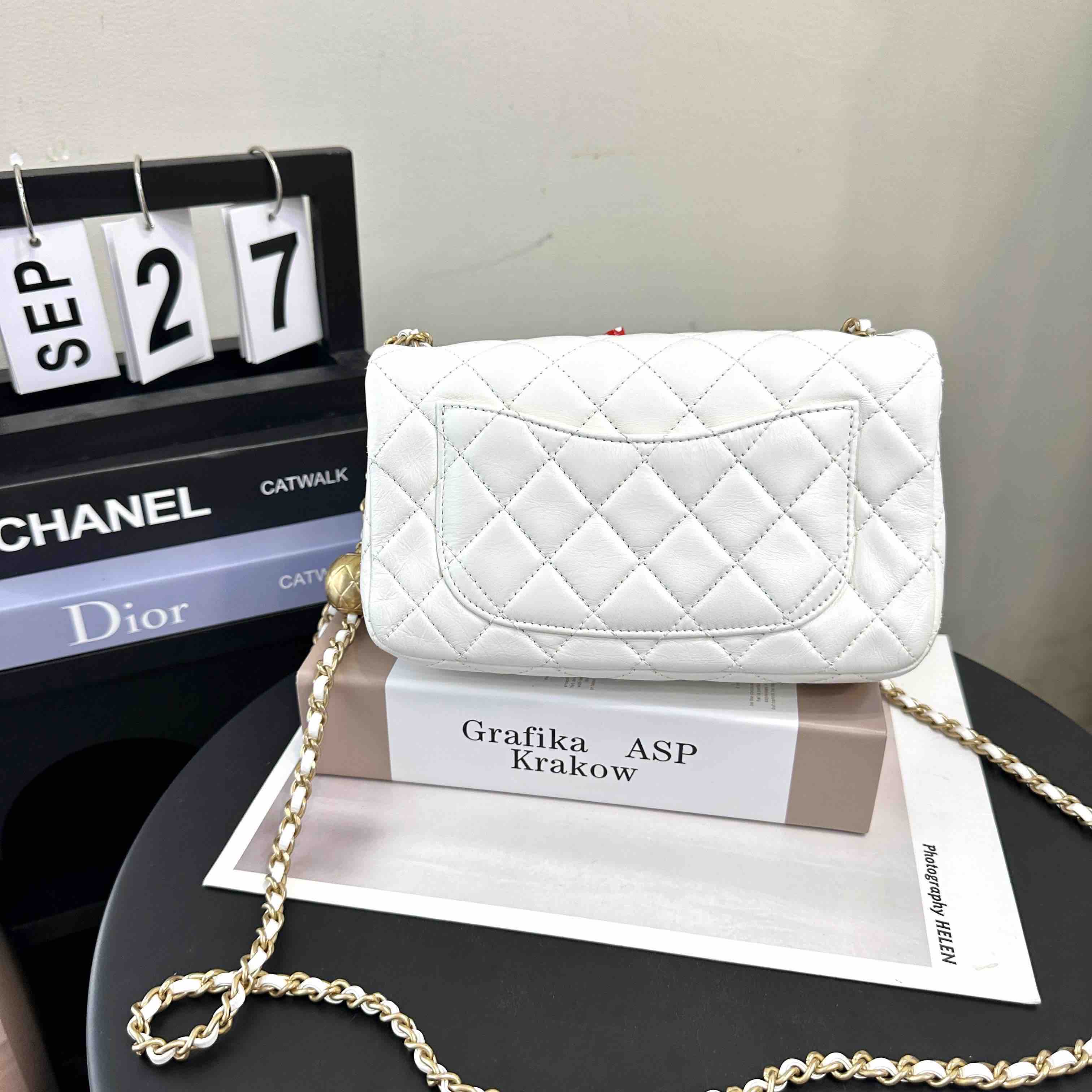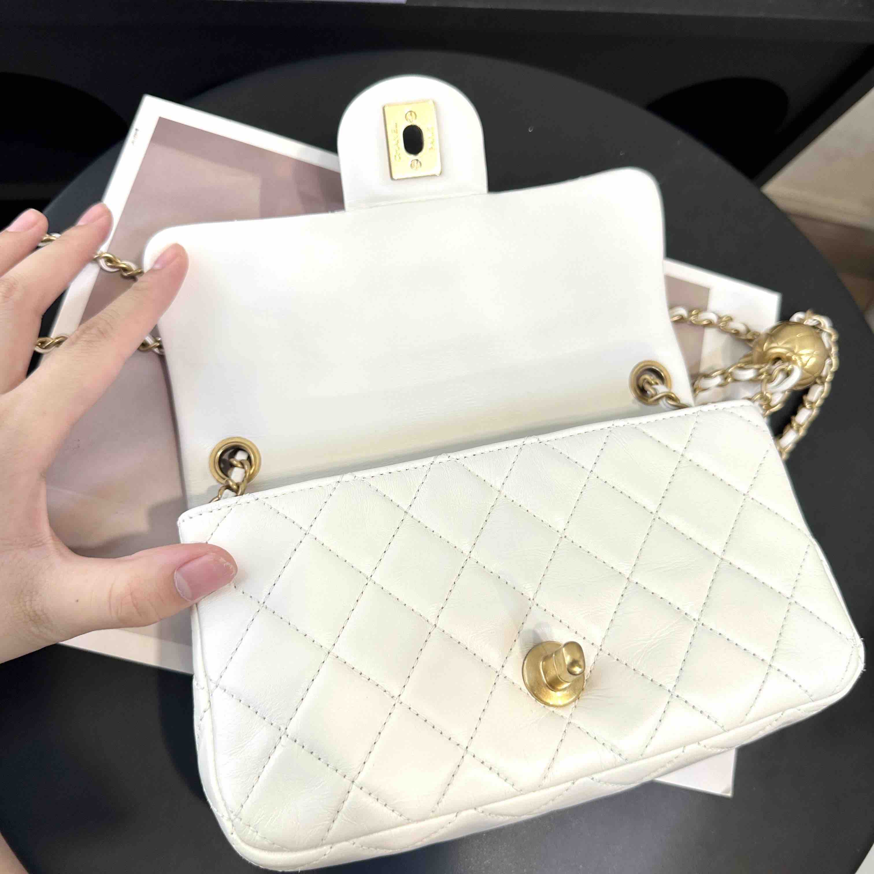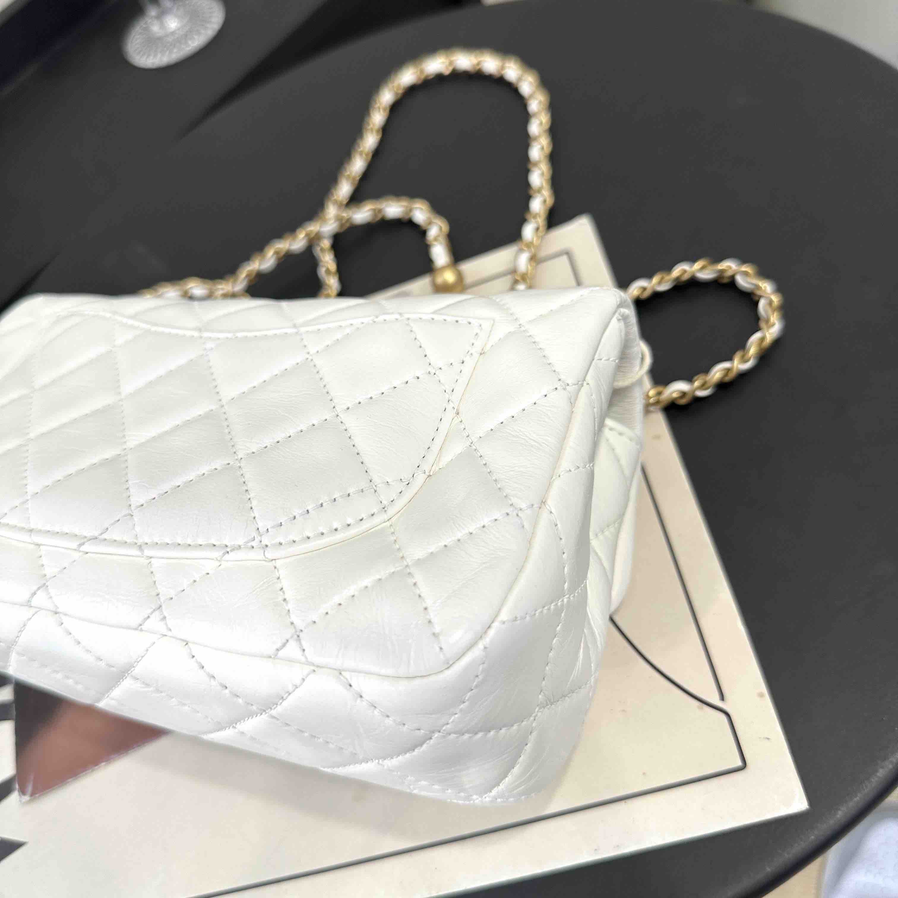 【商品详情】正品二手 Chanel 大mini 白色 金球 羊皮 斜挎包🧚🏻♀️95新 20×12 镭射30开 配件:防尘袋。包身已保养 状态较好