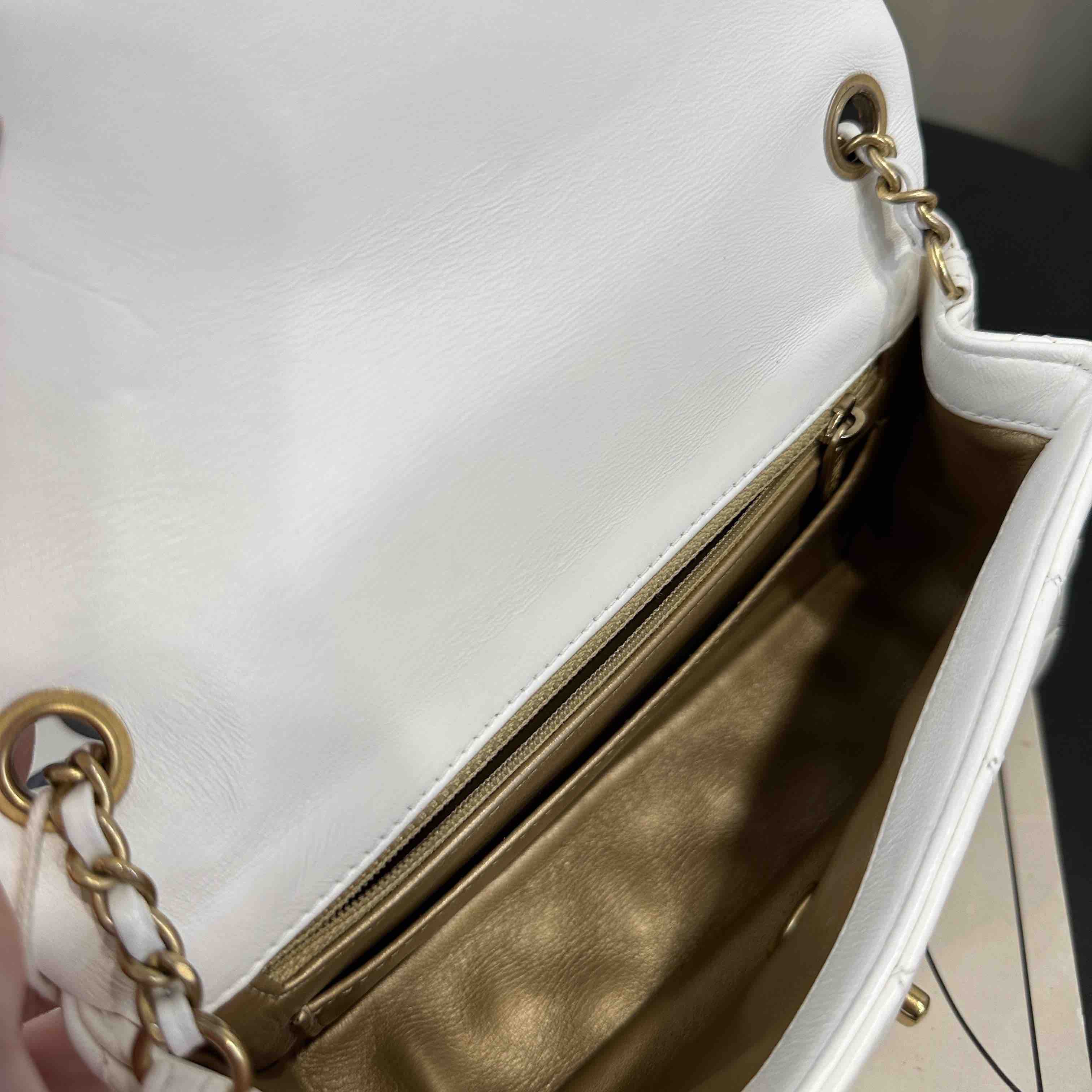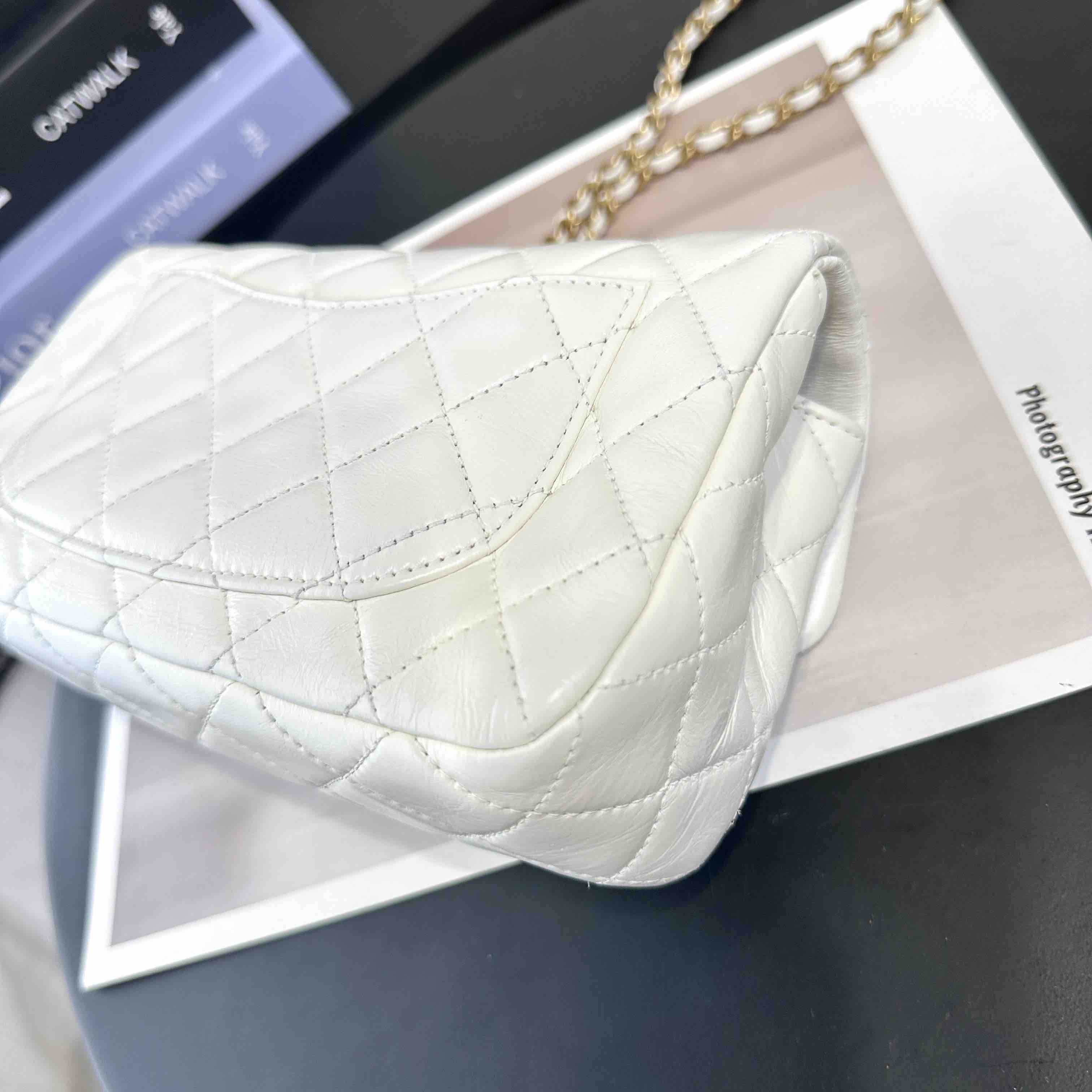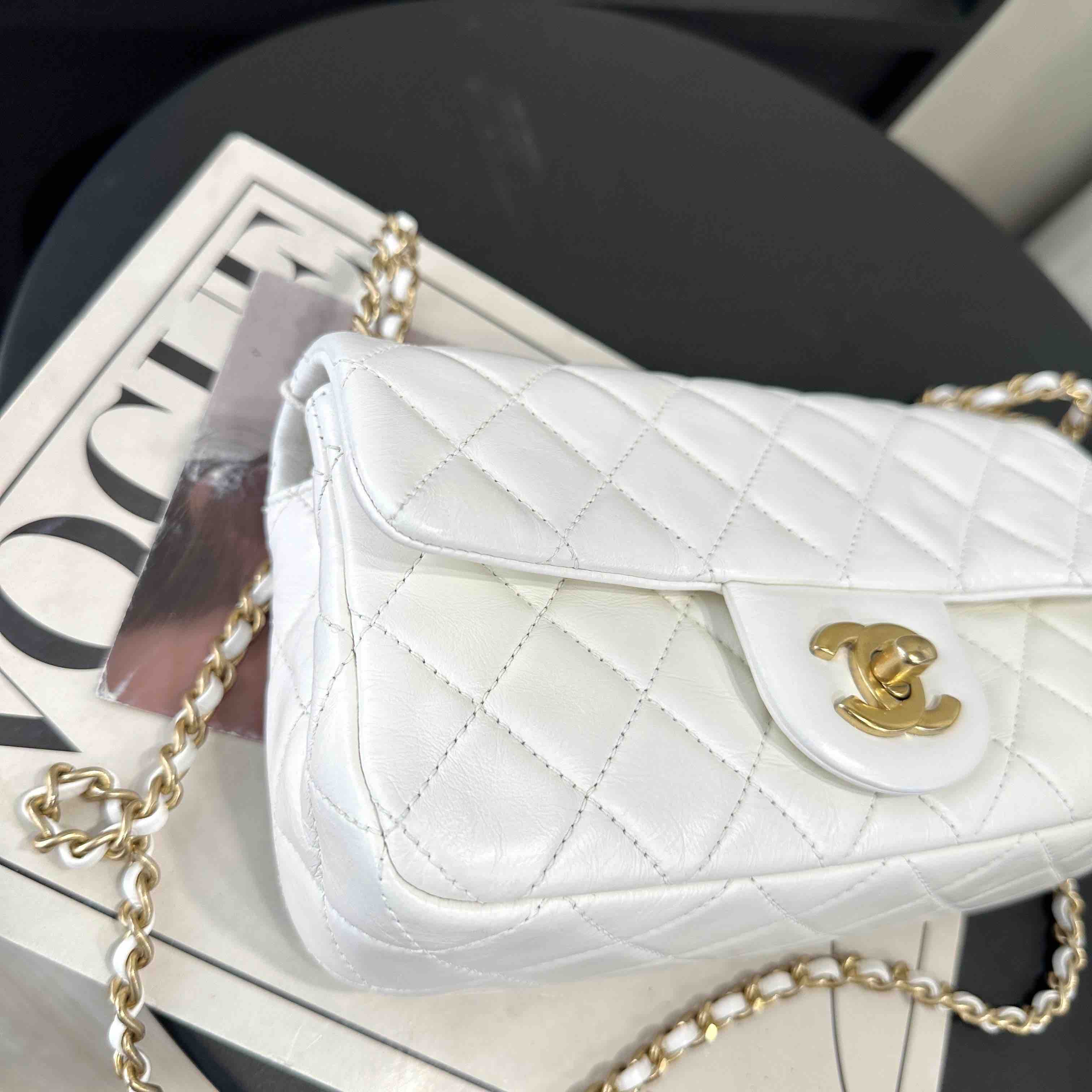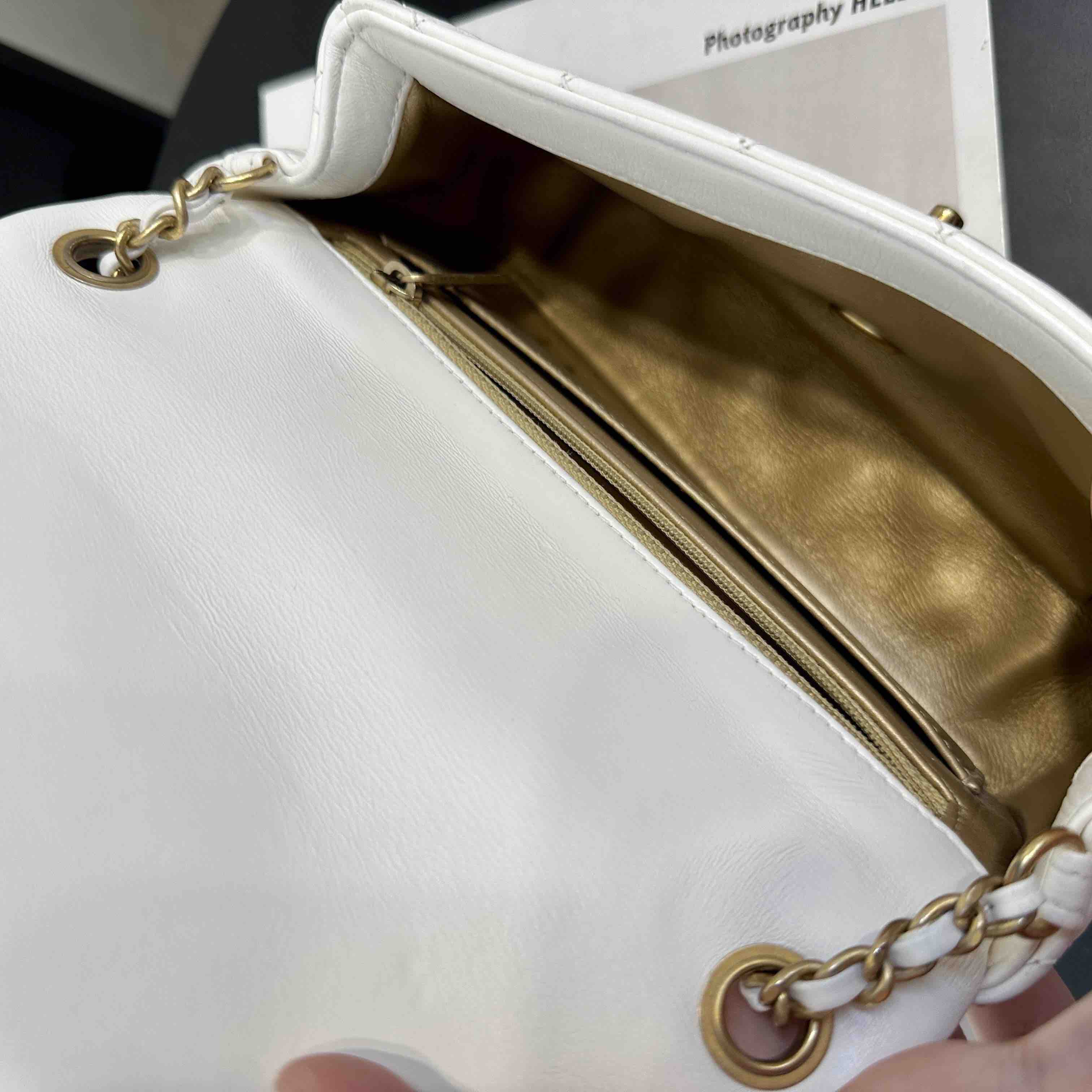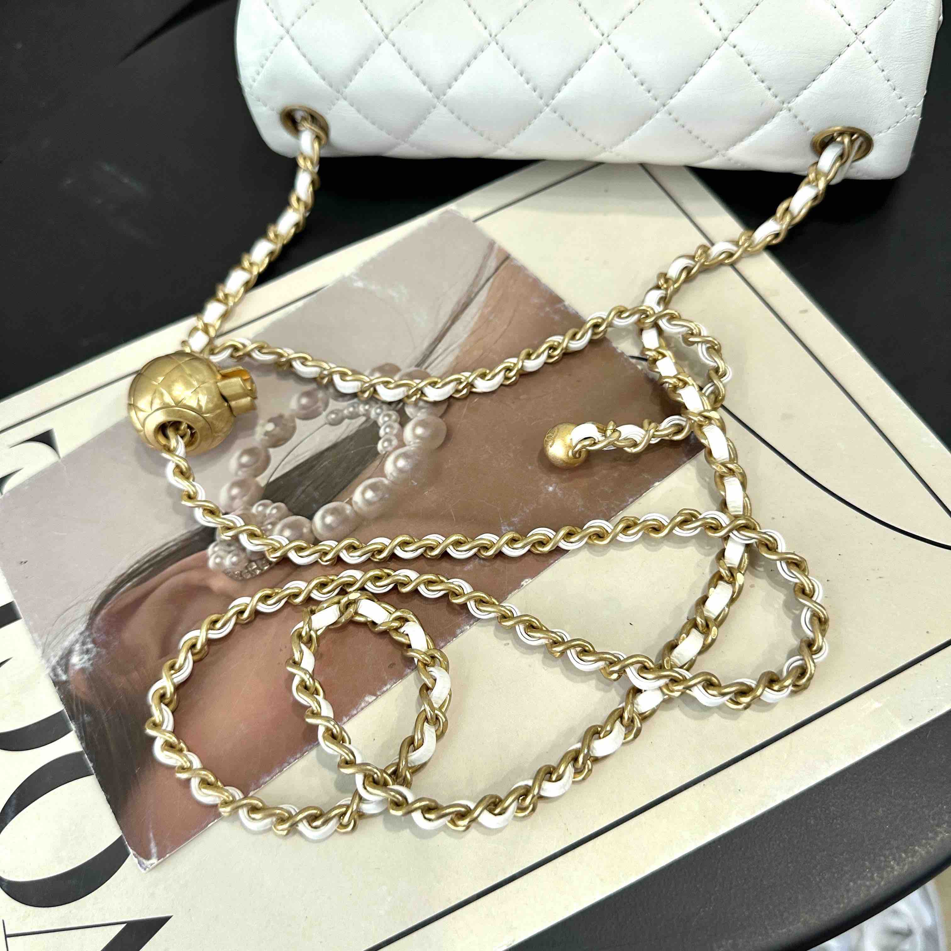 【商品详情】正品二手 Chanel 大mini 白色 金球 羊皮 斜挎包🧚🏻♀️95新 20×12 镭射30开 配件:防尘袋。包身已保养 状态较好