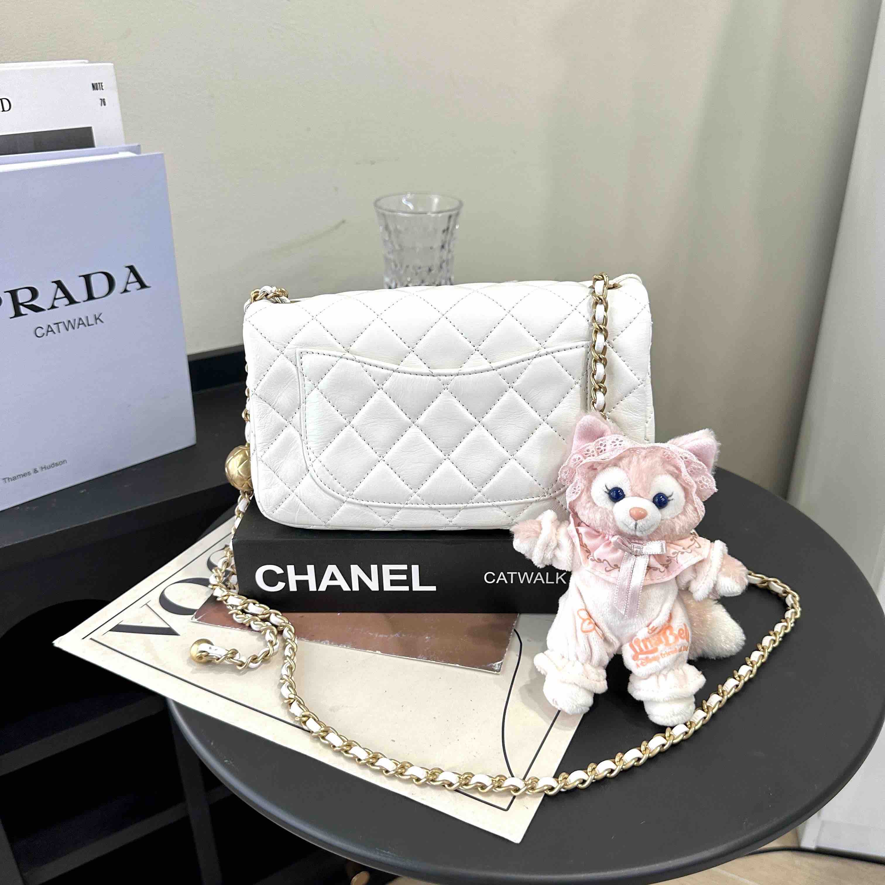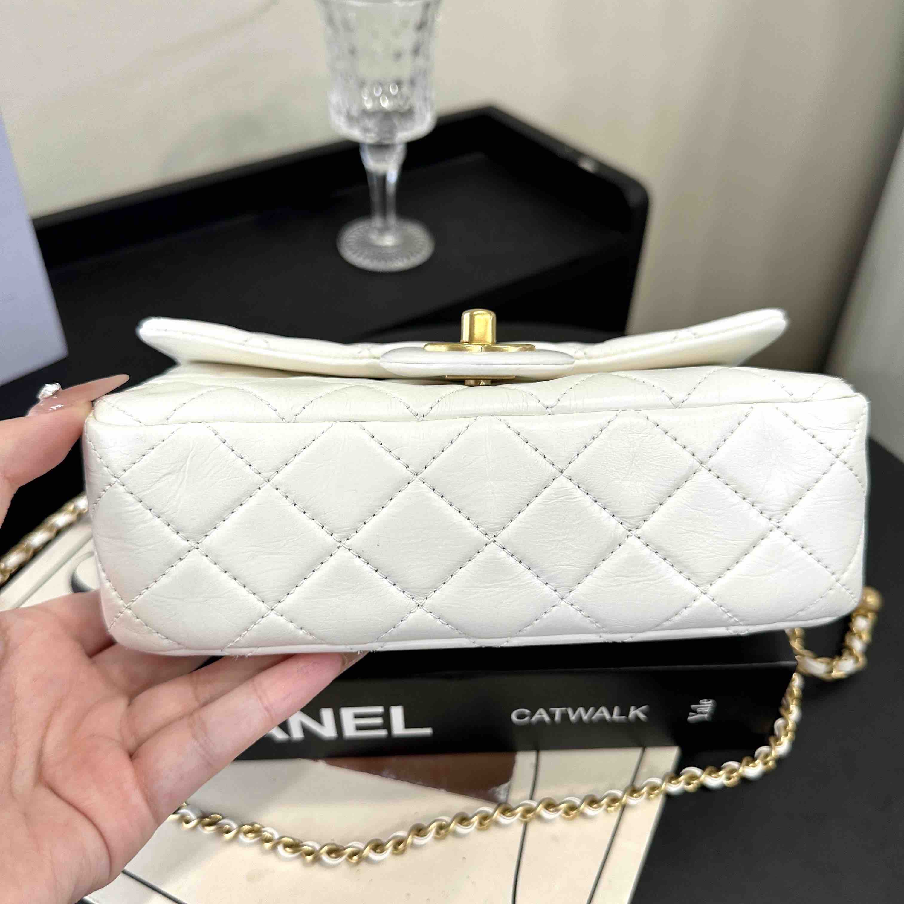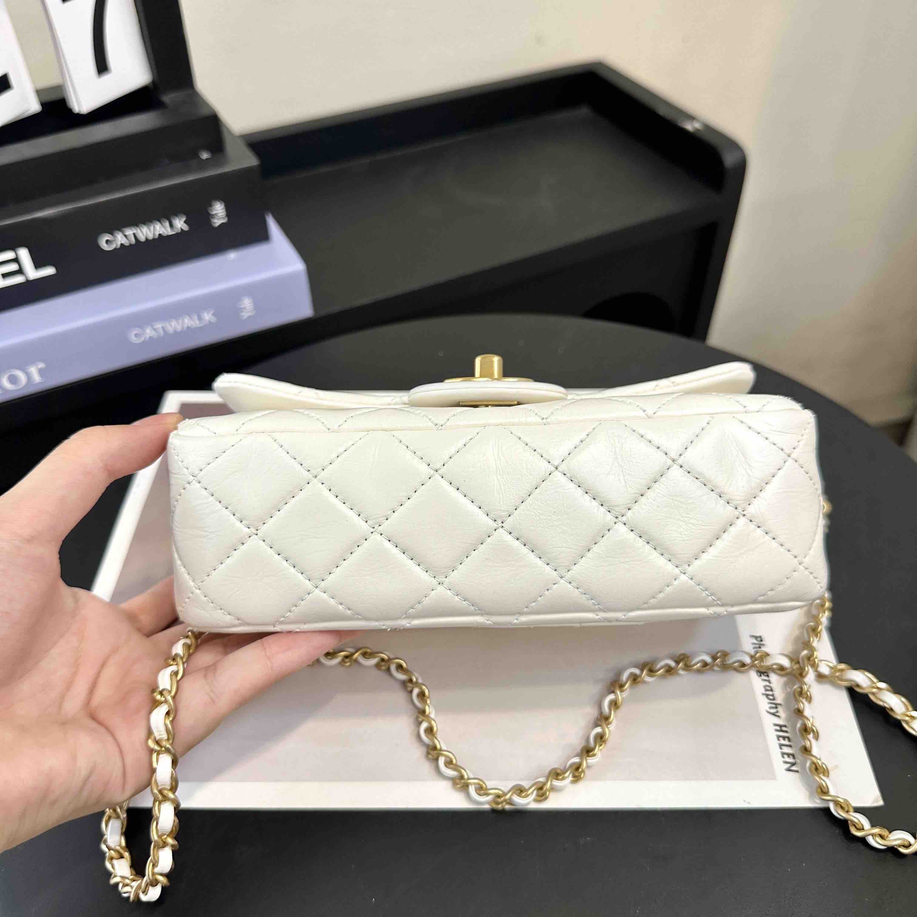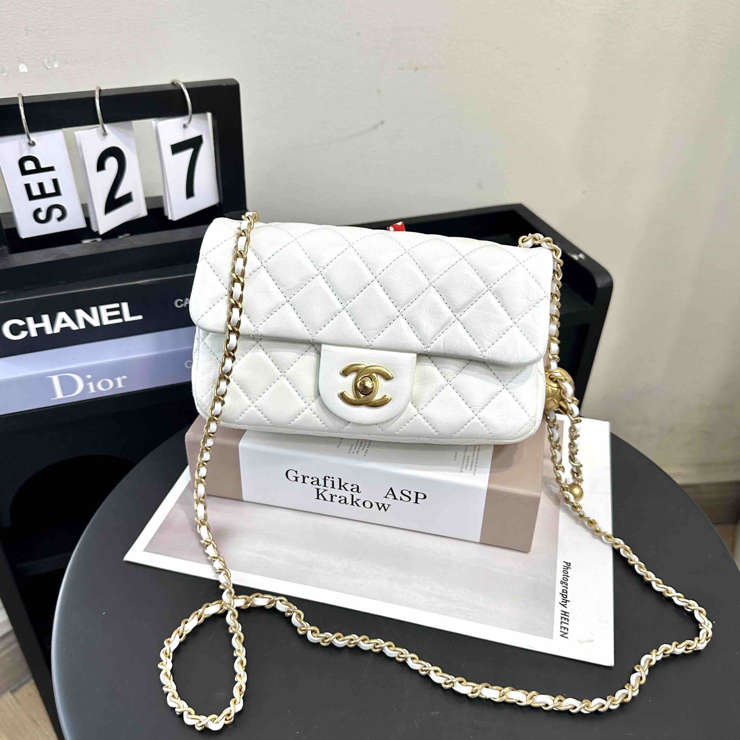 【商品详情】正品二手 Chanel 大mini 白色 金球 羊皮 斜挎包🧚🏻♀️95新 20×12 镭射30开 配件:防尘袋。包身已保养 状态较好