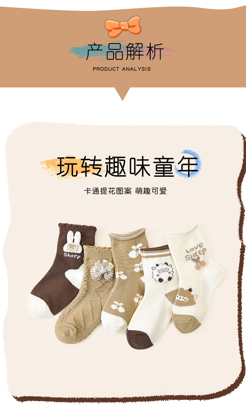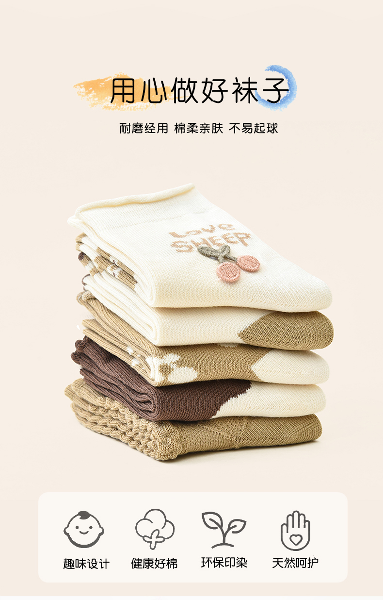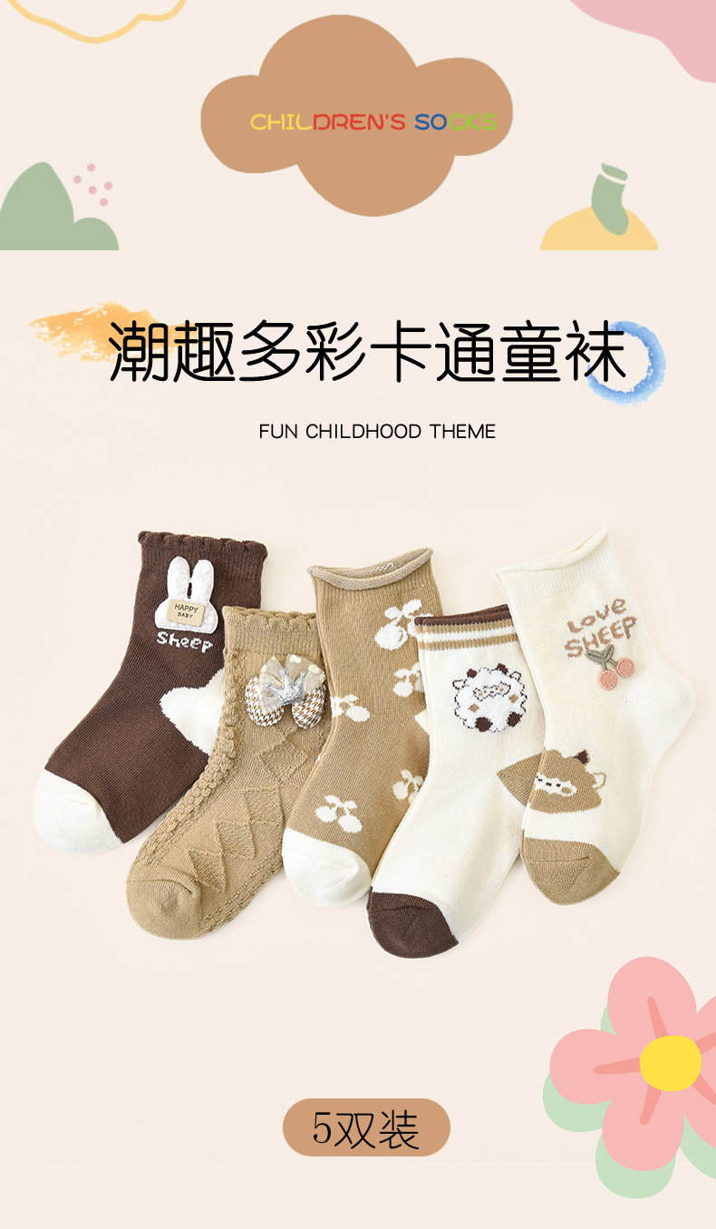 洁丽雅5双装童袜中筒袜子儿童袜新疆棉可爱印花亲肤柔软袜子韩系