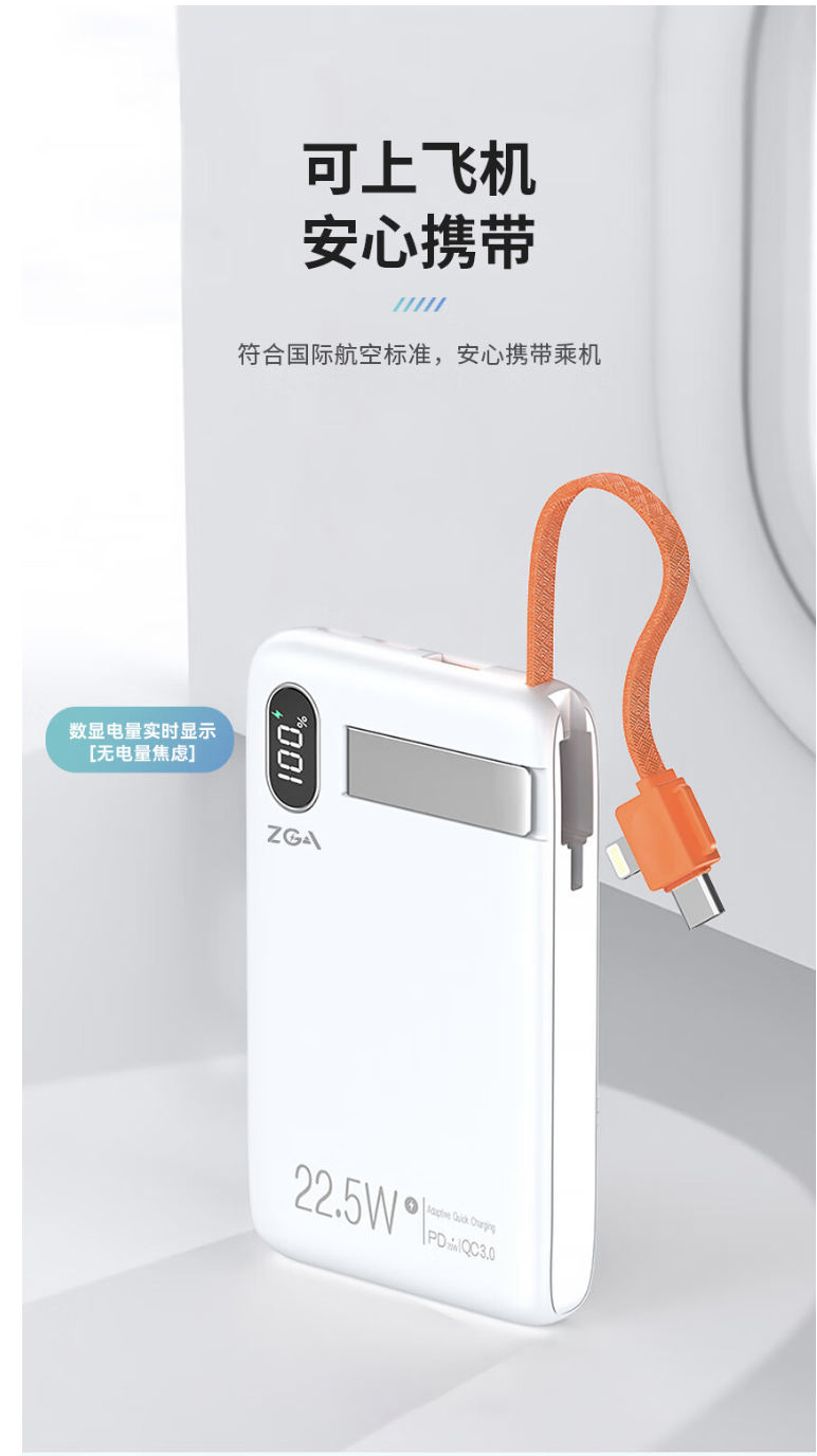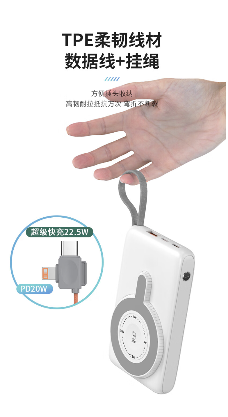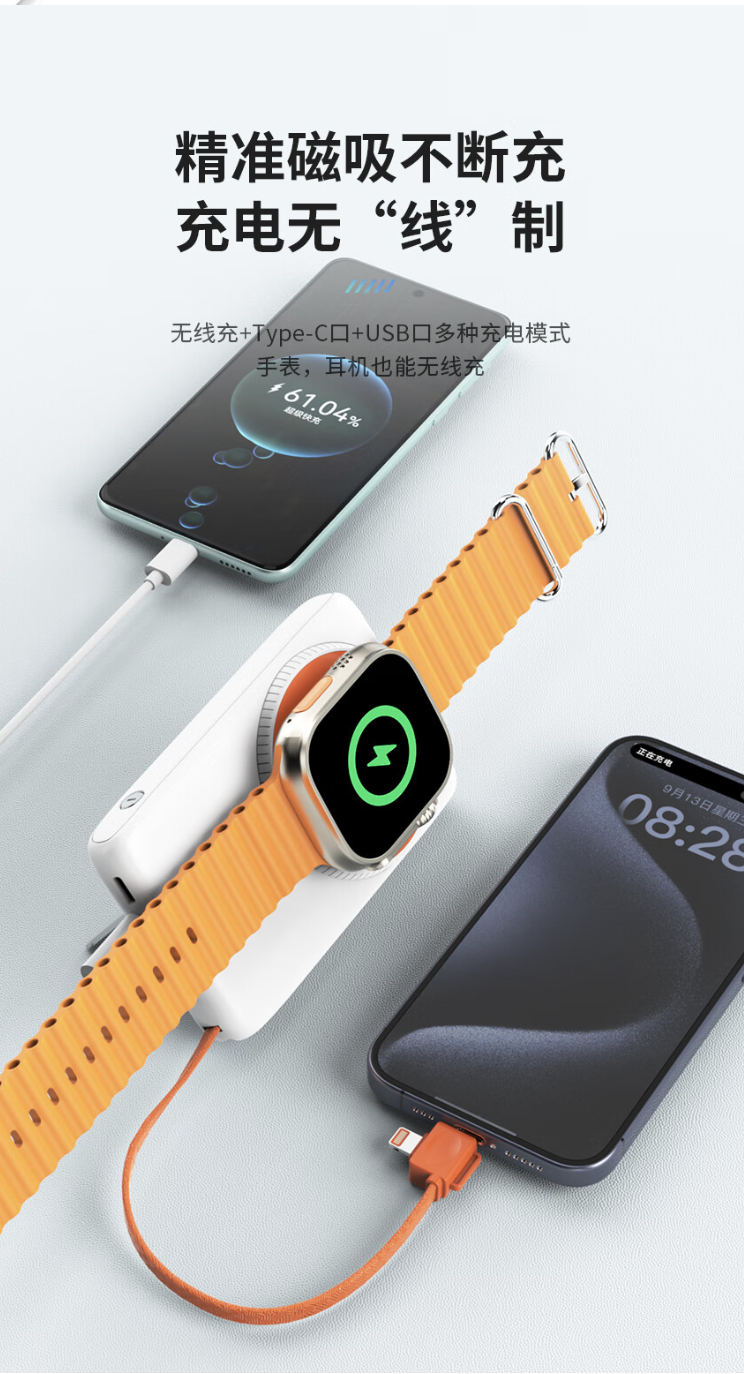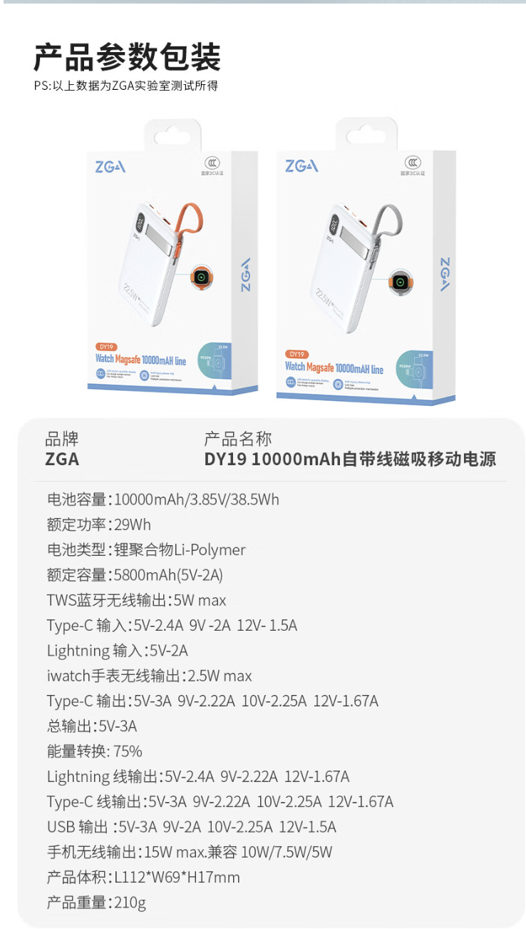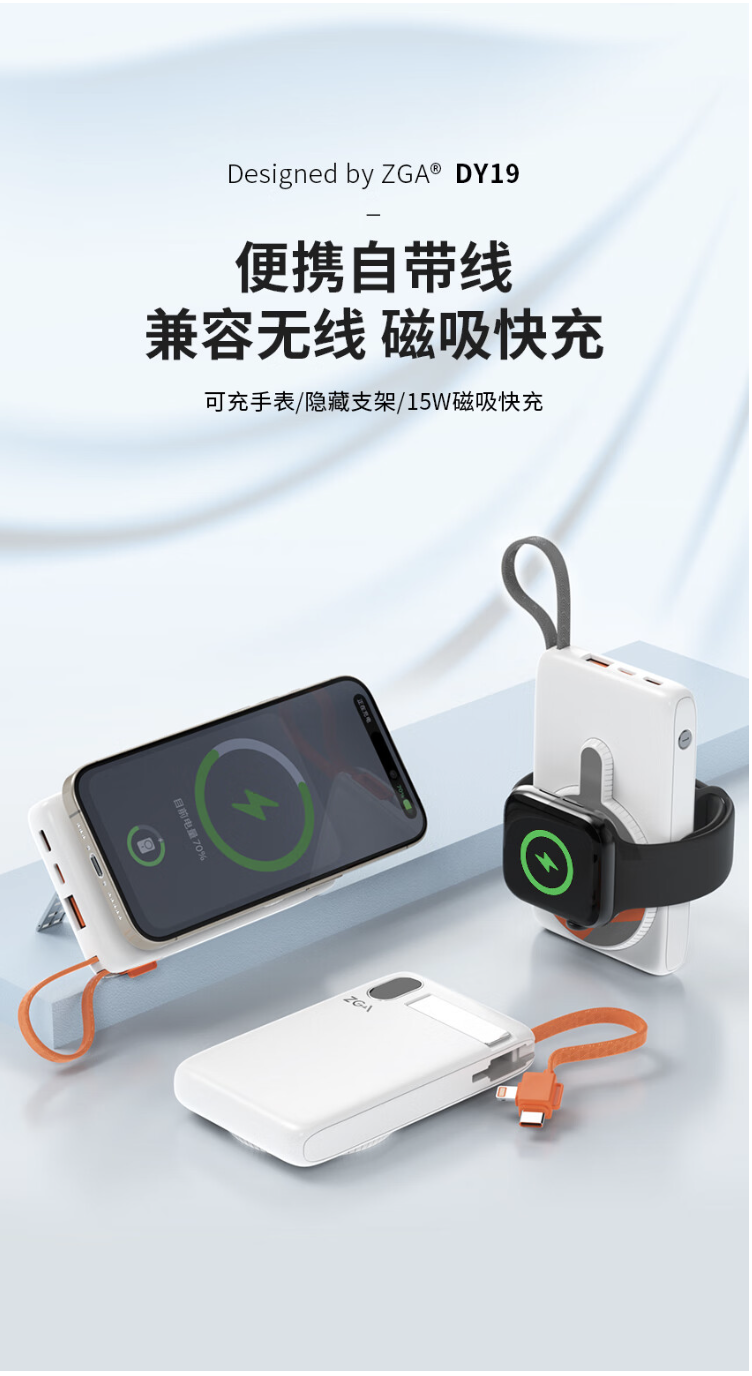 ZGA DY19 10000mAh自带线磁吸快充移动电源10000mAh大容量手表耳机手机充电快充