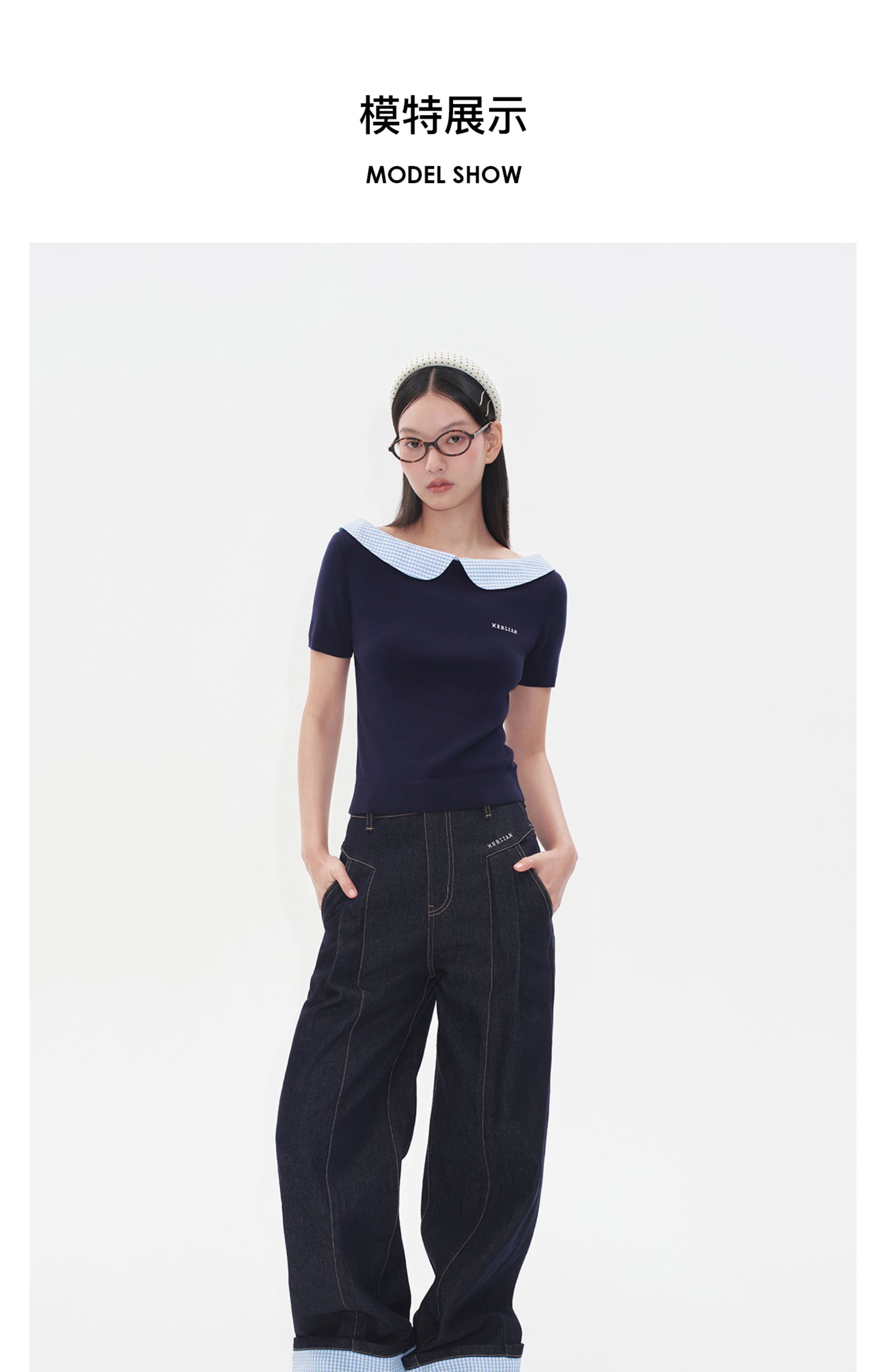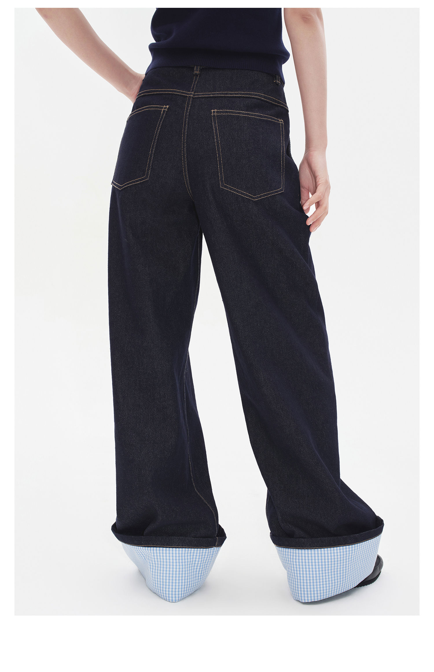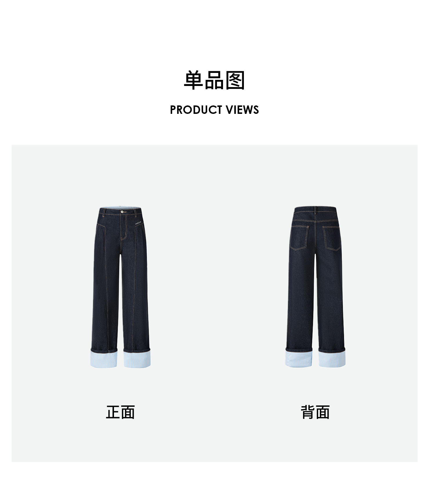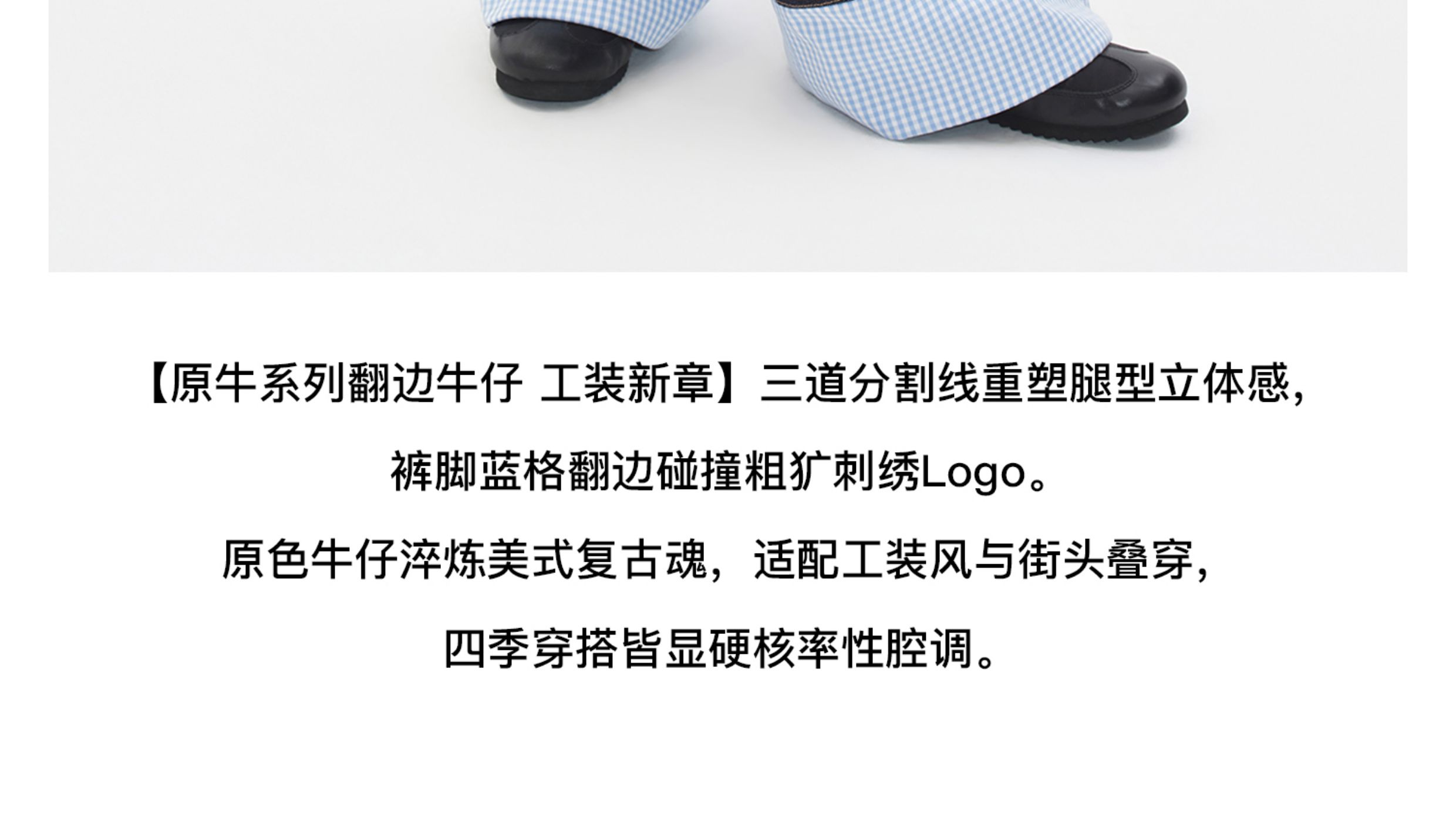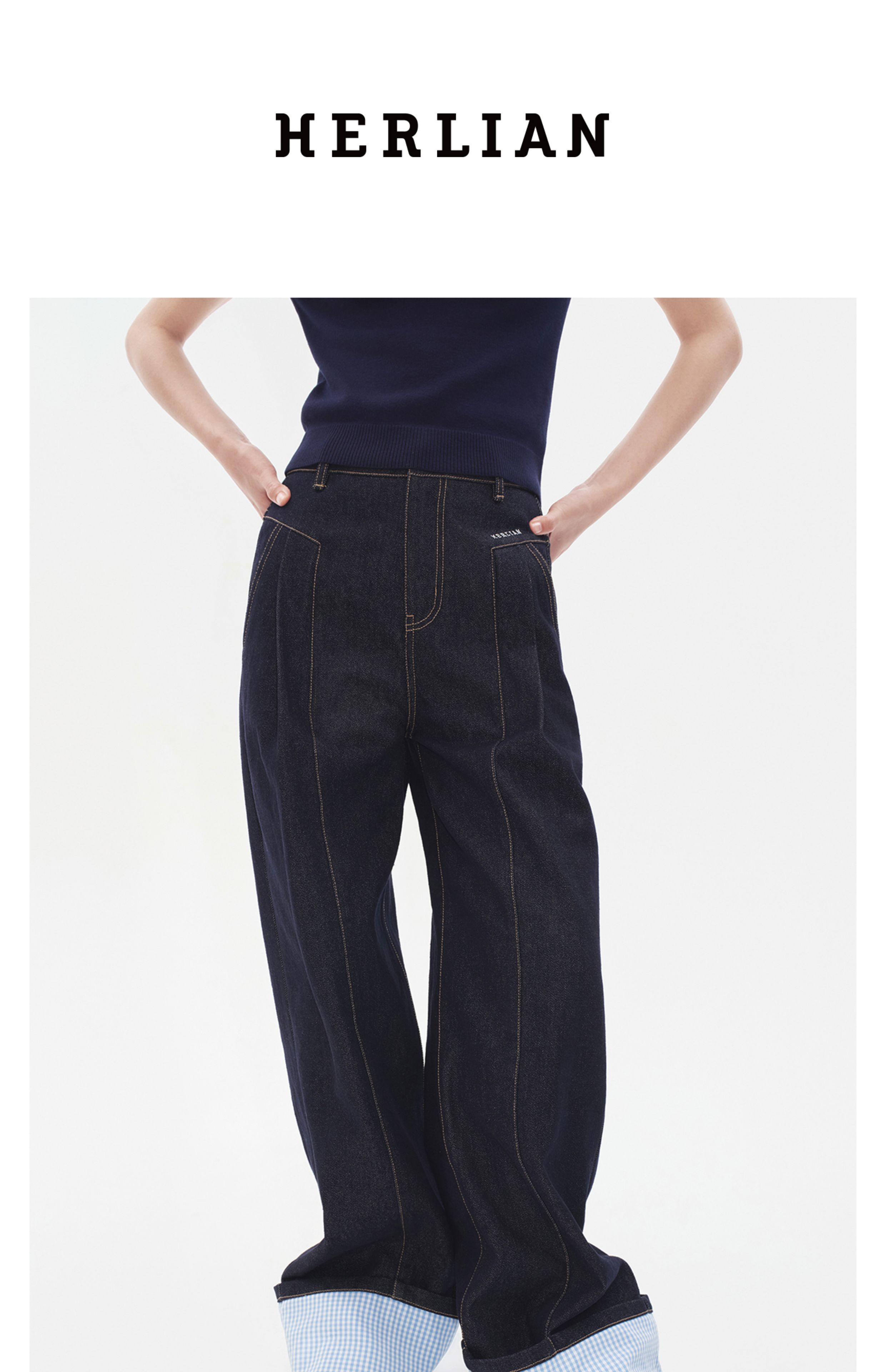 Herlian2025年秋季新品女士牛仔裤裤脚拼接格纹原牛色宽松休闲裤