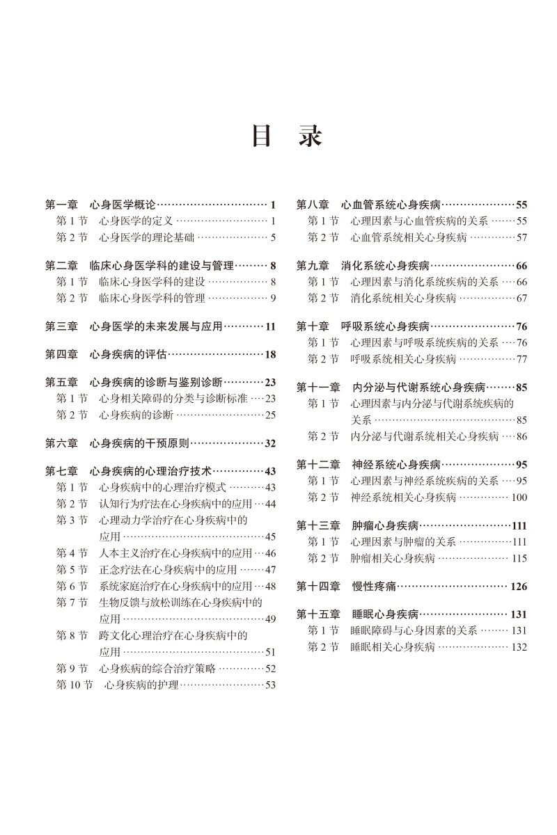 心身医学聚焦于探究心理与生理的相互关系,以及二者在疾病发生、发展和转归过程中的作用机制。本书内容涵盖心身医学的多个方面,从基础理论到临床实践,循序渐进。从心身医学的发展历程入手,剖析心理与生理的关系、神经内分泌免疫学等理论基础。随后围绕临床心身医学科的建设与管理、心身疾病的评估及相关检查、诊断及鉴别诊断、干预原则、心理治疗技术等方面进行了全面的阐述。后续章节针对心血管系统、消化系统、呼吸系统、内分泌与代谢系统、神经与肌肉系统、肿瘤、慢性疼痛、睡眠障碍等相关心身疾病,结合实际案例,详细介绍了其临床表现、心身因素的作用、诊断和治疗。