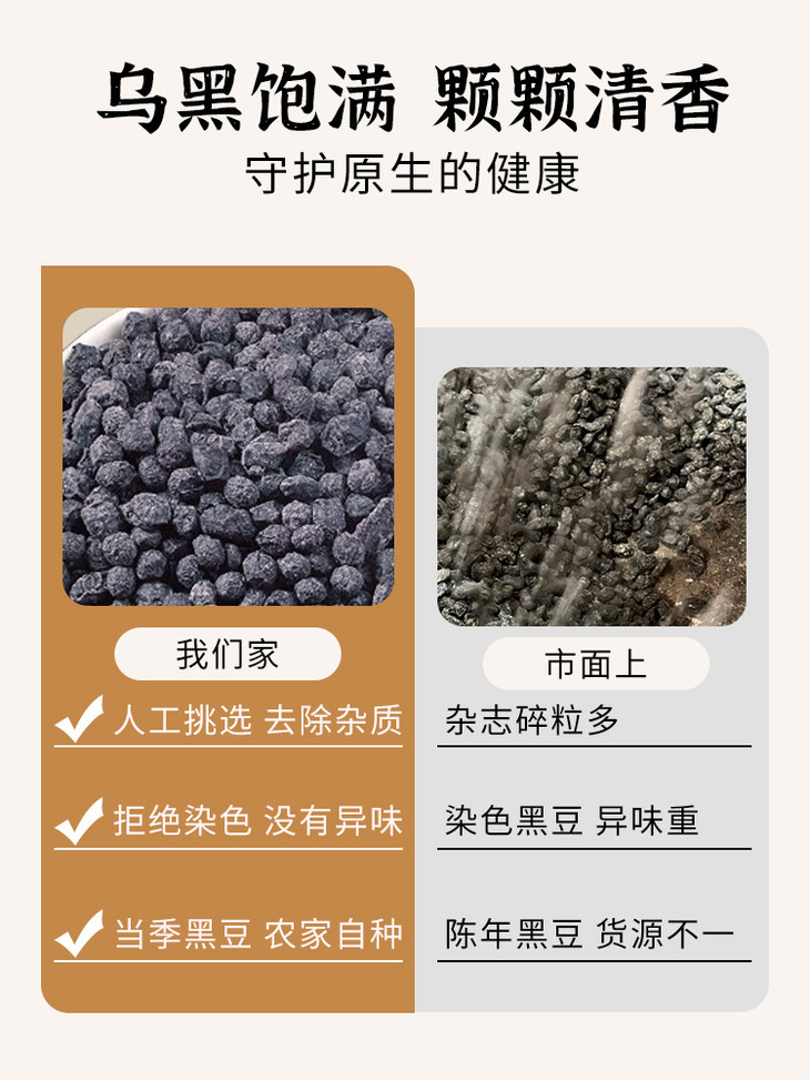 我们的选豆标准:人工挑选,去除杂质❌ 只留下大小均匀的好豆✅ 我们的黑豆掰开后芯是黄白色 选用当年新鲜采收的当季黑豆 不催熟不打农药🚫 保留最原始的营养和口感 比陈年老豆的蛋白质和花青素含量高30%以上📈