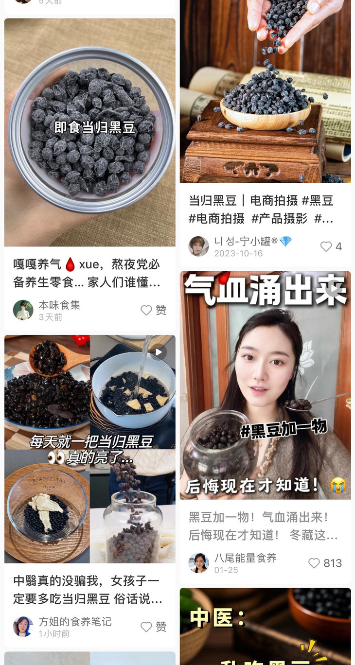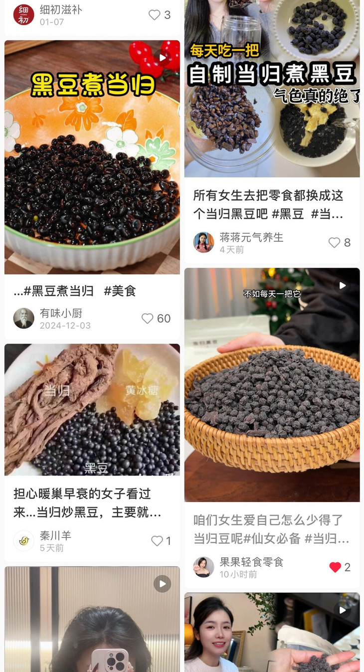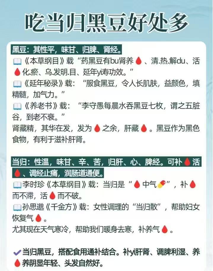当归和黑豆的搭配可不是随便凑的🤝 而是中医传承千年的经典养生方📜 咱们养生讲究先通后补🌿 当归就像气血疏通工,把瘀堵的气血打通 黑豆则是把流失的肾气、气血稳稳补上 一通一补,刚柔并济 完美避开上火和伤神的问题🤩