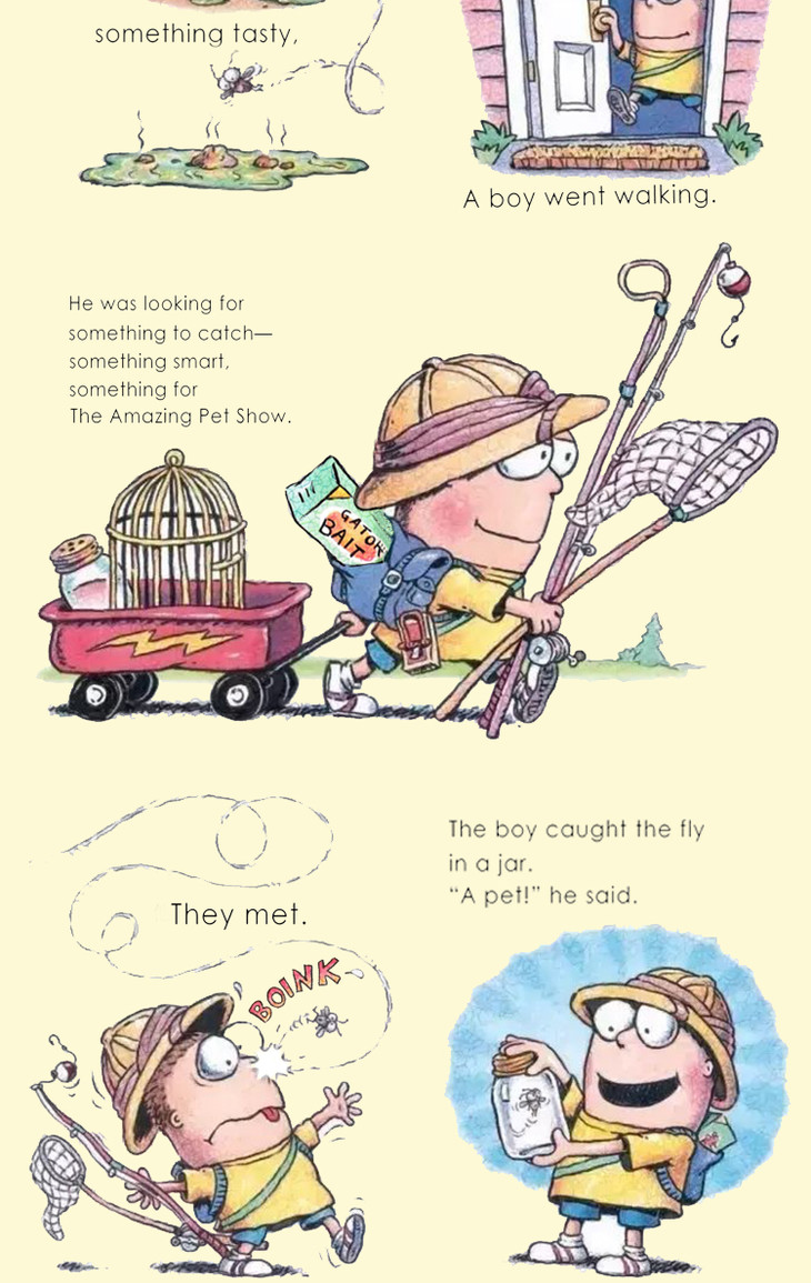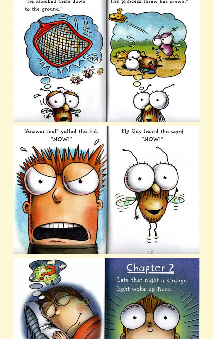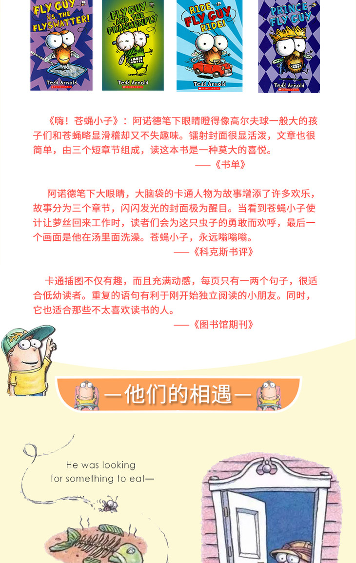 这套书吸引了成千上万的孩子,小读者们跟随着苍蝇小子的脚步,慢慢走进了这些活泼而有趣的故事。清晰明亮的图片周围有大量的空白,大号的文字非常利于阅读。简单易懂的句子,频繁的重复,让孩子们在幽默中提升了阅读技巧。