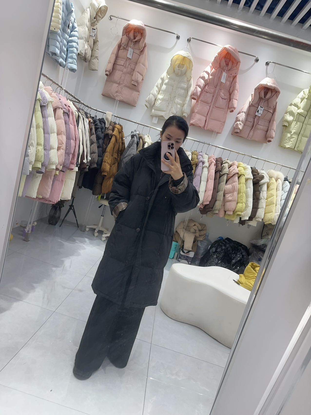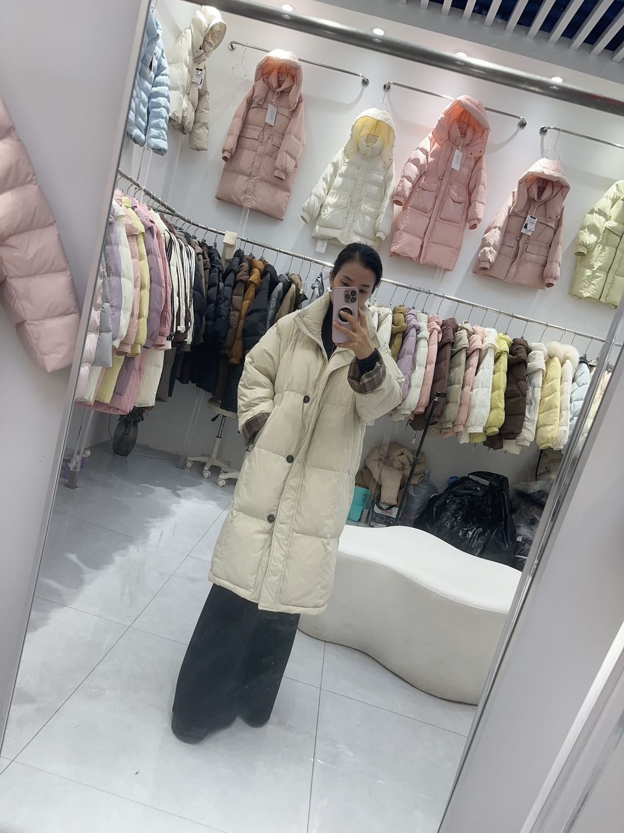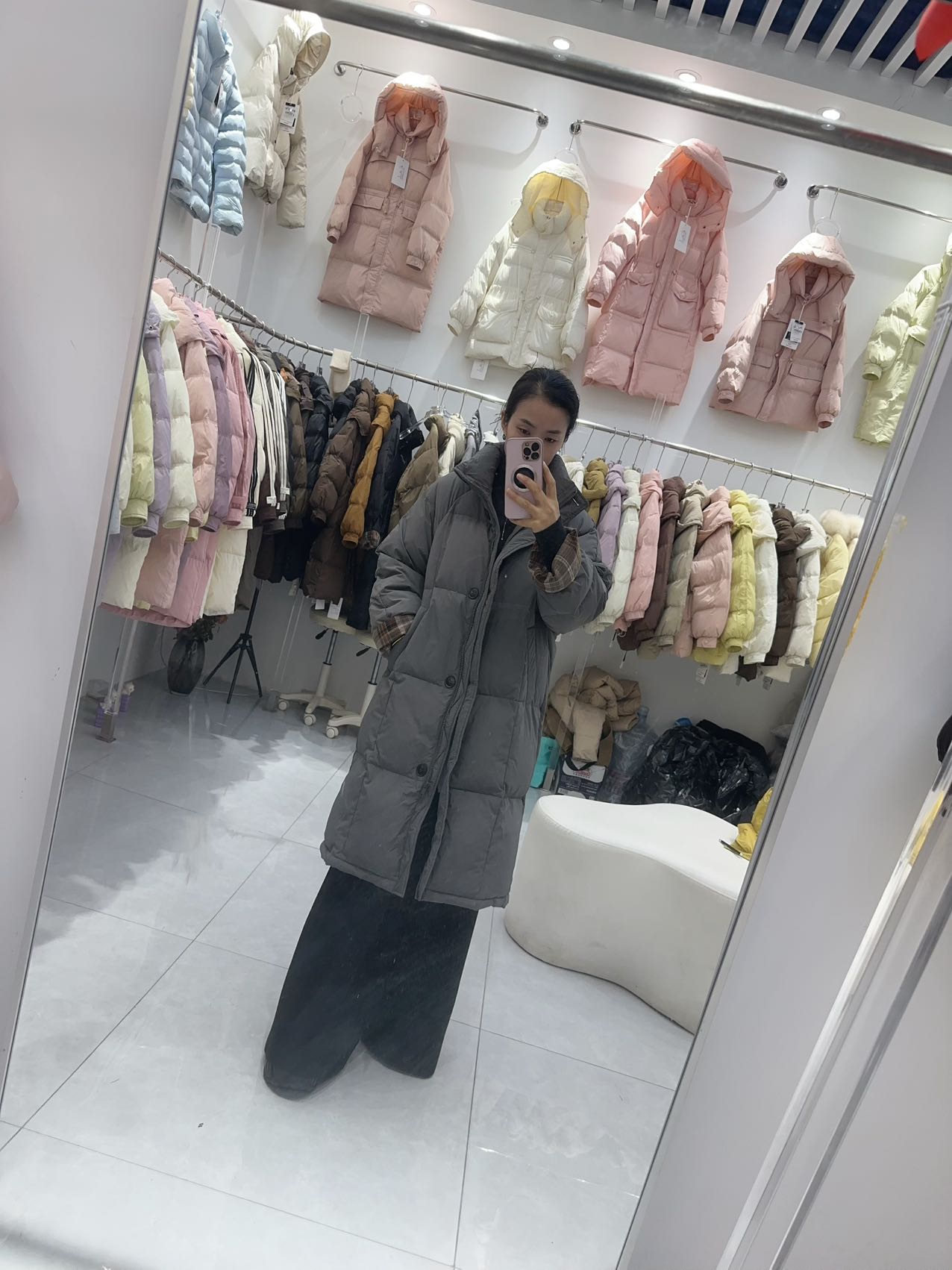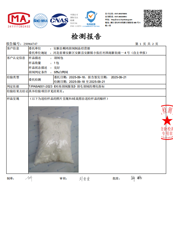胸围132 cm,衣长99 cm 绒子含量50%,充绒量90%,280克左右