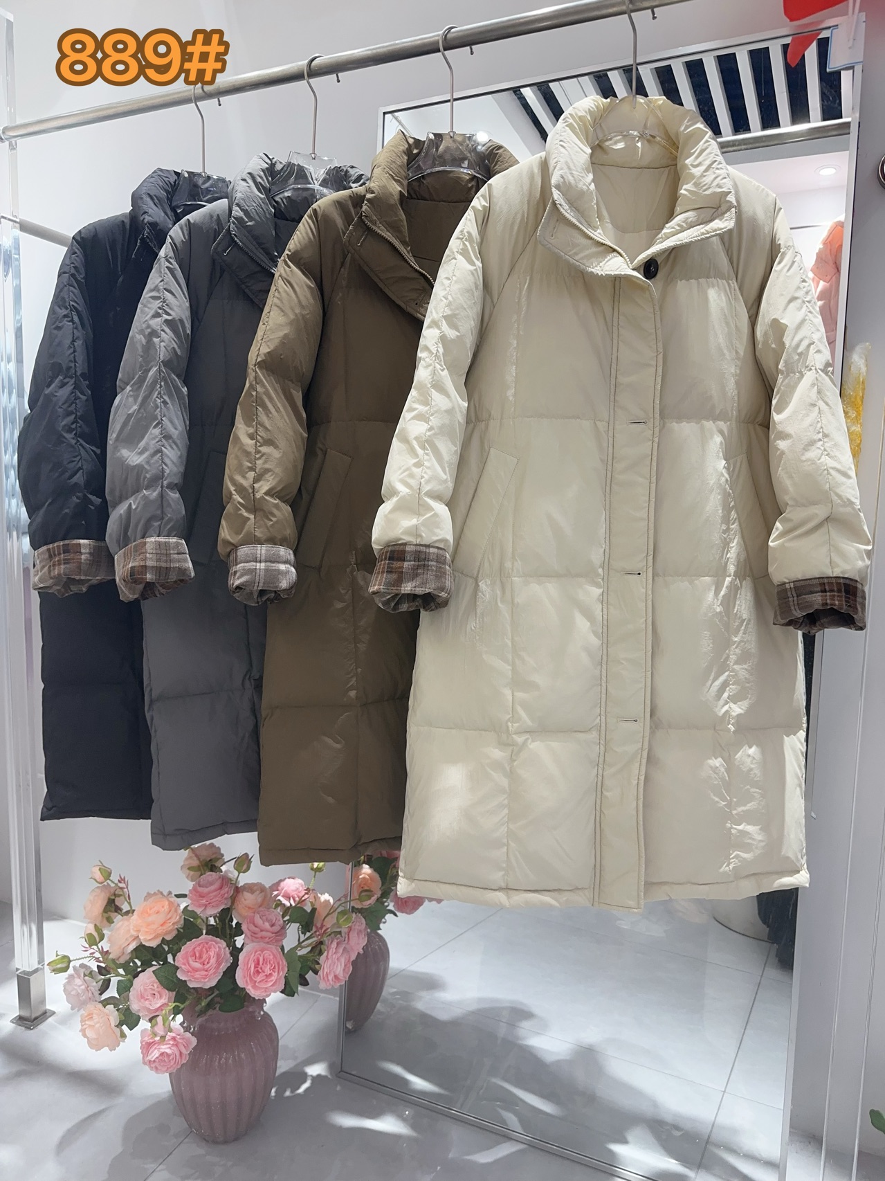 【YW】无忧购格纹50%白鸭绒立领中长款单排扣休闲加厚羽绒服女889#
