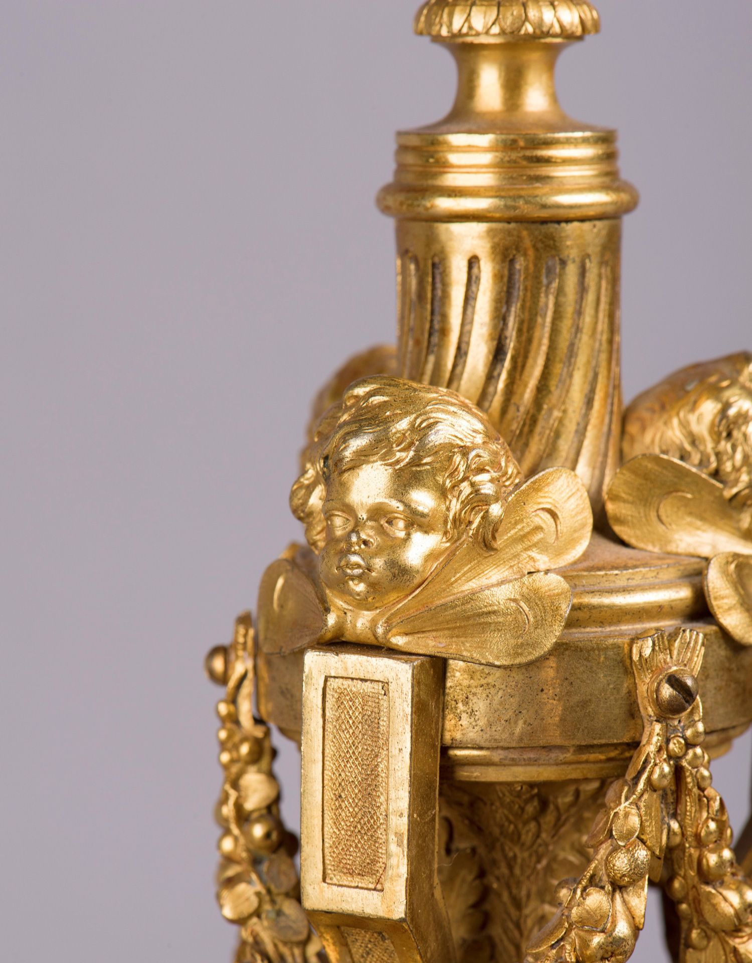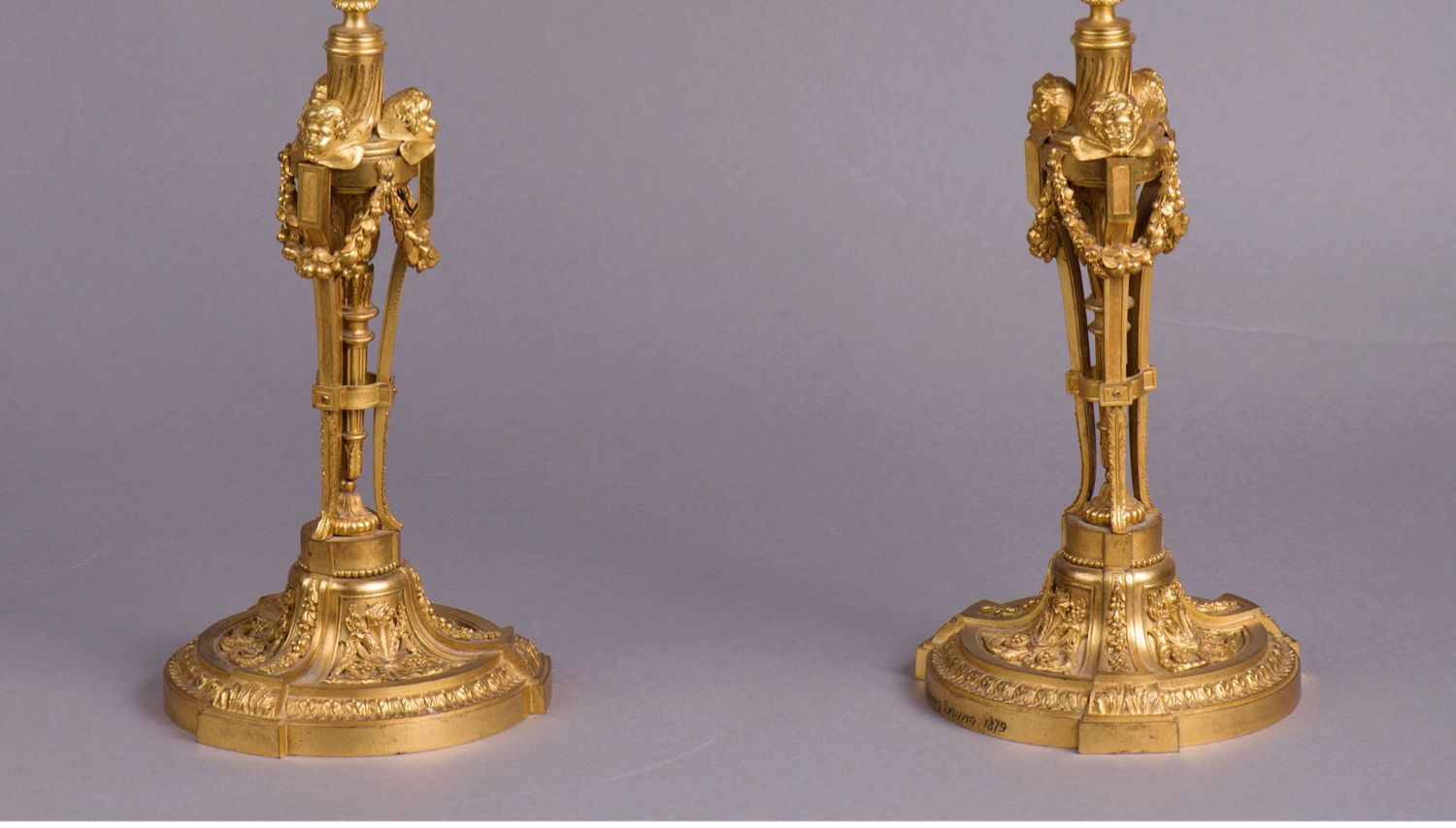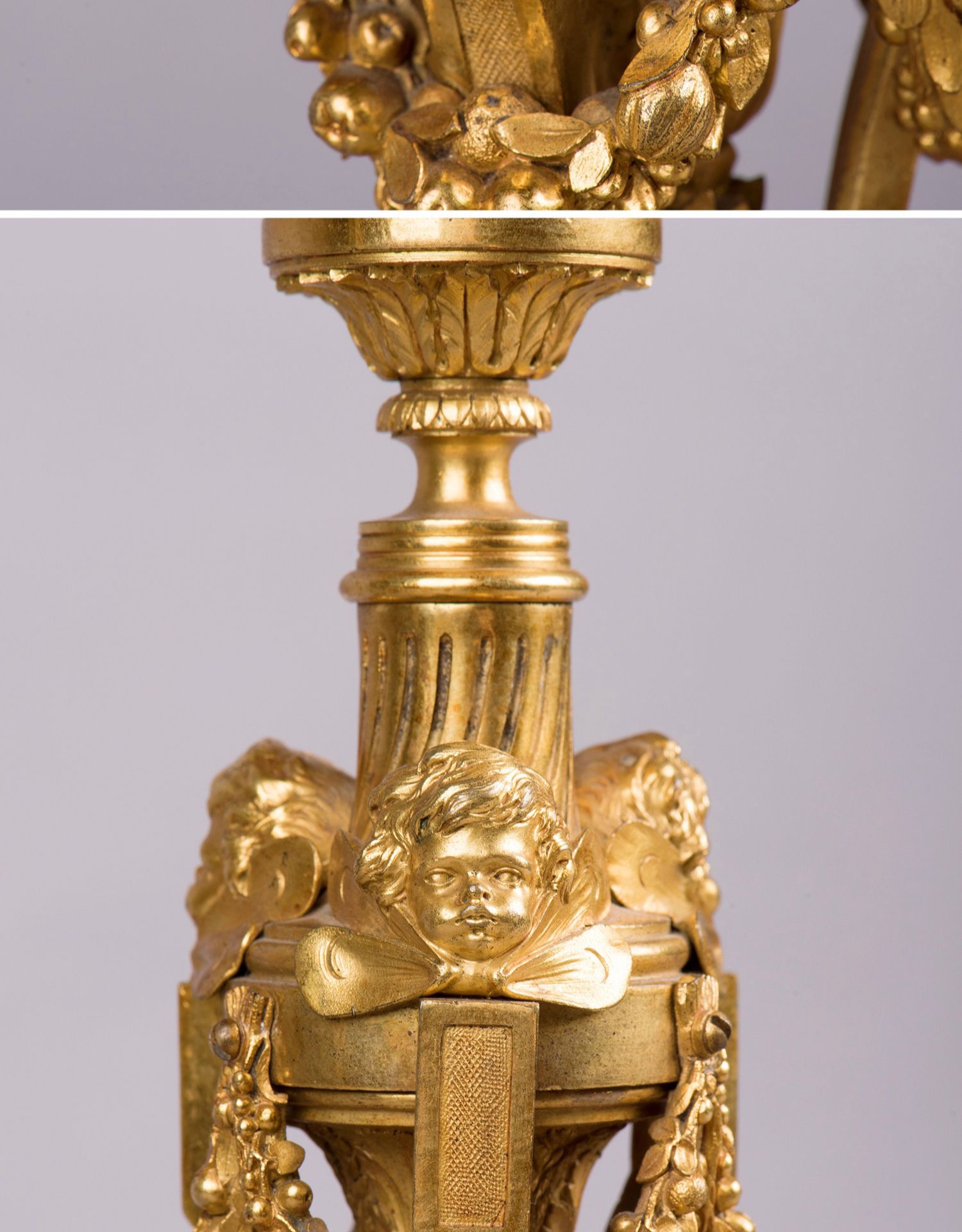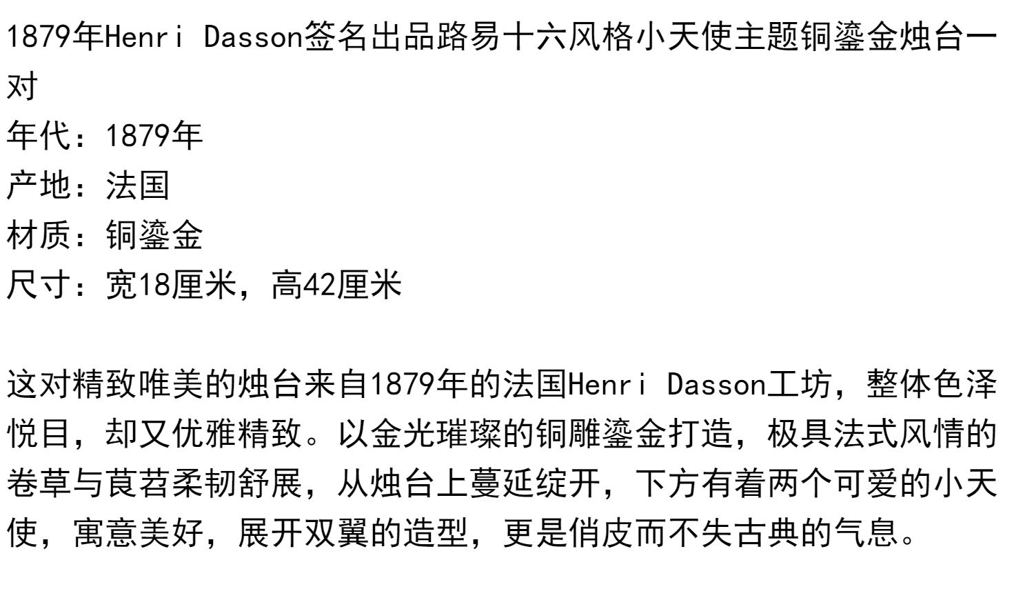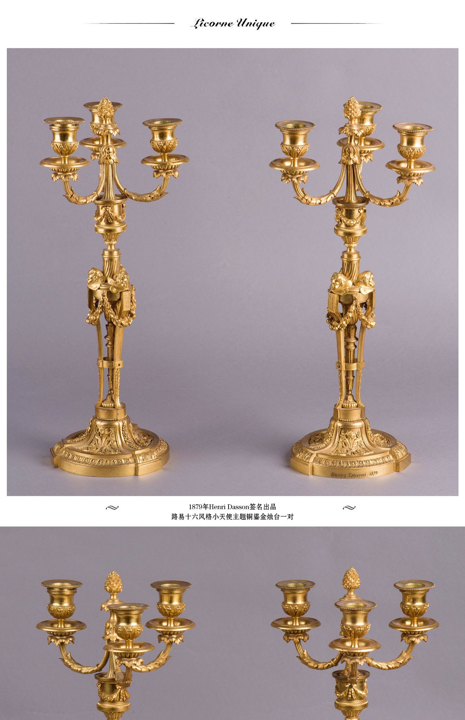 独角鹿西洋古董摆件法国工坊签名路易十六风小天使铜鎏金烛台一对