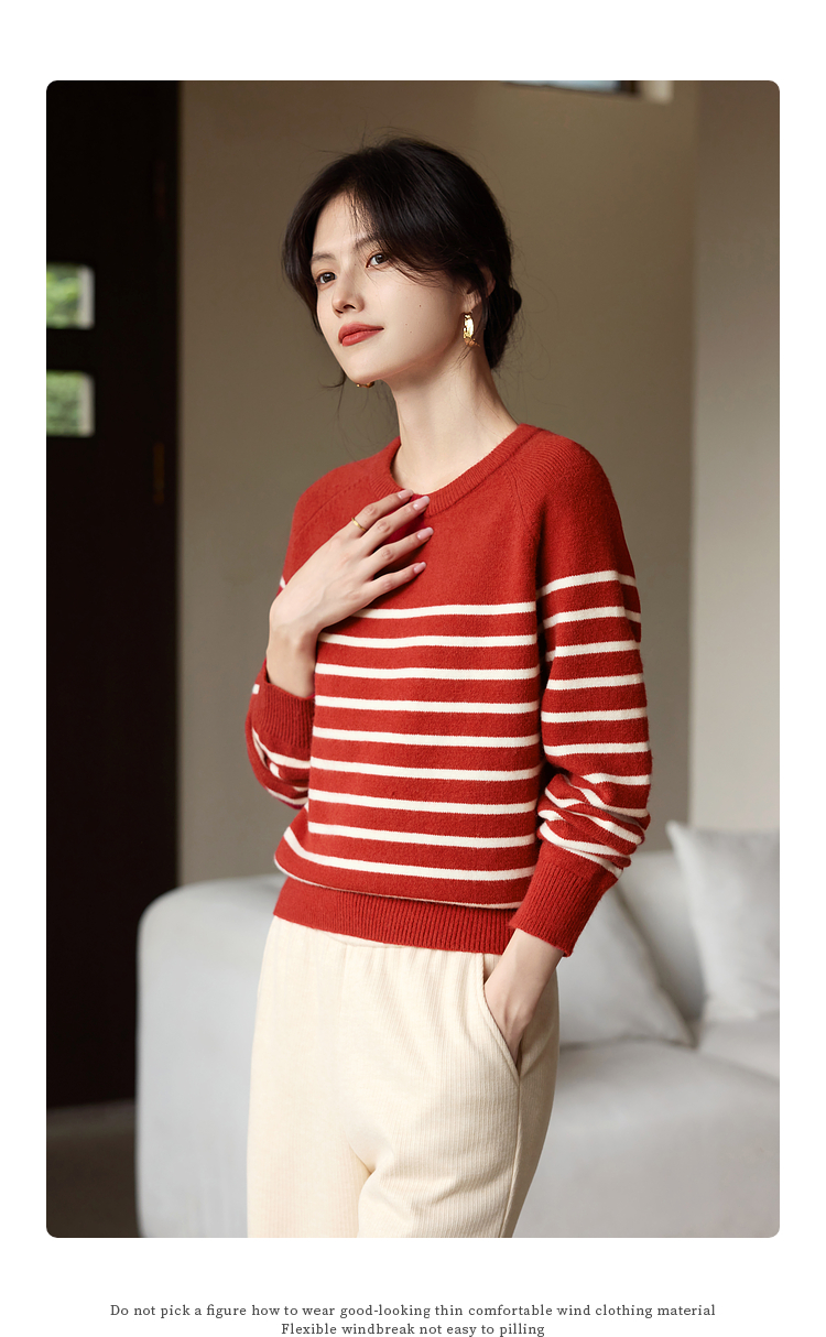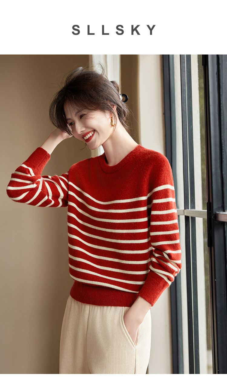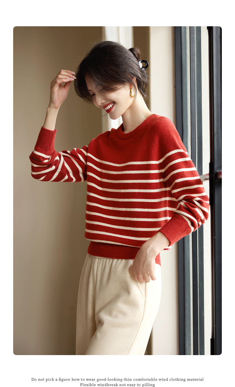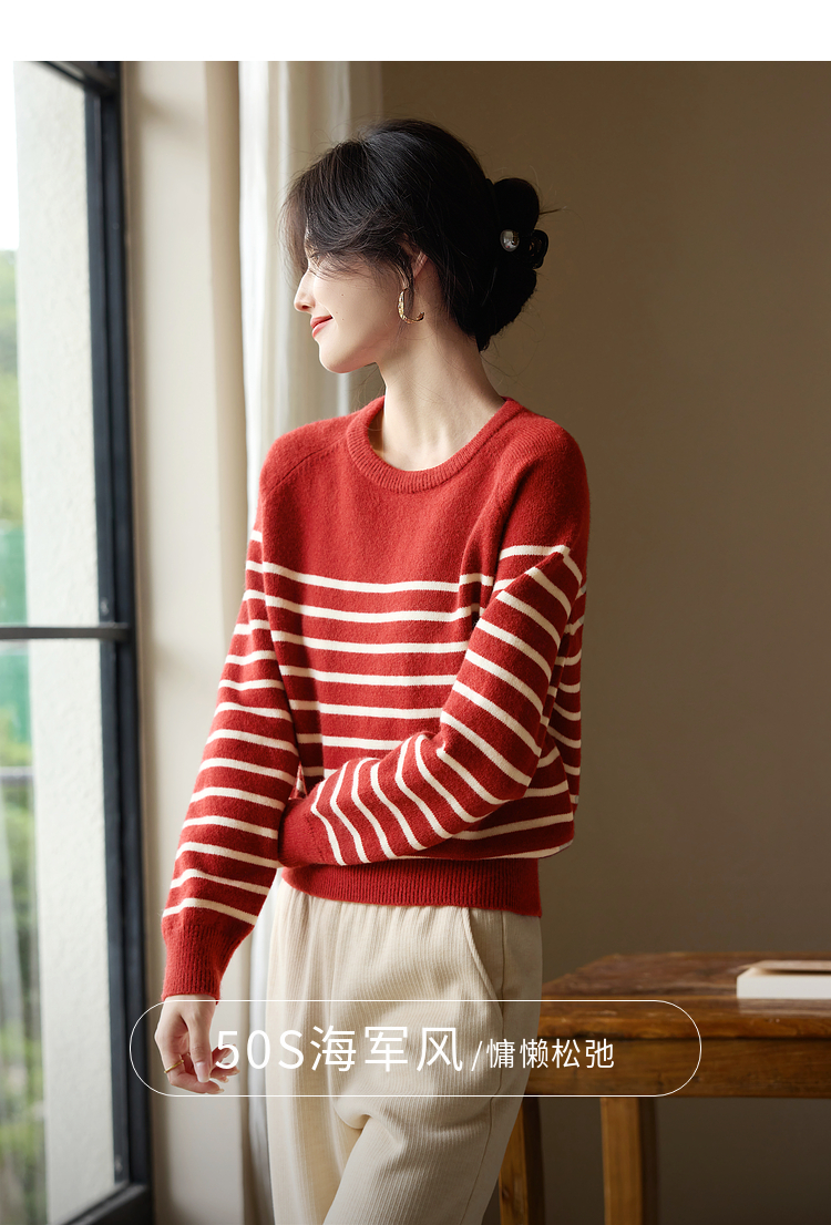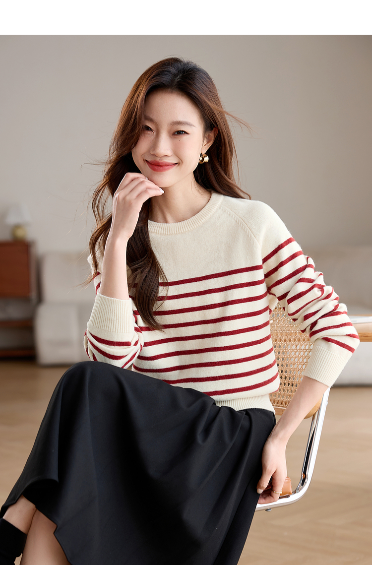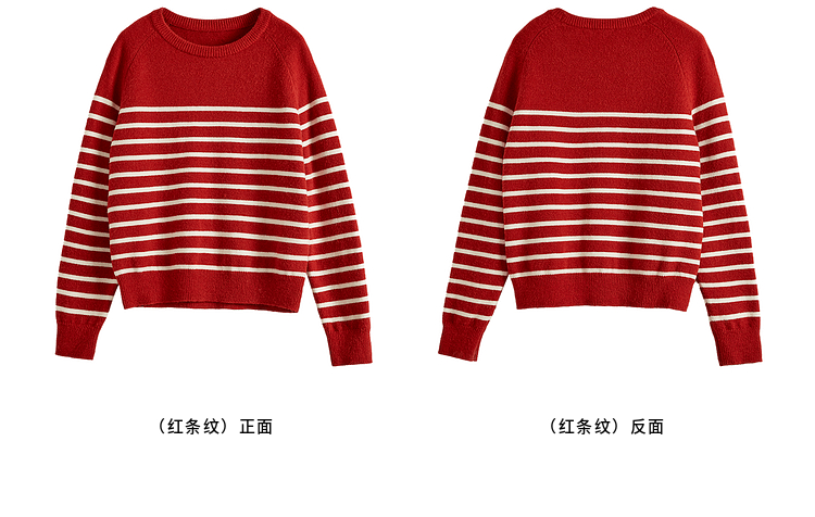 【年终特卖】熙世界红色条纹毛衣女秋冬2025新款慵懒风宽松撞色圆领打底针织衫