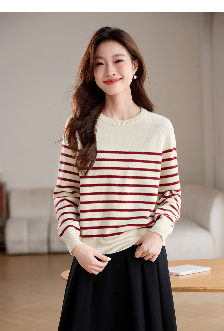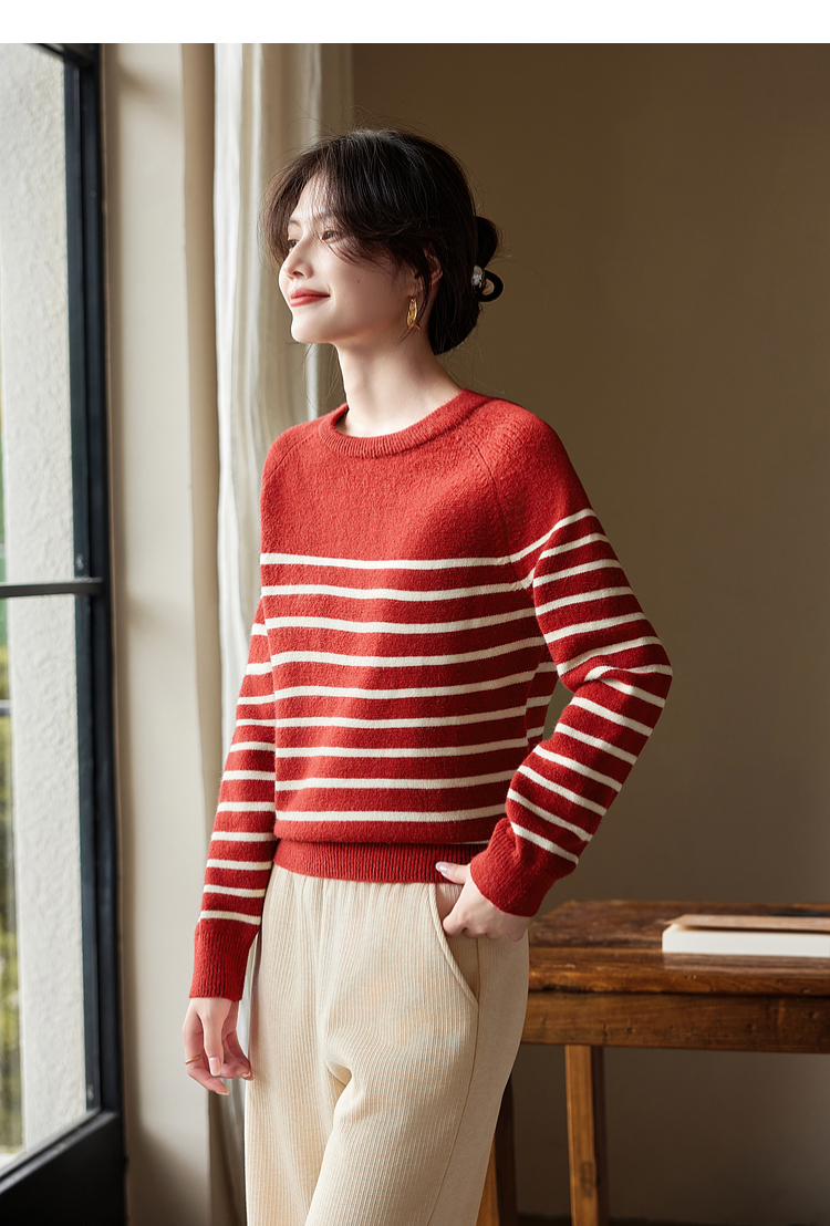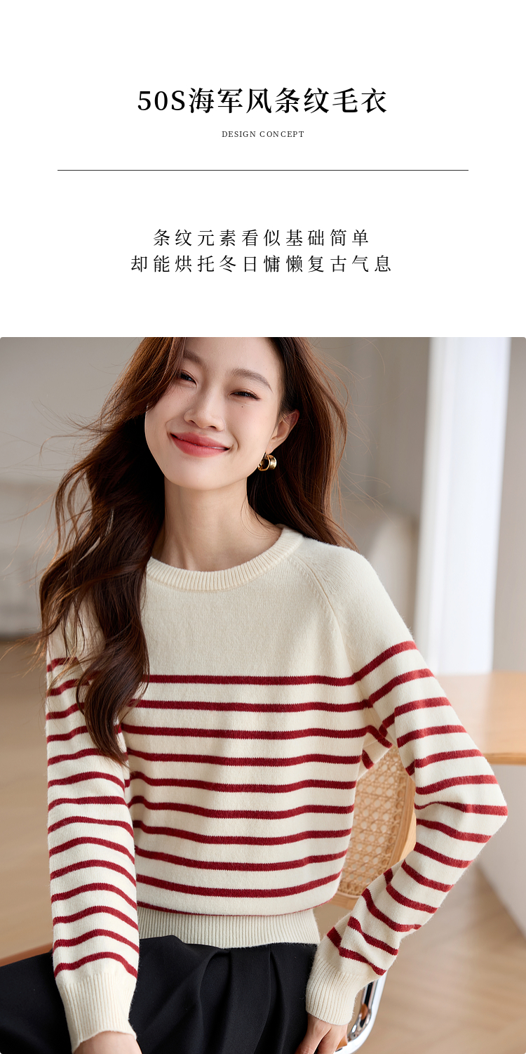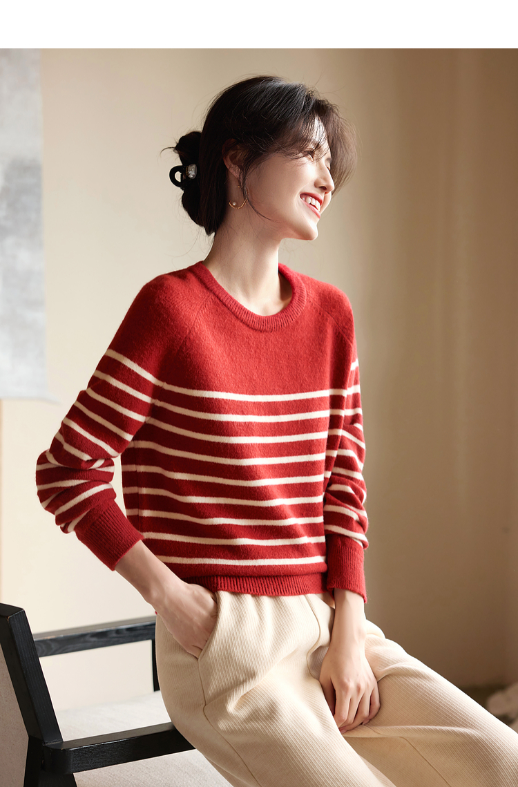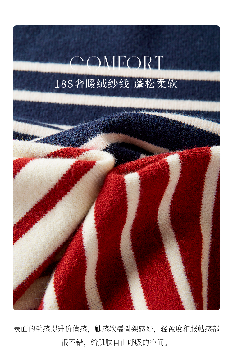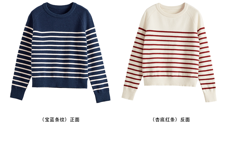 【年终特卖】熙世界红色条纹毛衣女秋冬2025新款慵懒风宽松撞色圆领打底针织衫