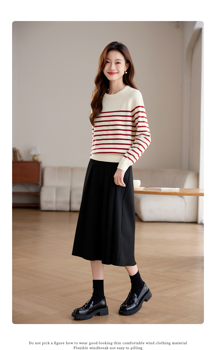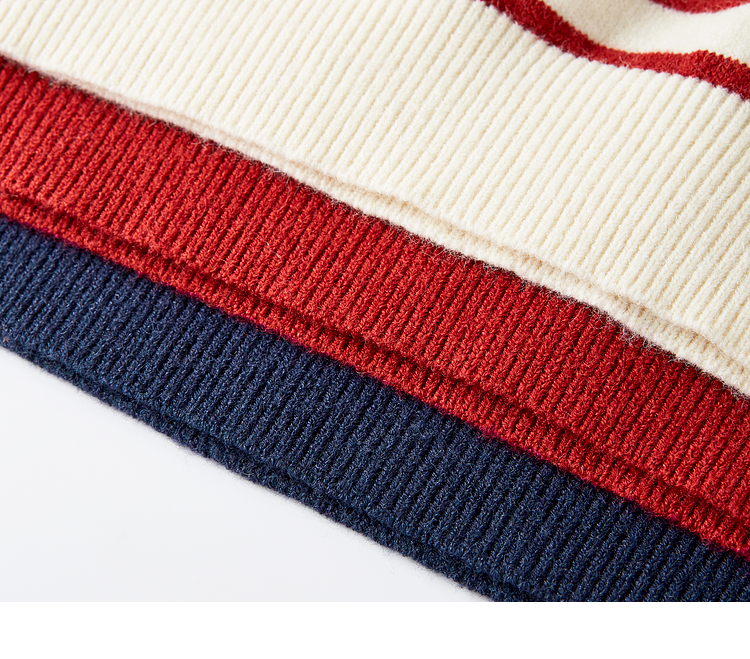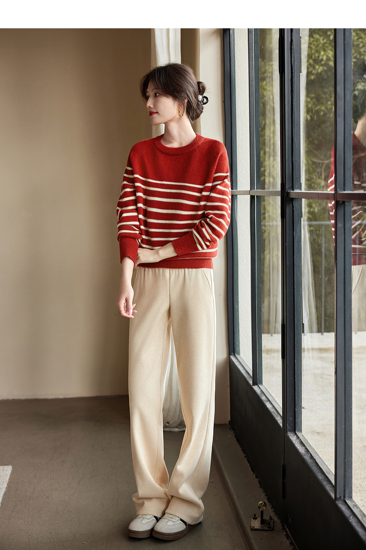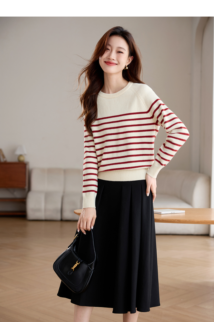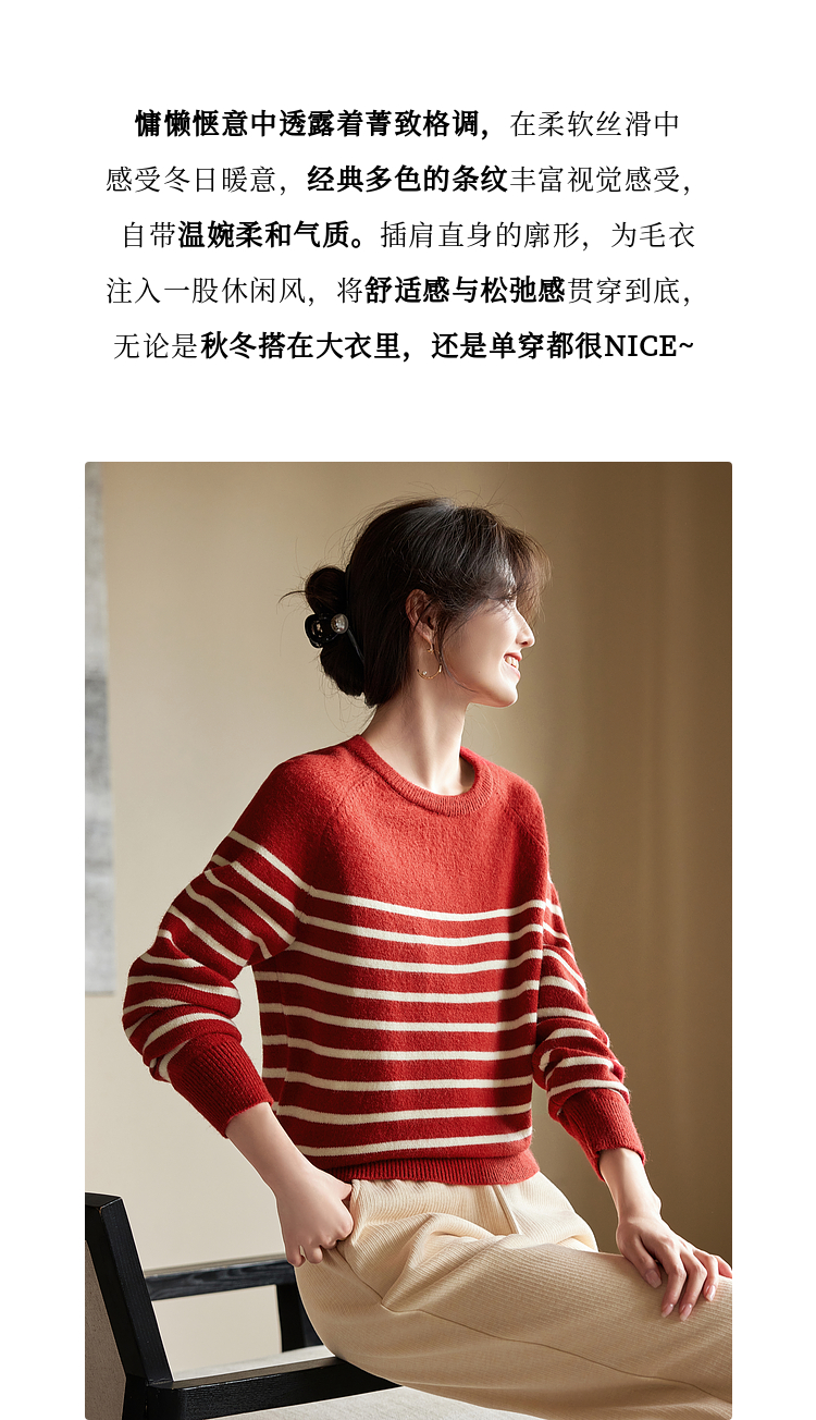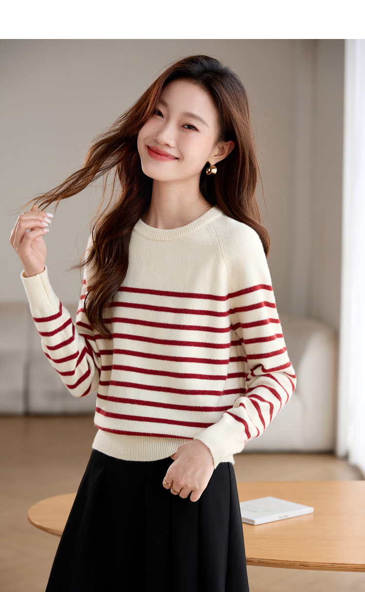 【年终特卖】熙世界红色条纹毛衣女秋冬2025新款慵懒风宽松撞色圆领打底针织衫