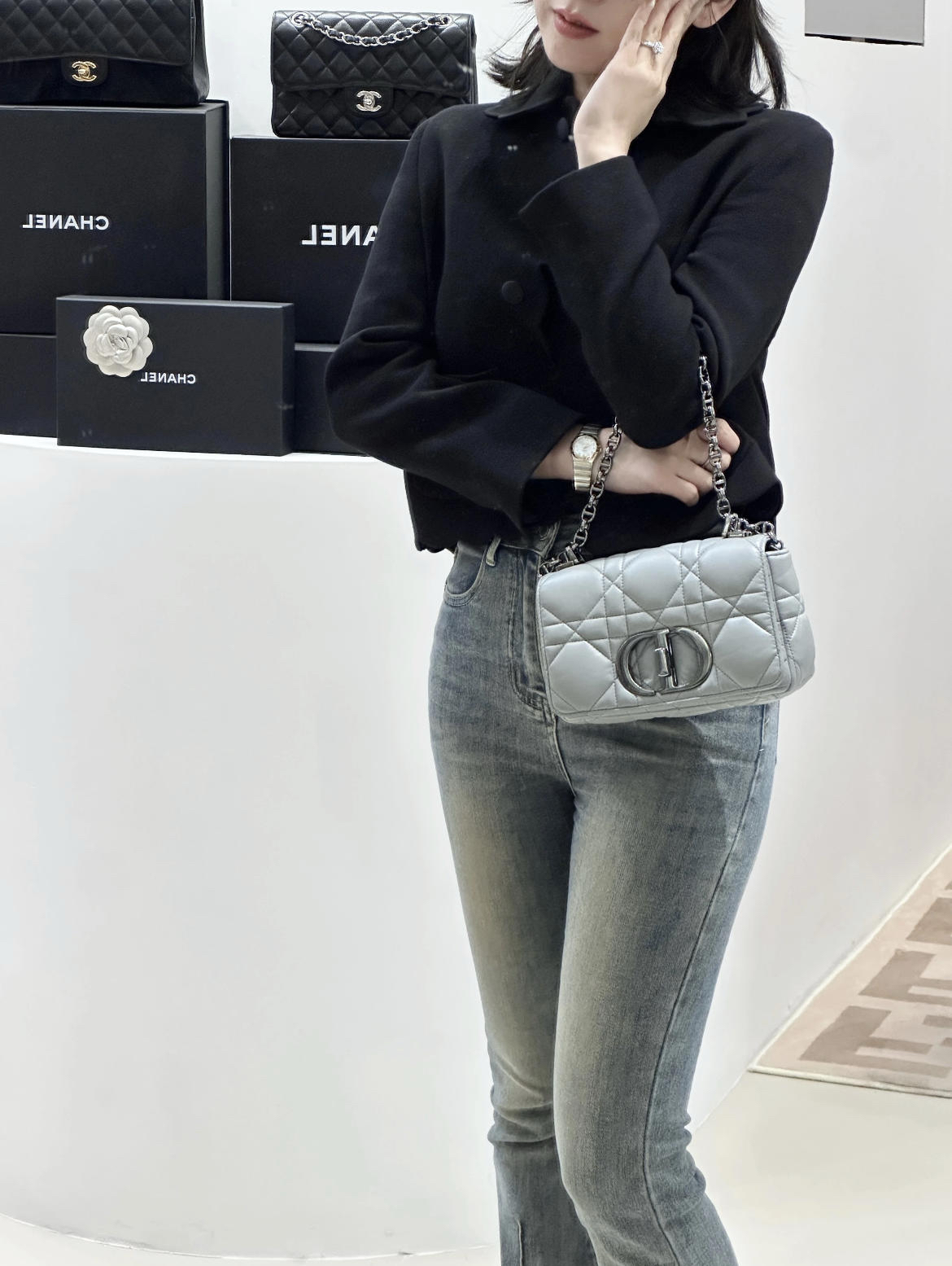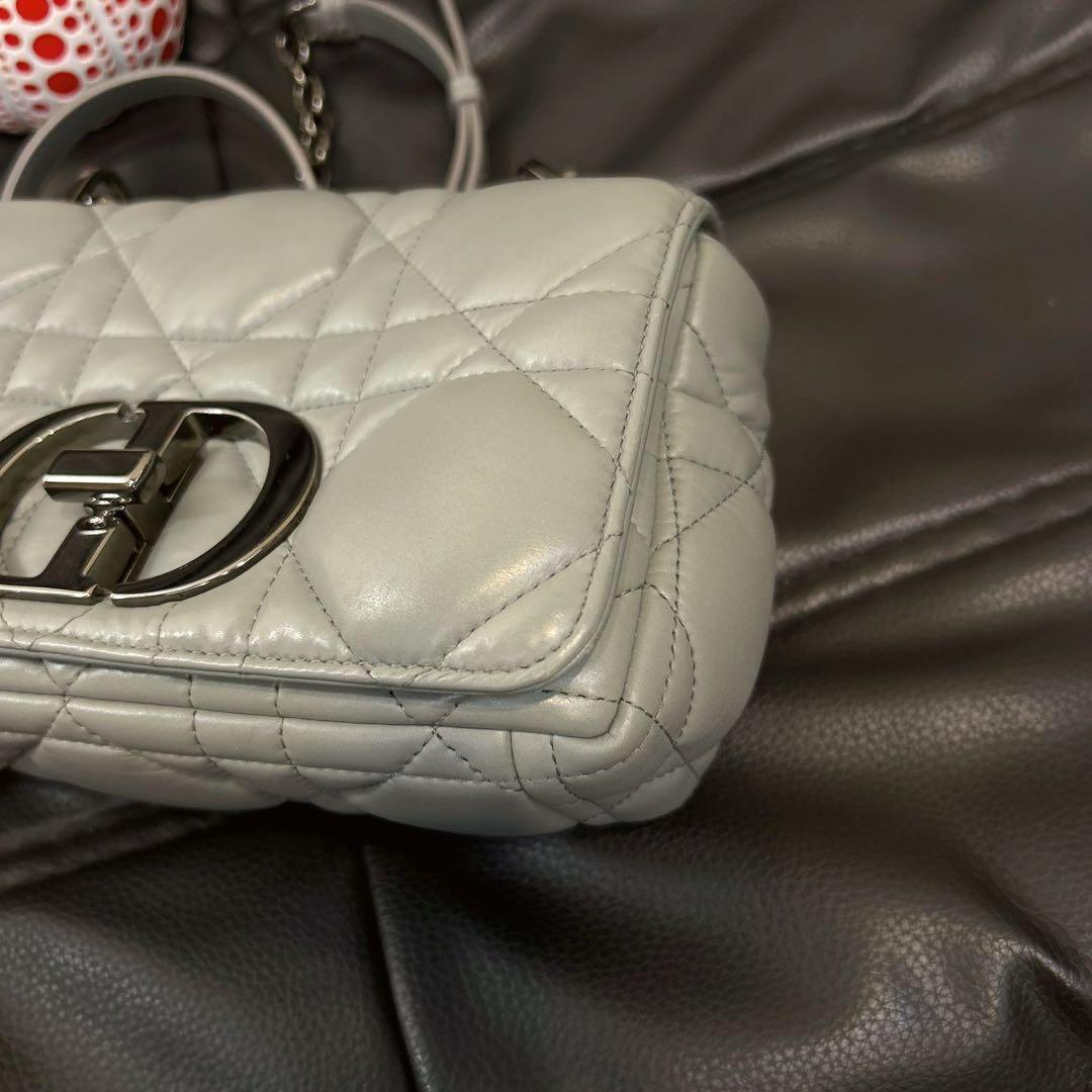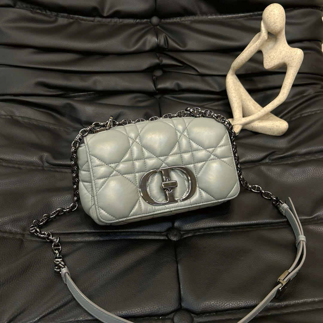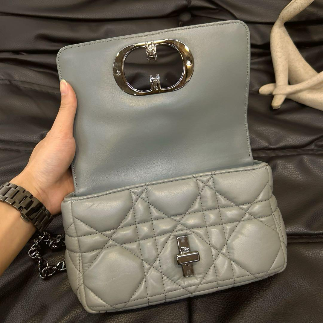 【商品详情】正品二手 Dior 小号 灰色 菱格 羊皮羽绒 斜挎包🍊97新 20*11。翻盖角有微微摩擦感 包背部有一处小污渍。梦中情包