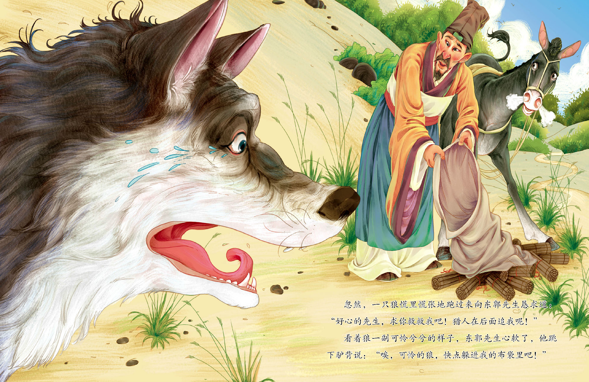 东郭先生外出讲学时遇到一只逃亡的狼。狼装作软弱可怜的样子,迷惑了糊涂、迂腐的东郭先生,求得他的庇护。等到危险一过,狼又立刻露出凶狠吃人的本性。幸好一位机智的农夫及时搭救,东郭先生才幸免于难。
