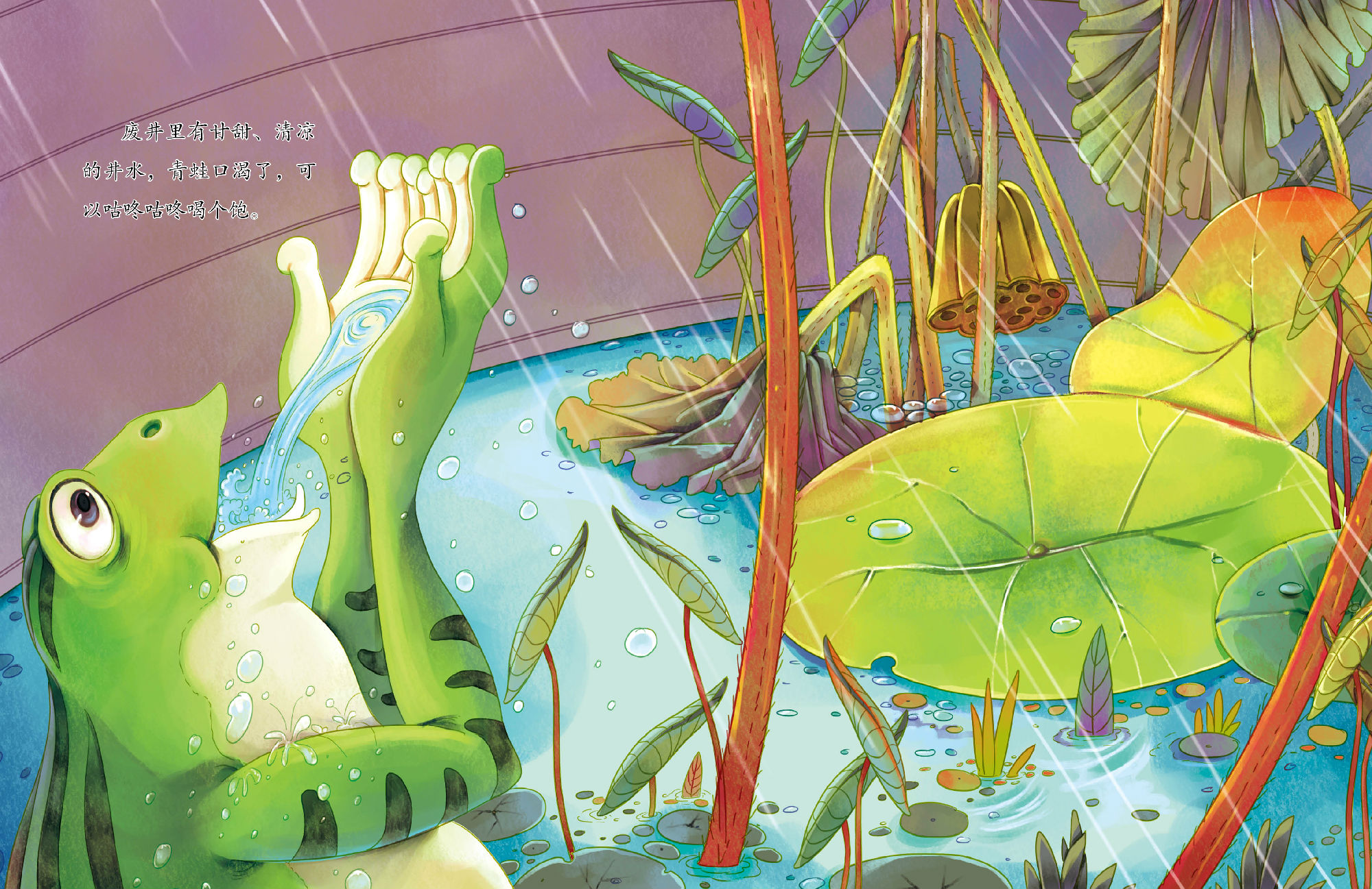 一只青蛙住在井底,他把这个小小的角落当成了广阔的天地,活得满足而快乐。直到有一天,一只大海龟出现在井口,与他倾心交谈,他才知道,原来井外还有辽阔无边的天空,还有一望无际的大海,还有大大小小的船只……井外的世界更精彩,井外的生活更美好。