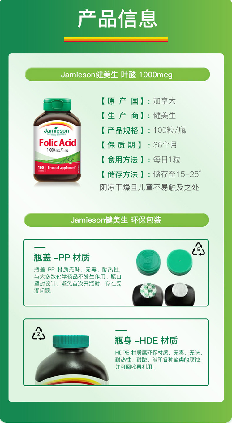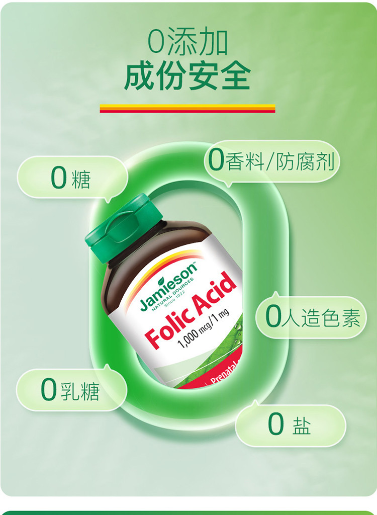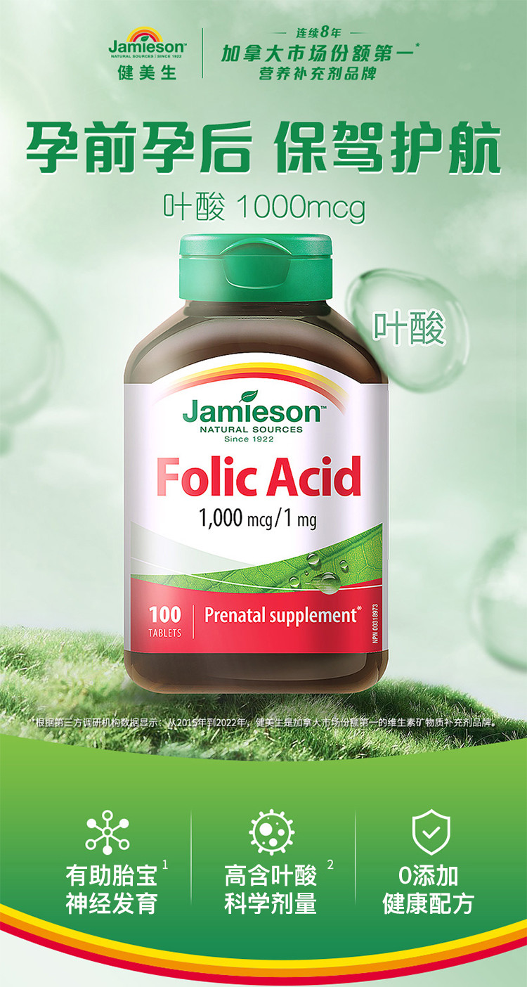 【分销】Jamieson高含量叶酸1000mcg备孕孕期营养100粒呵护孕妈胎宝发育