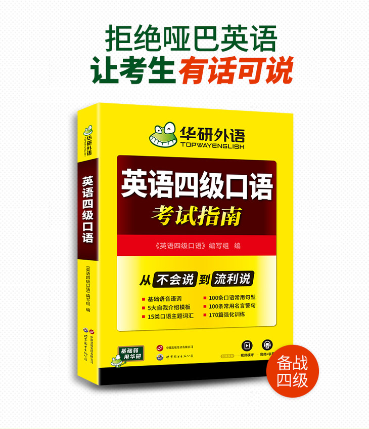 2. 总结英语四级口语考试高频词汇与句型,提供考场应急策略,让考生有话可说且说得流利,有助于从容应试;