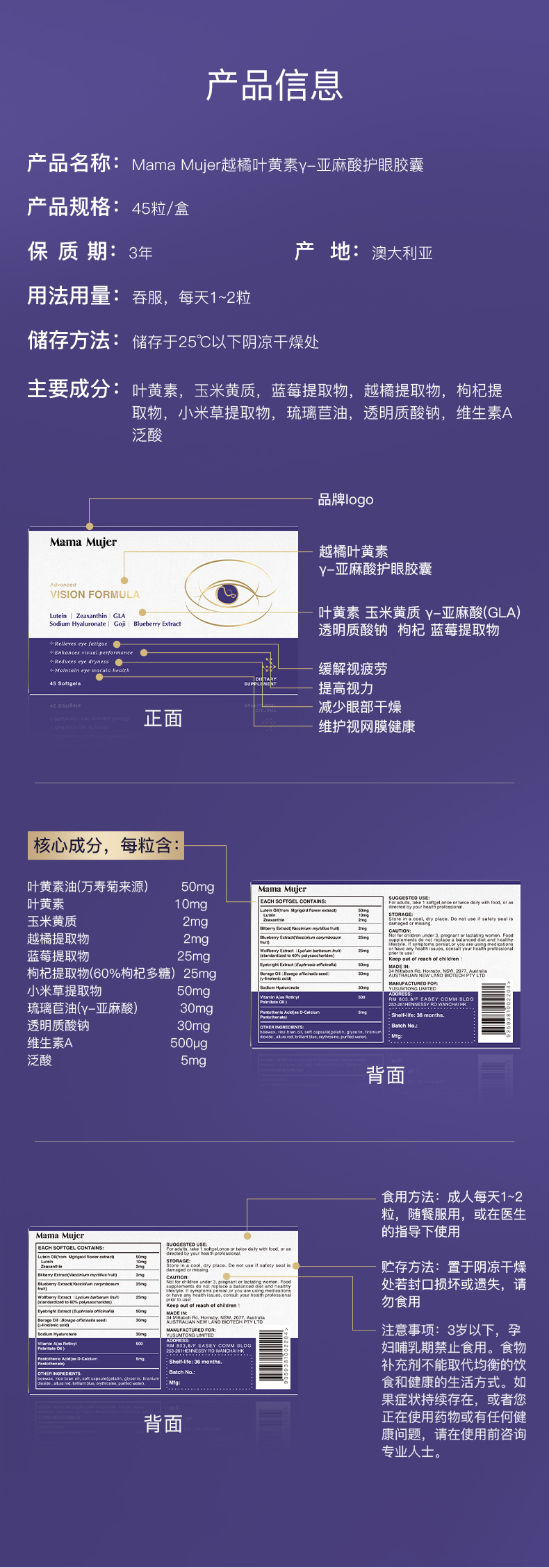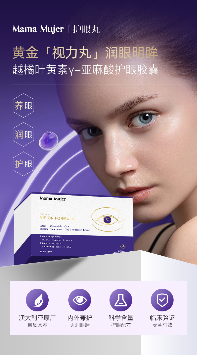 Mama Mujer 越橘叶黄素γ-亚麻酸护眼胶囊45粒/盒