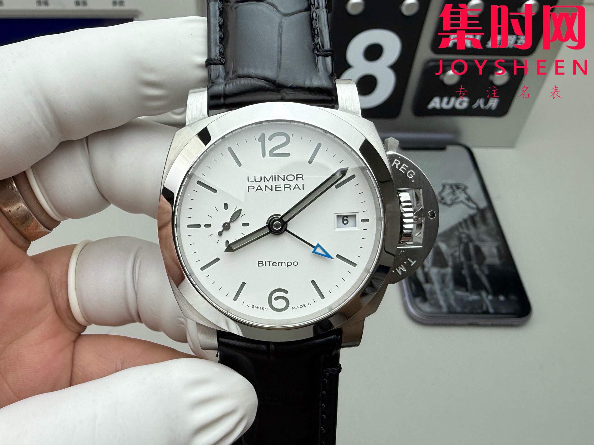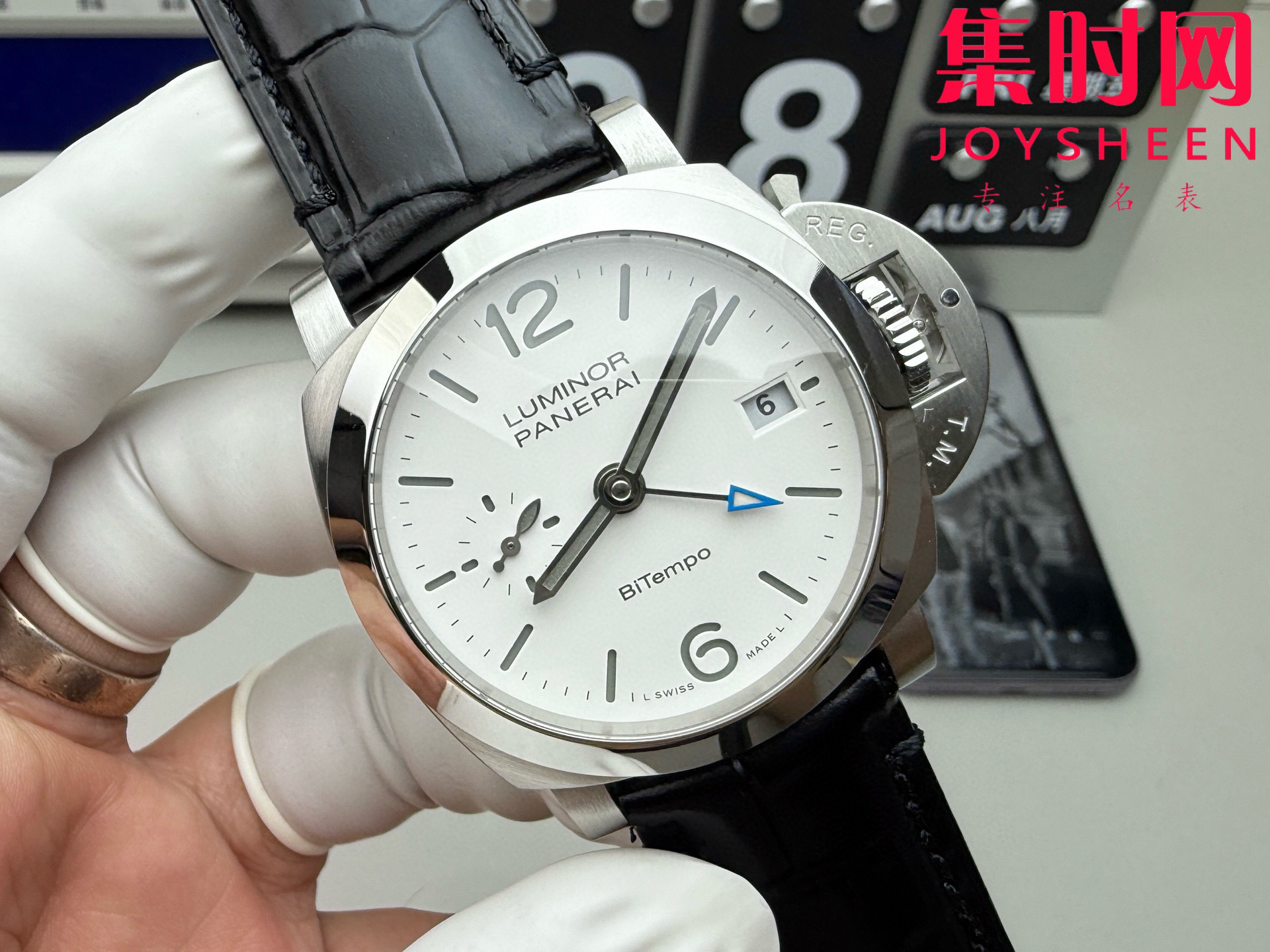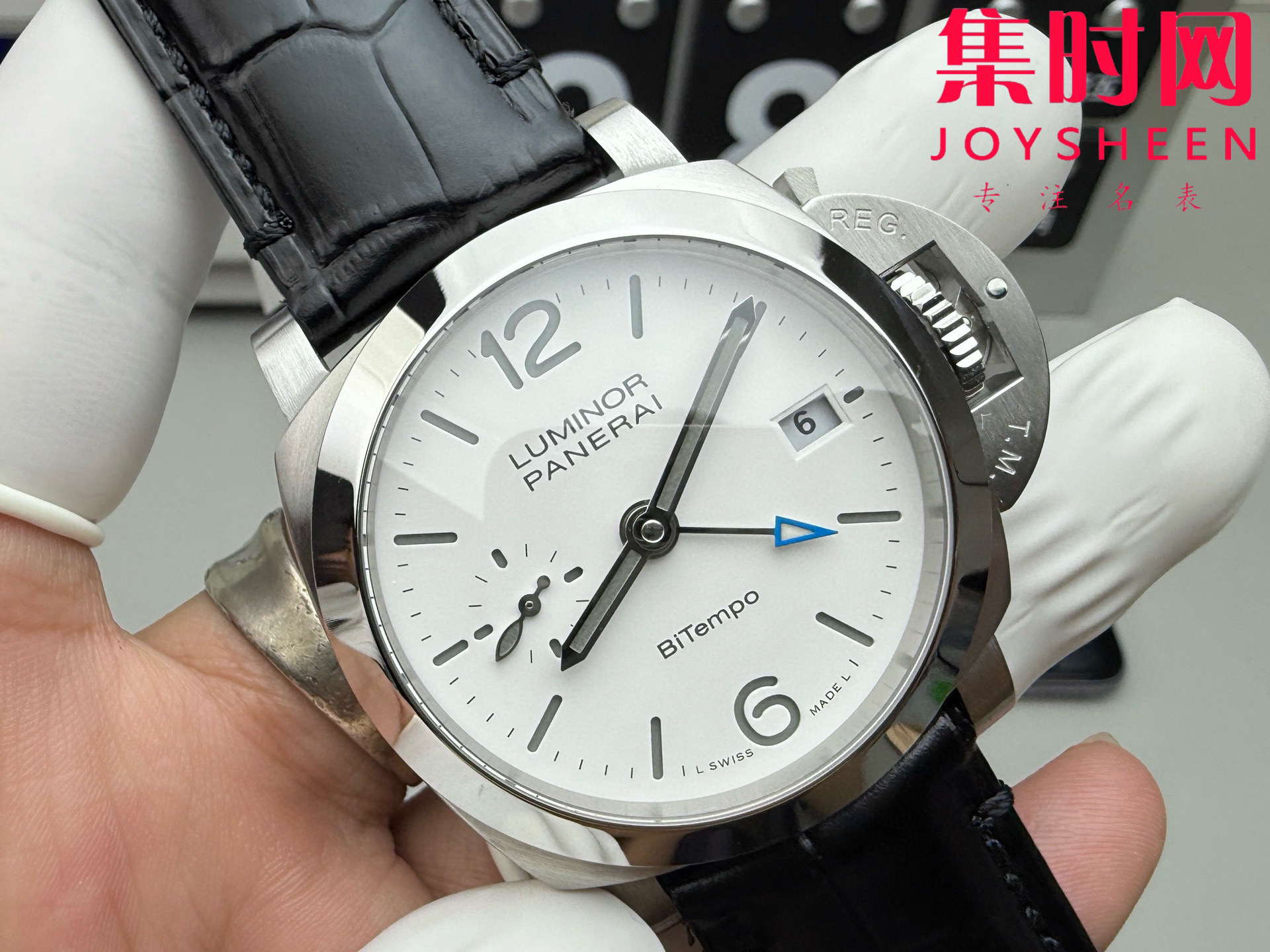 表盘:哑光白盘,GMT第二时区指针以蓝色点缀,超级夜光