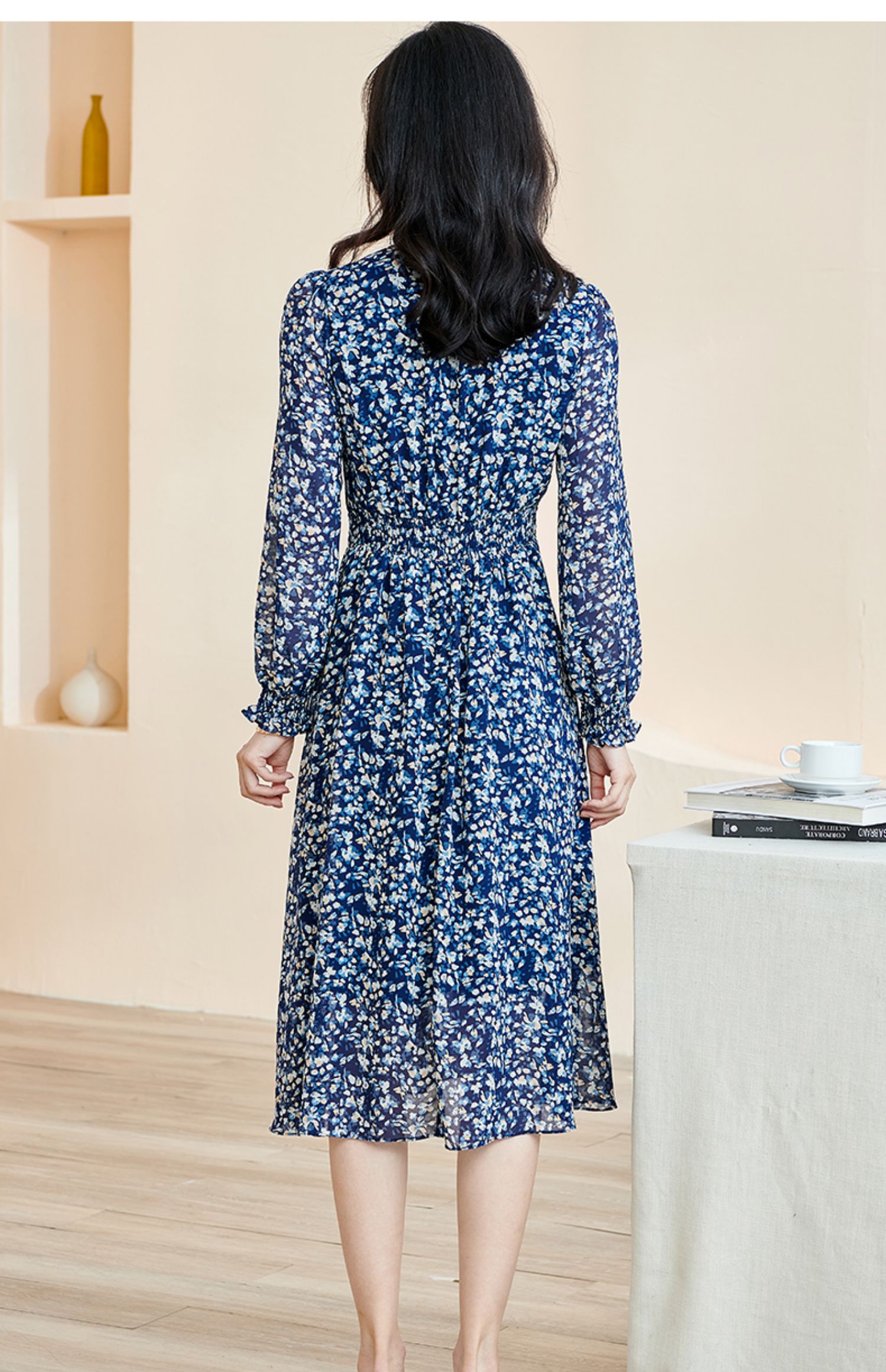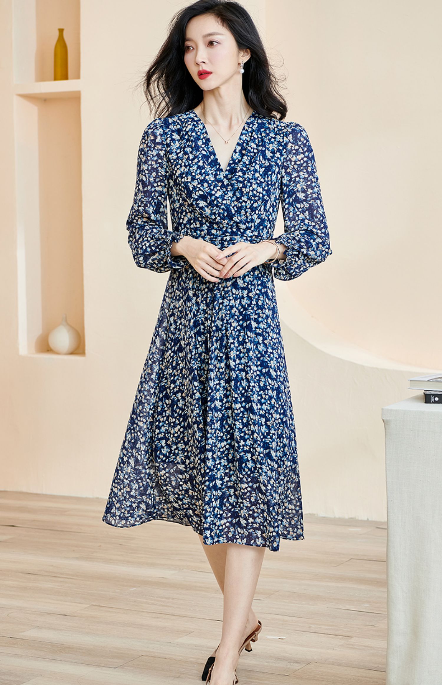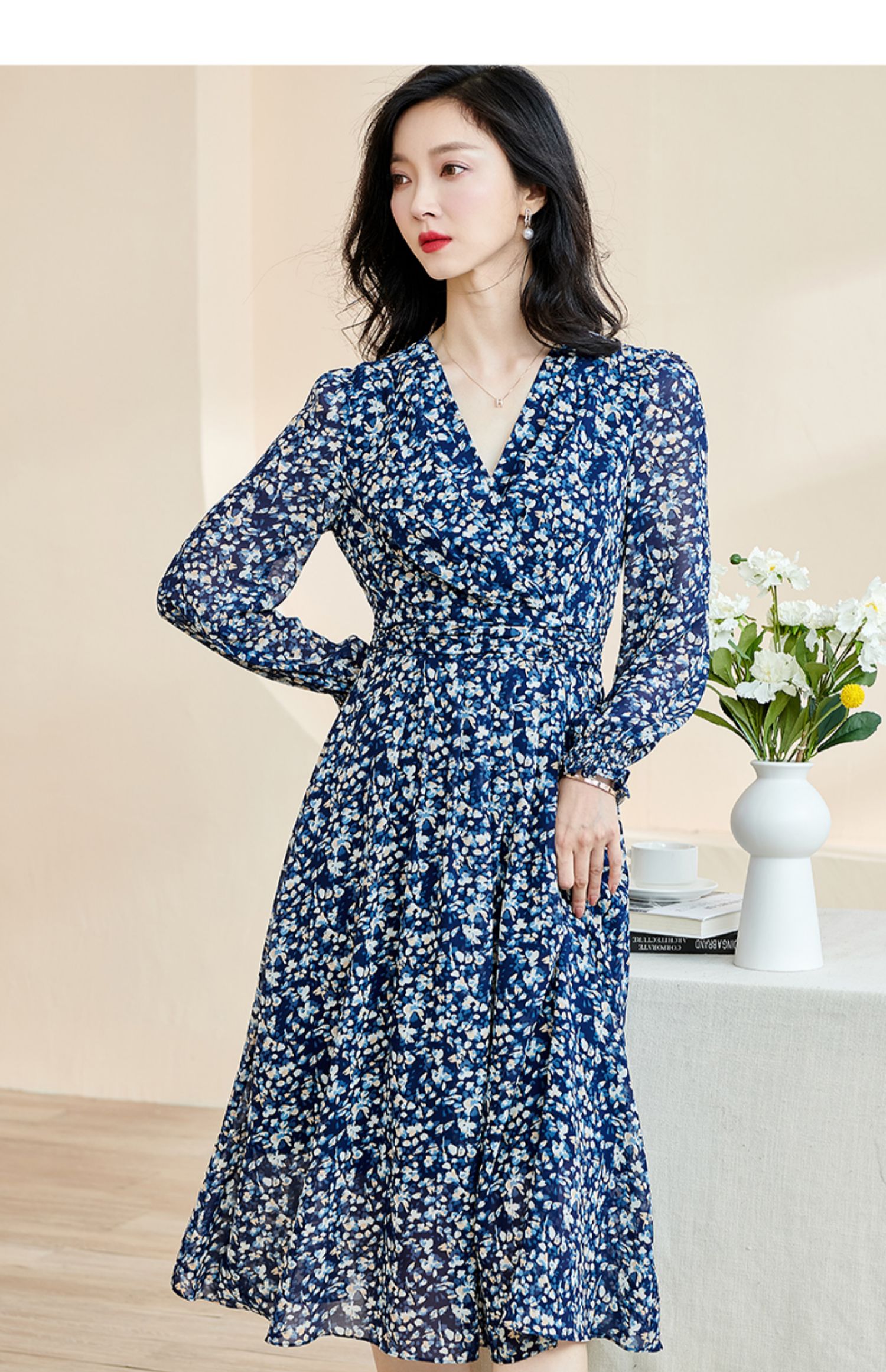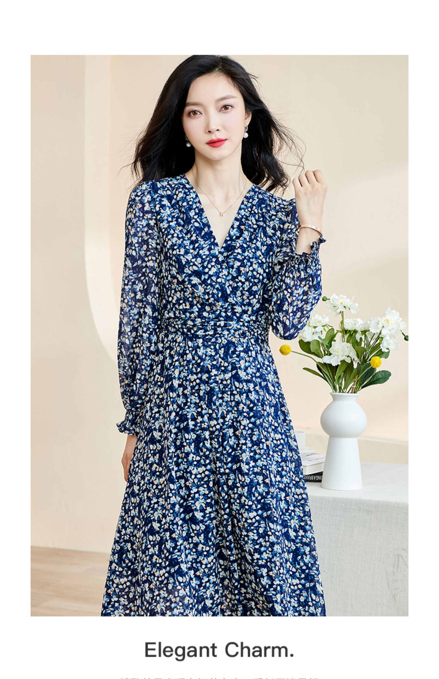 剩S 米思阳新款优雅气质碎花连衣裙压褶收腰垂感大摆裙2446