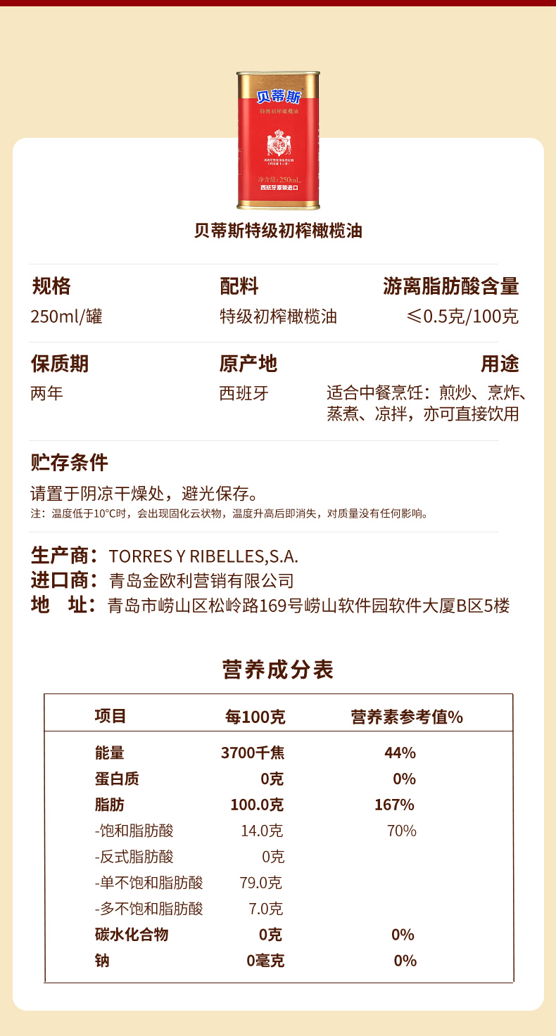 贝蒂斯特级初榨橄榄油250ml 宝宝孕妈可食用
