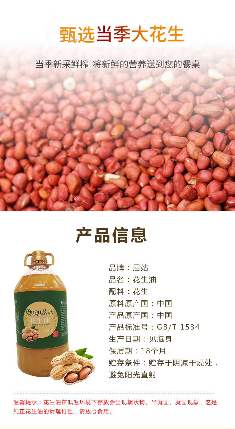 【严选】【 物理压榨 无添加】屈姑压榨一级花生油5L (厂家直发)