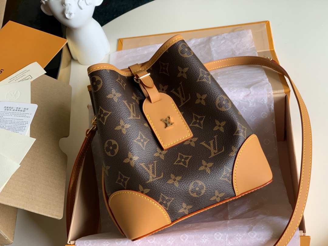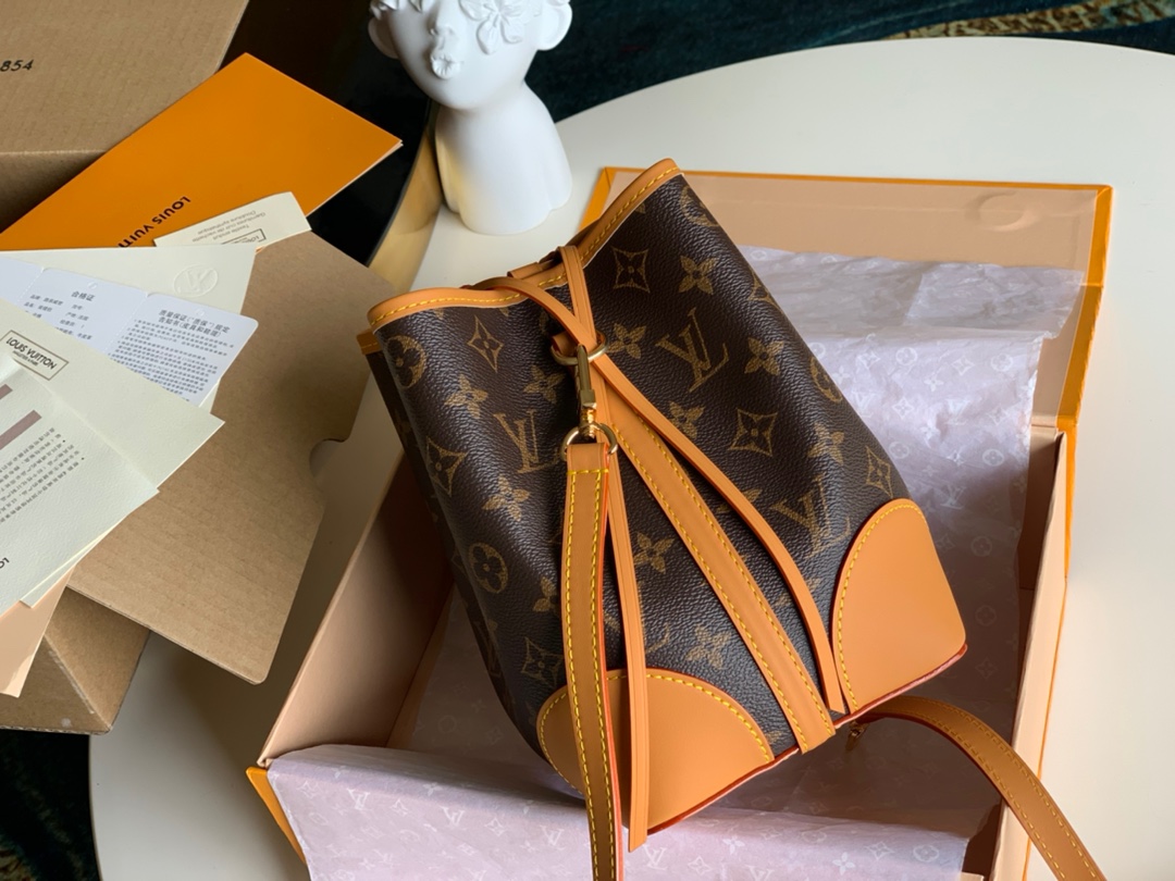 M45550】水桶包 犒赏自己的顶级别精品包配图片zp包装,焦糖色老花手袋沿袭路易威登经典的 Noé 水桶包设计,精巧尺寸散发清新活力,花料拼皮 复古走秀LⅤ烧卖💛水桶包! 尺寸:22×19x23CM