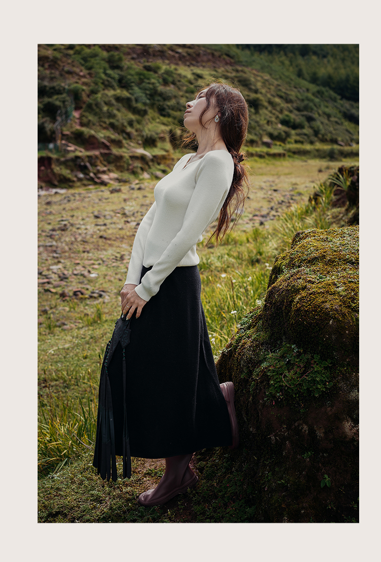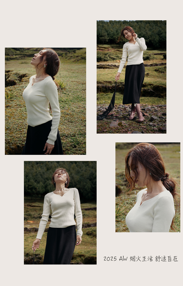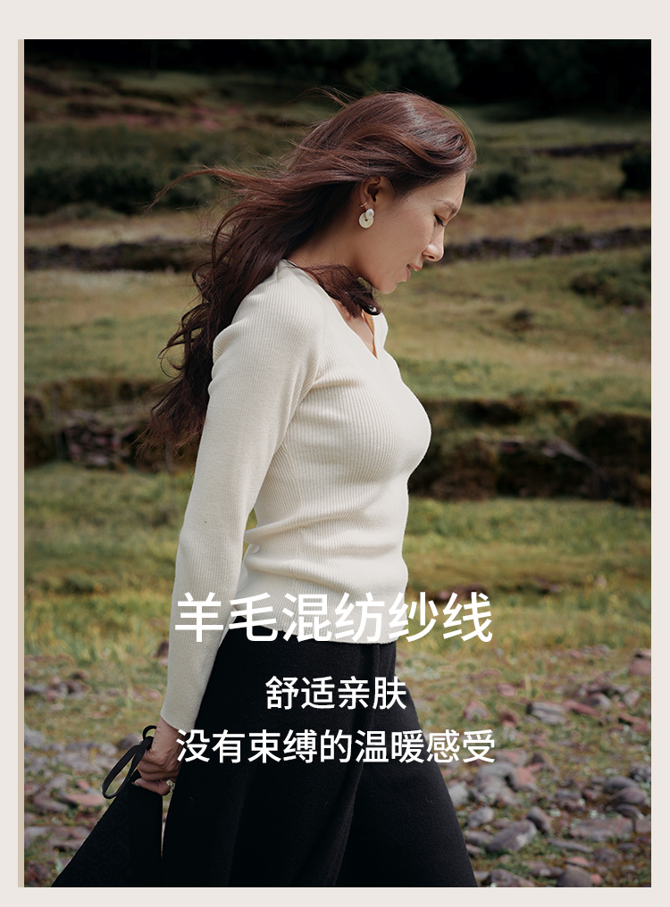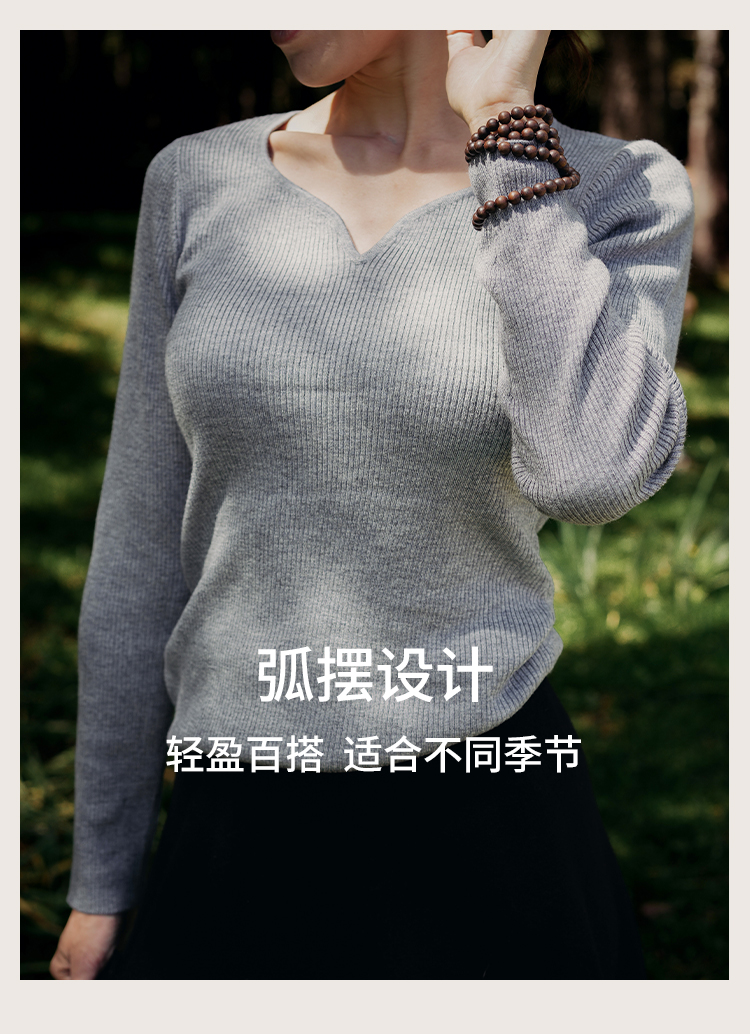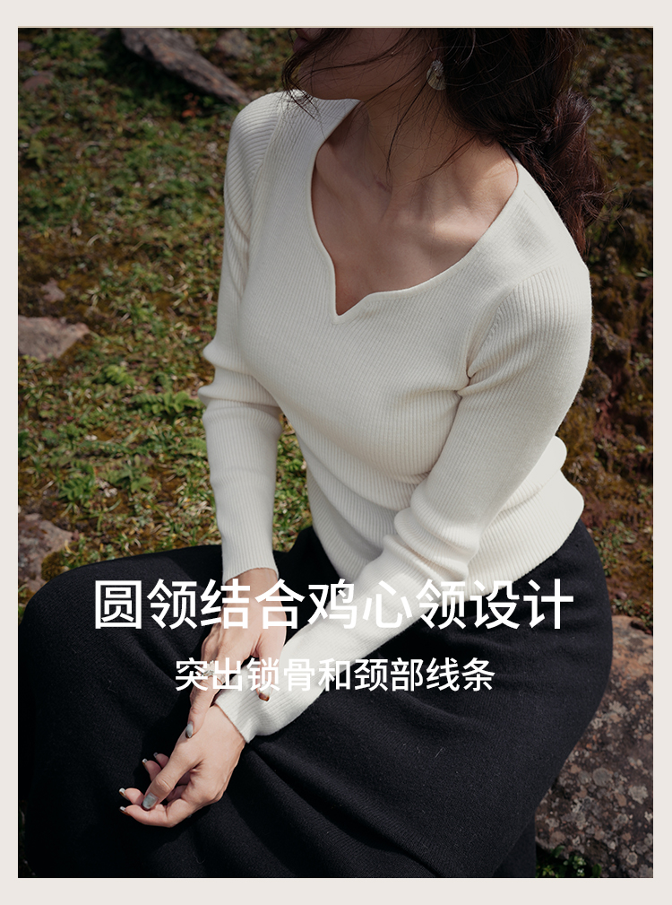 L RECNAVA 绵羊毛 可机洗毛衣 优雅V领修身针织衫
