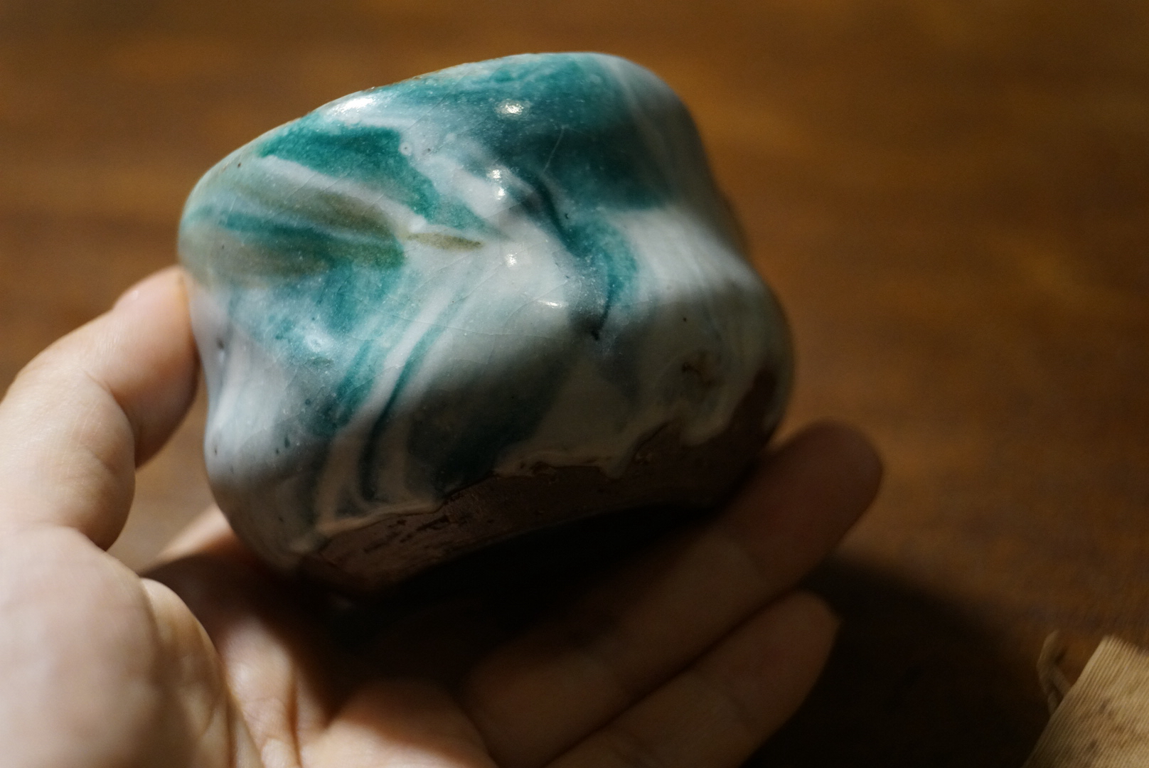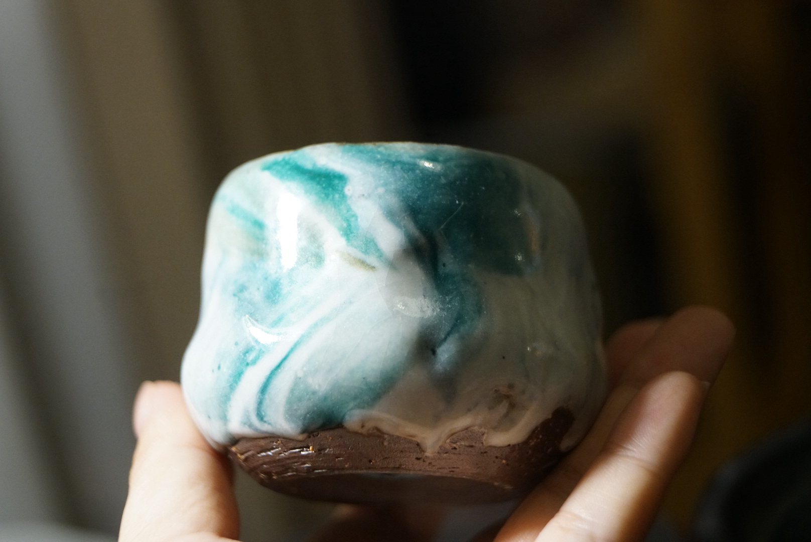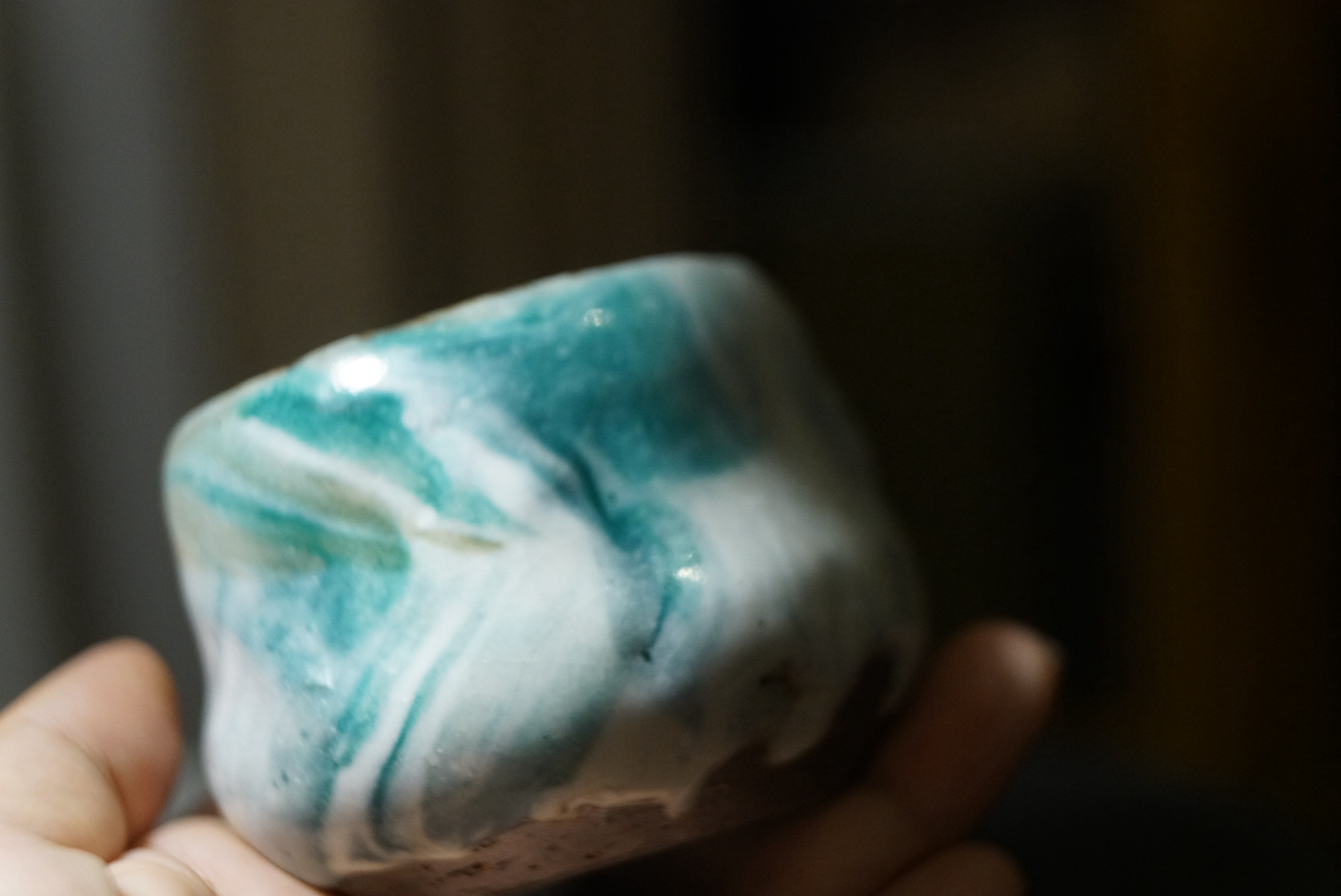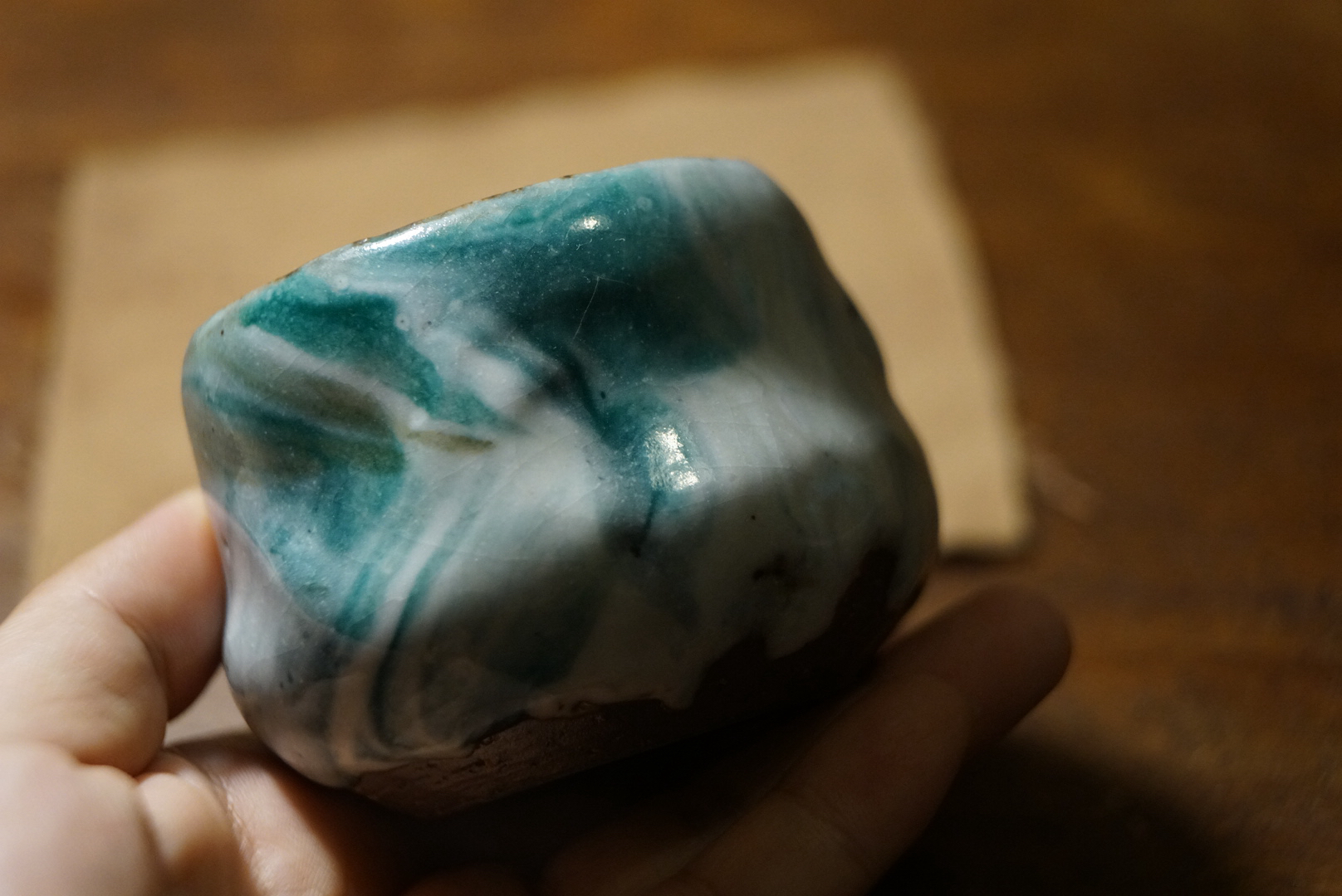志野烧使用的胚土叫做艾土 艾土稀少,含铁柔软,颜色白中透青。在烧制时 艾土因为含铁会在局部及边缘产生美丽的火色,在不平滑的表皮上带出像渐变的星空一样的层次。