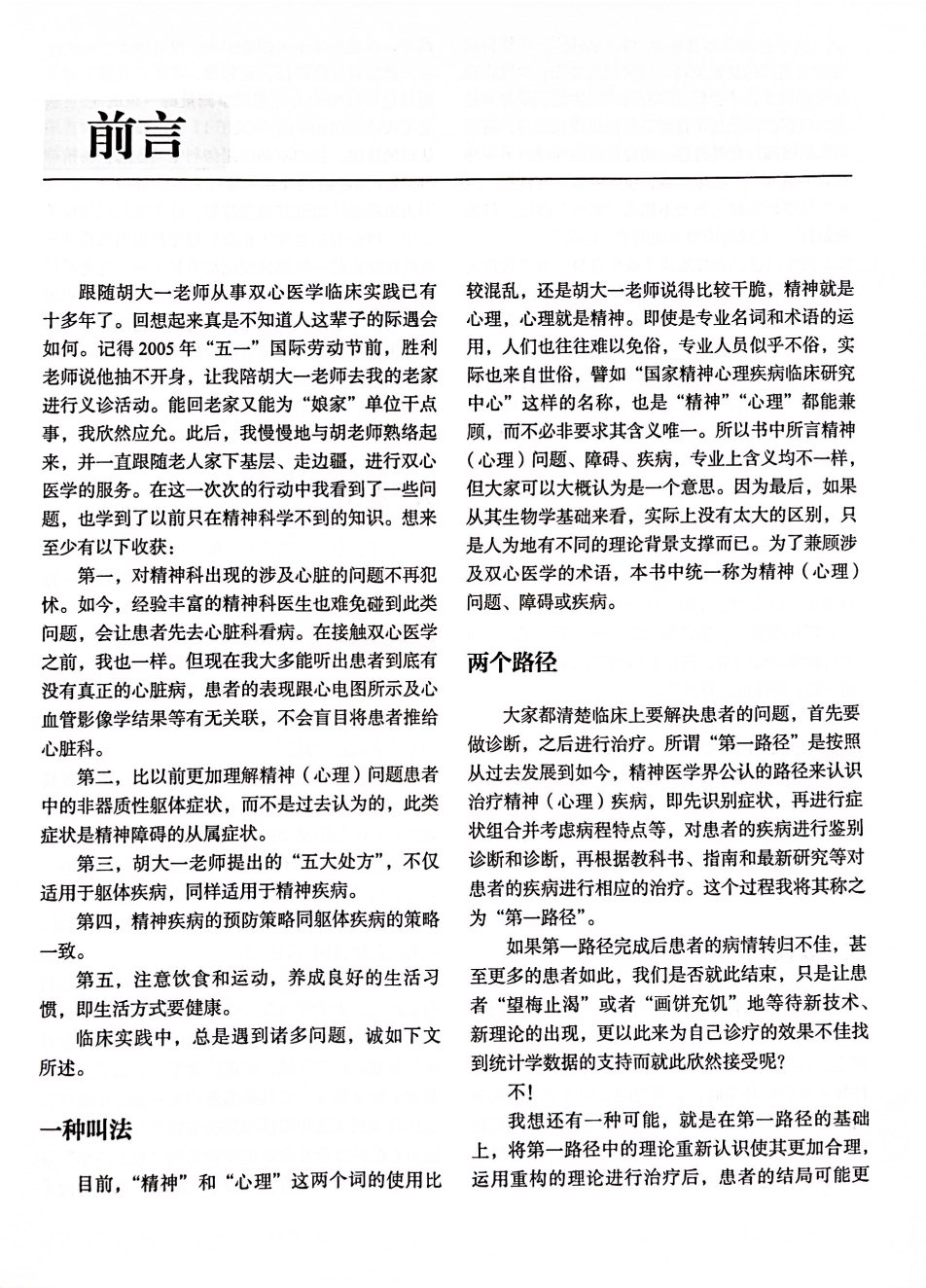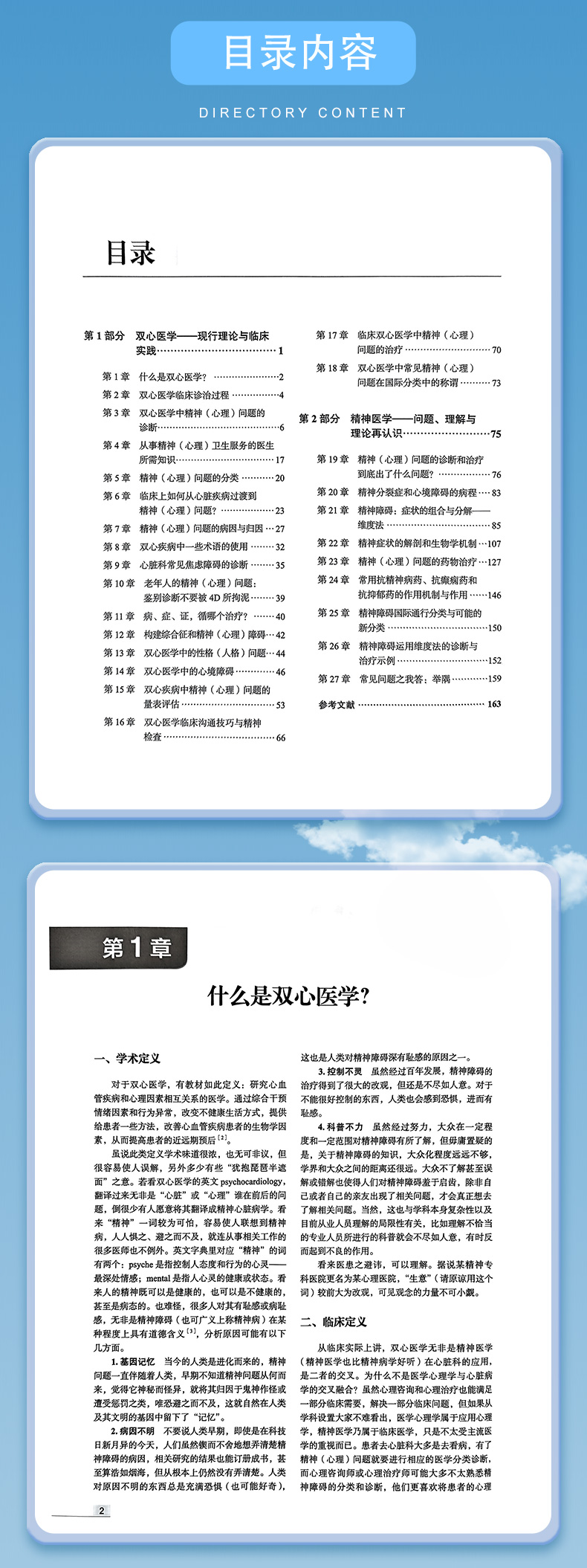 本书分成双心医学临床实践和精神医学理论再认识两部分。第一部分是按照当下的精神医学理论如何在双心医学实践中得到体现和运用,与临床实际密切结合,相较之下,双心医学工作者会看到与自己所掌握的理论和实践运用有何不同。第二部分先从精神医学临床实践的实际问题出发,再借鉴他人的发现,结合自己的实践经验和感悟,重塑了精神医学理论。之后又有临床案例示范和常见问题的个人解答,可以看到理论如何指导了实践,实践又反过来修正了理论。