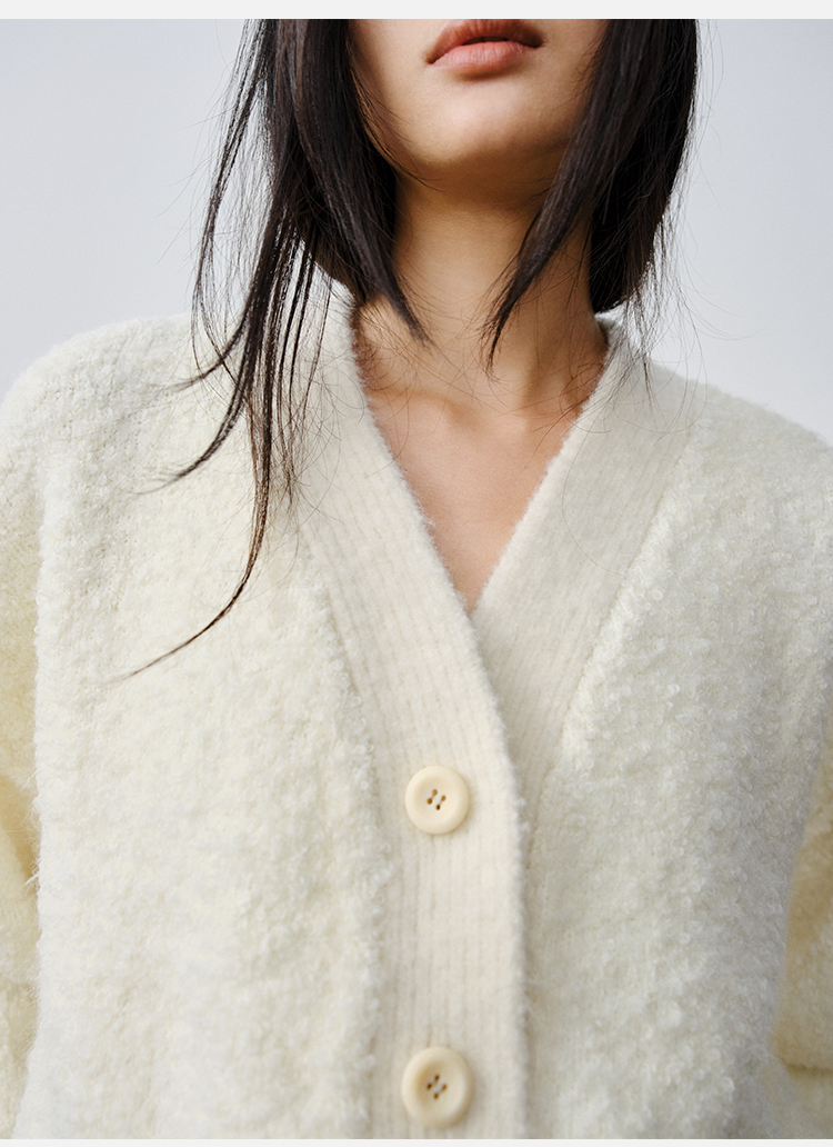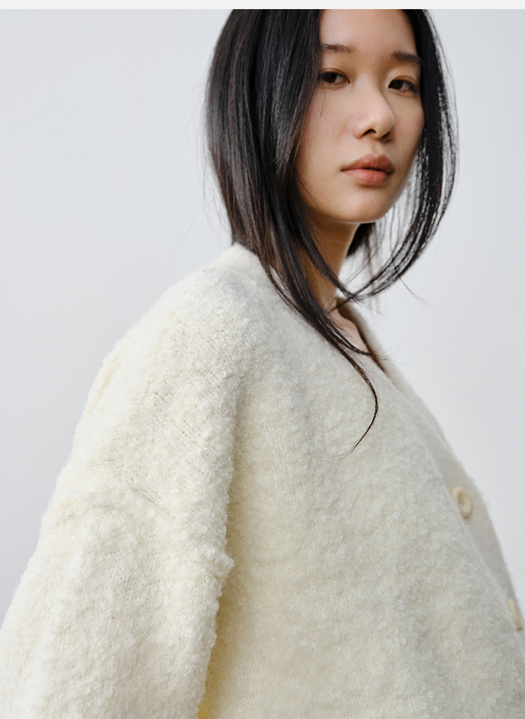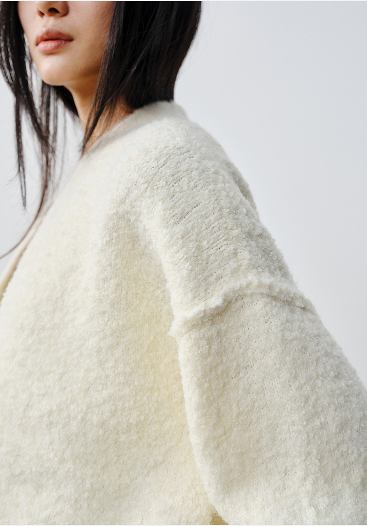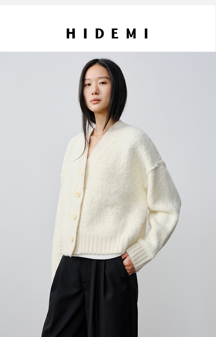 HIDEMI 澳洲美利奴羊毛混纺花式圈圈纱加厚款V领宽边开衫毛衣