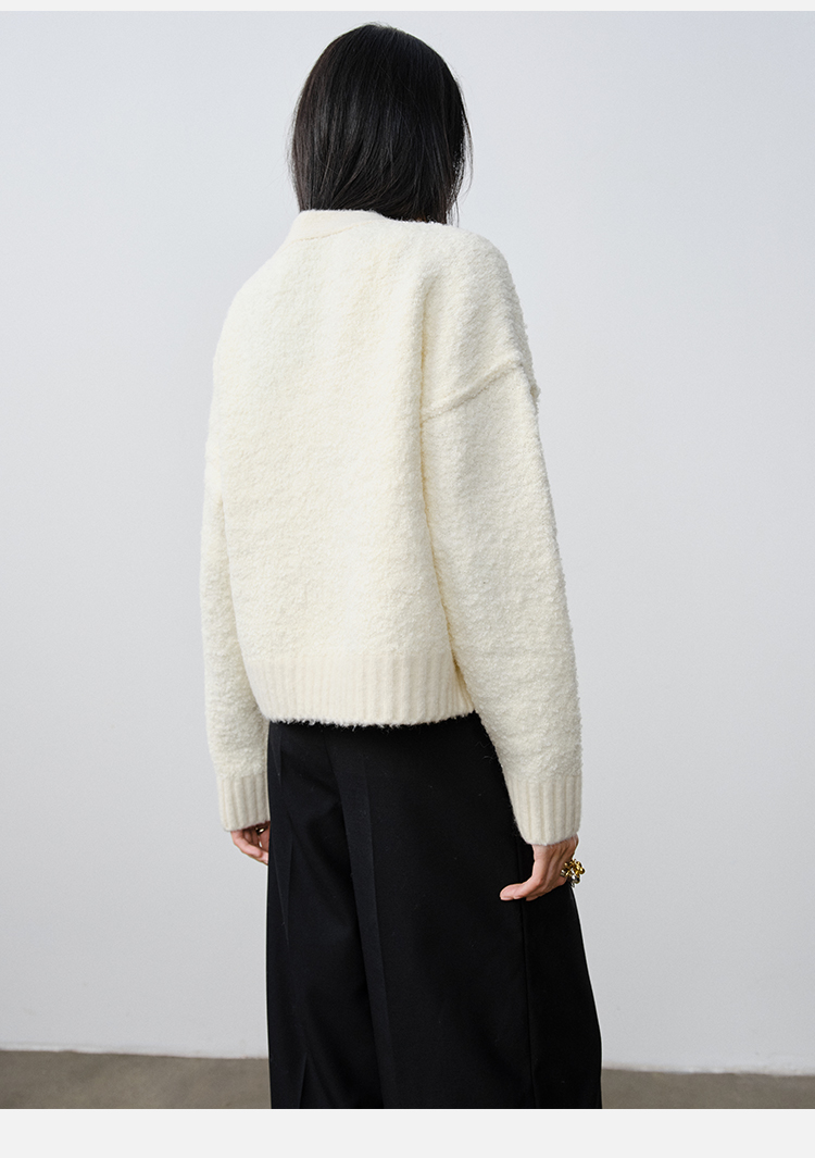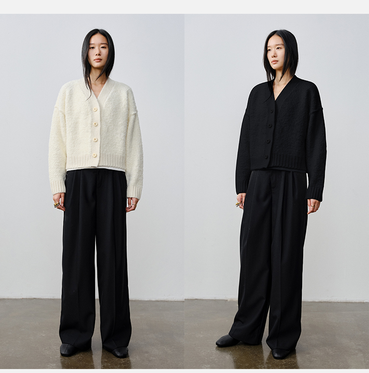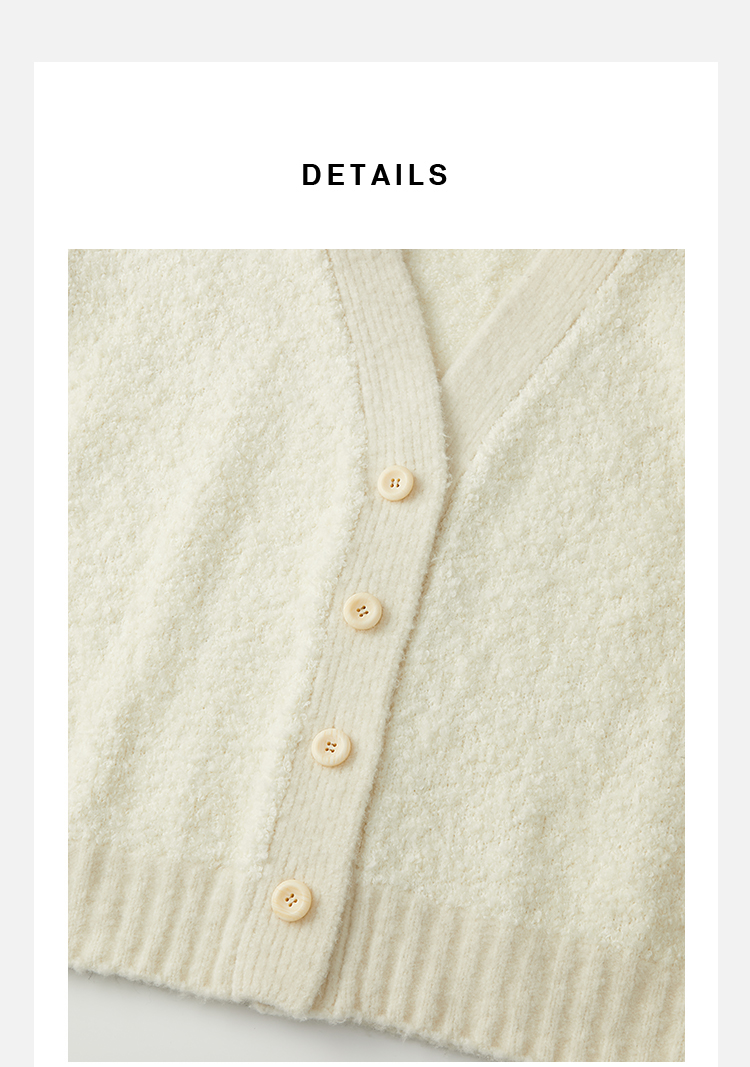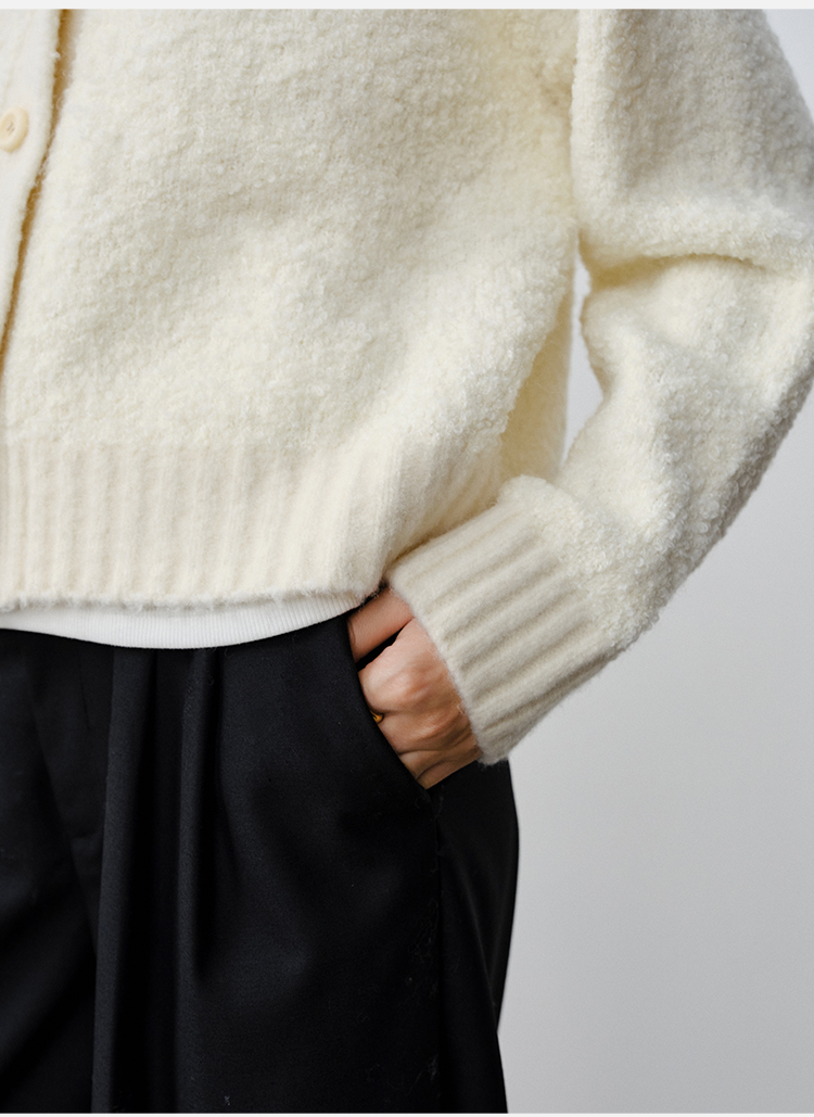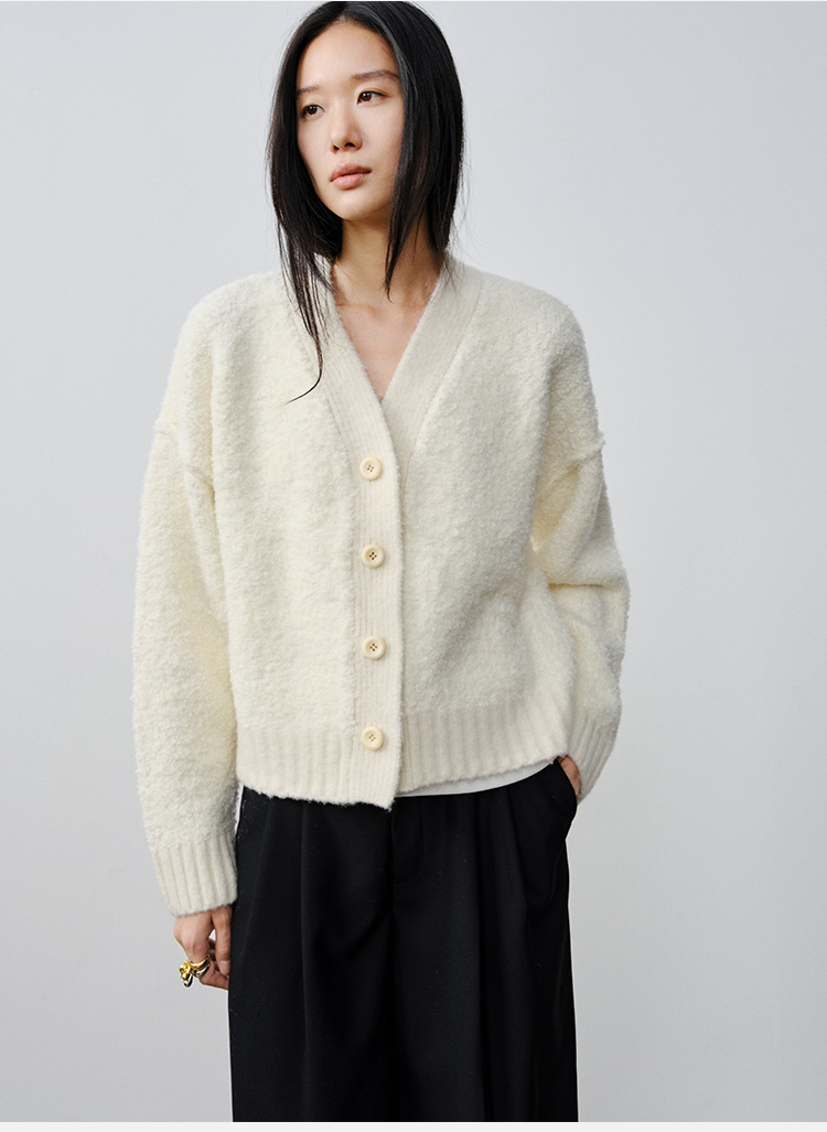 HIDEMI 澳洲美利奴羊毛混纺花式圈圈纱加厚款V领宽边开衫毛衣