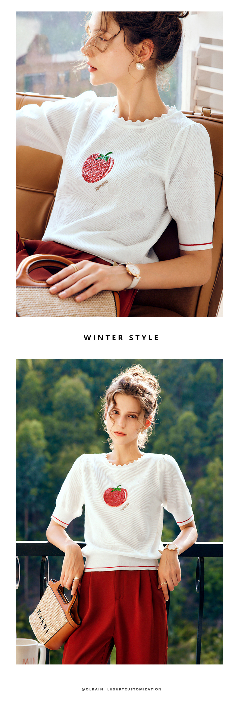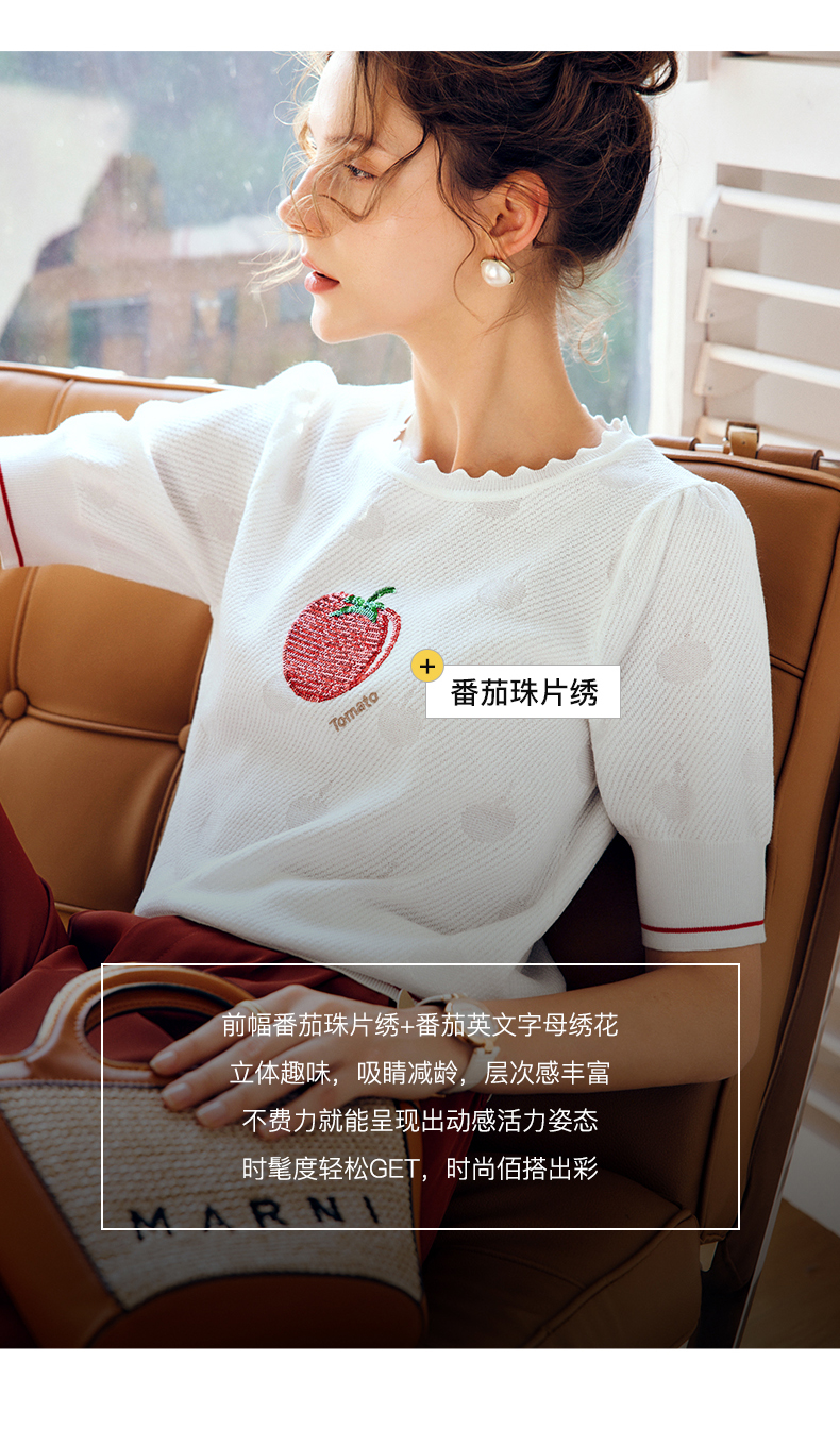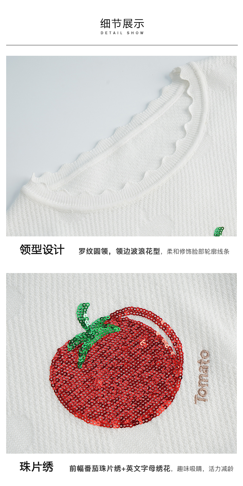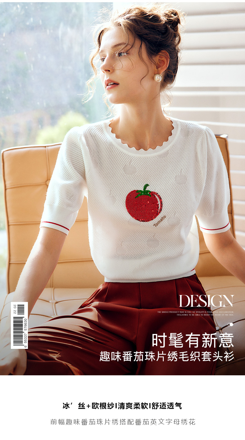 OLrain法式白色针织衫女夏季2022年新款珠片刺绣欧根纱冰丝套头衫