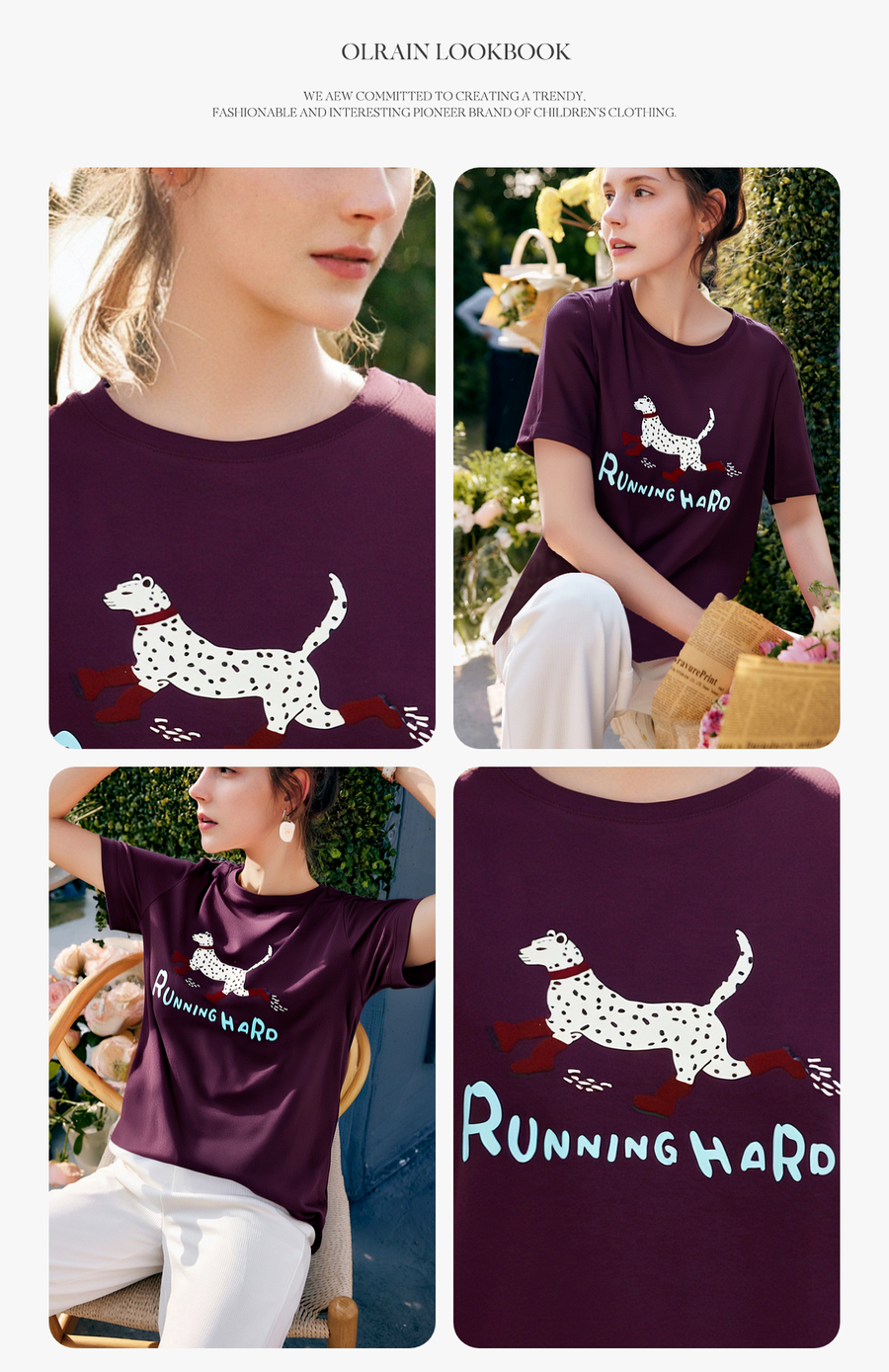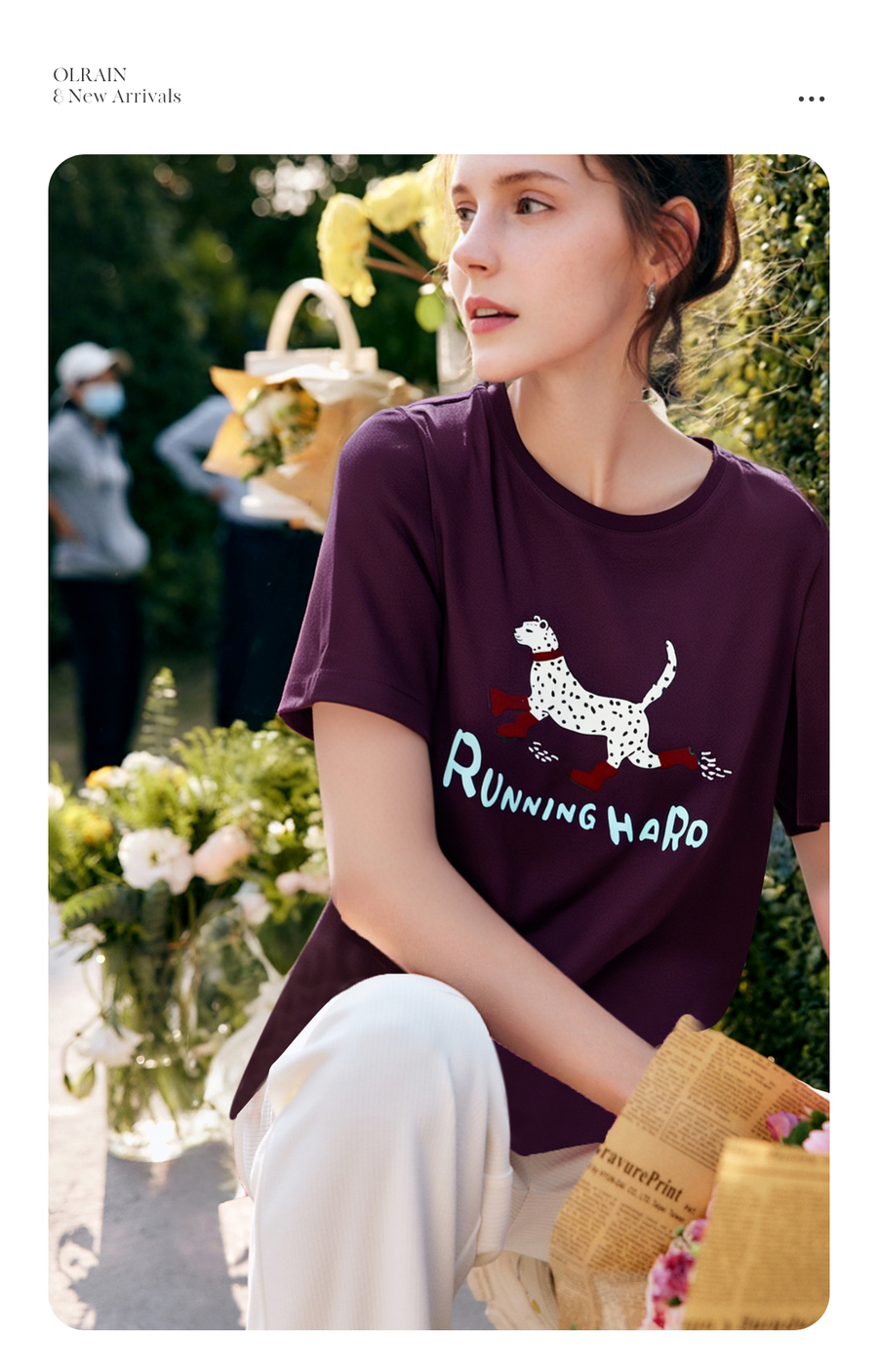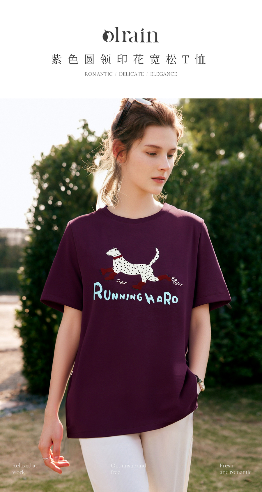 OLrain欧芮儿紫色圆领印花宽松T恤女夏季2025年新款休闲字母上衣