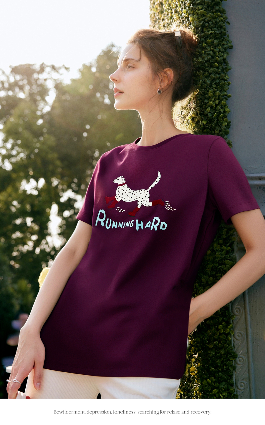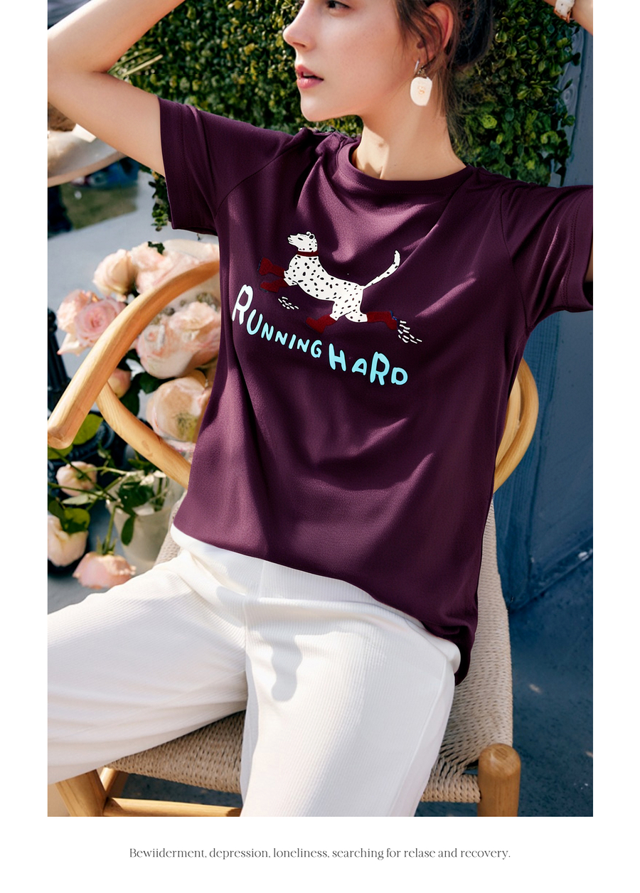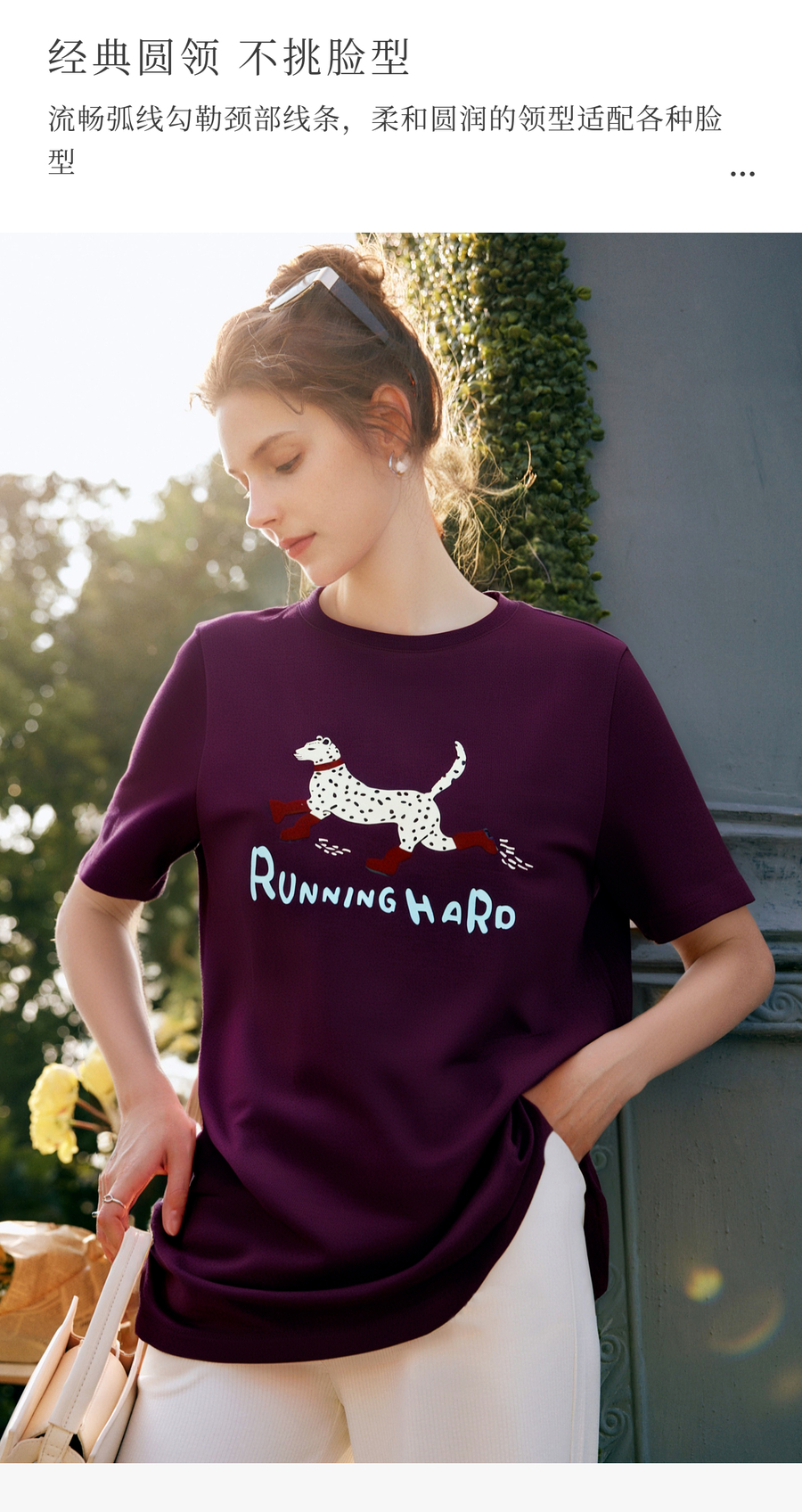 OLrain欧芮儿紫色圆领印花宽松T恤女夏季2025年新款休闲字母上衣