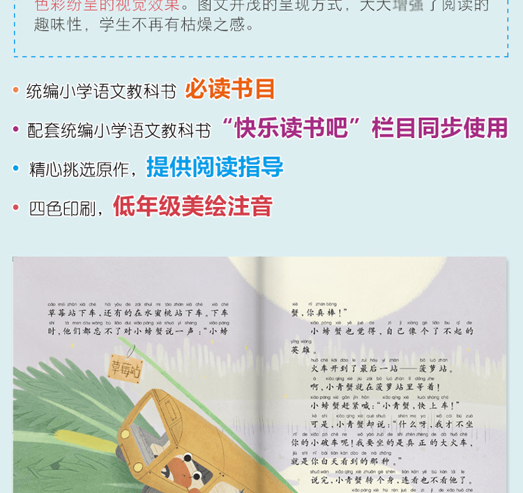 快乐读书吧丛书是人教部编版语文教材推荐阅读,是适合二年级上册学生阅读的注音版美绘丛书:旨在扩大学生阅读量,以故事教学为满足学生的学习需求提供了条件,学习材料更加丰富,富有逻辑,充满智慧,故事教学中的阅读训练,帮助学生充分发挥阅读理解的能力;读写训练帮助学生系统地运用语言,听力训练更是充满了挑战;学生还可以通过复述、表演故事充分发挥想象力和创造力。