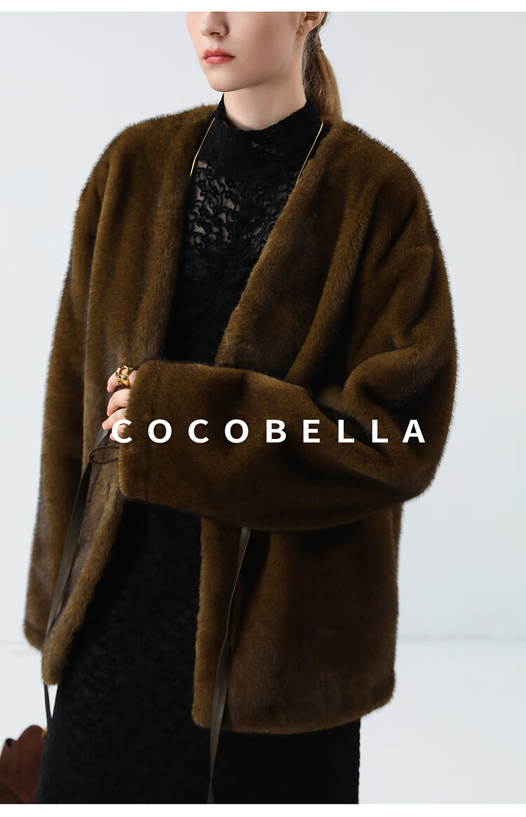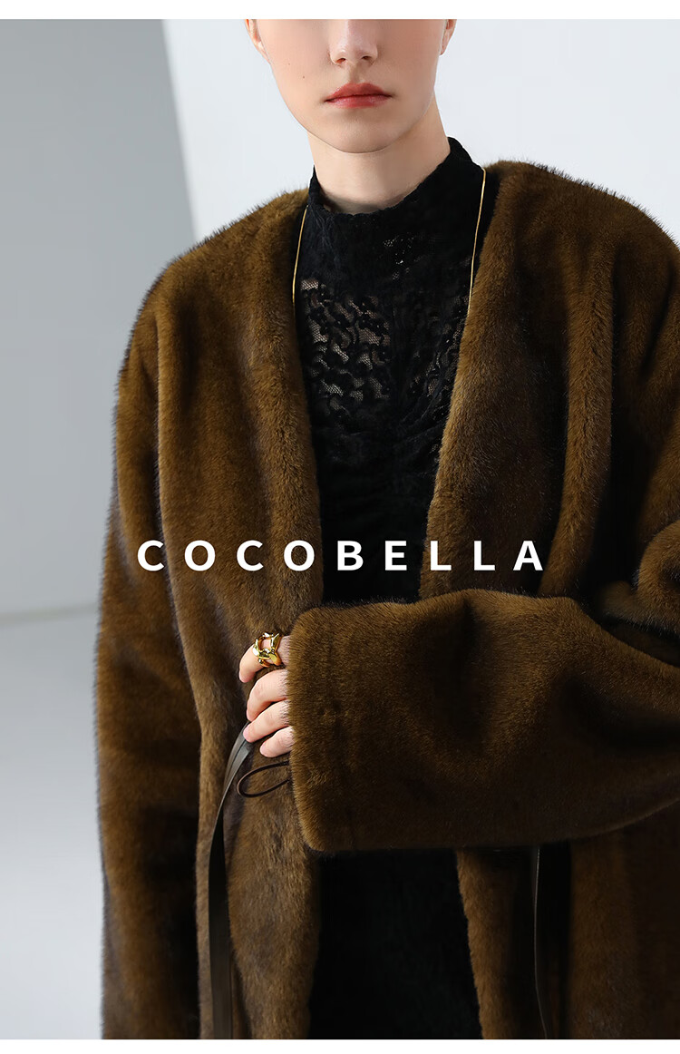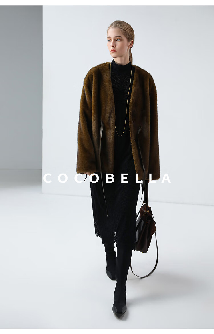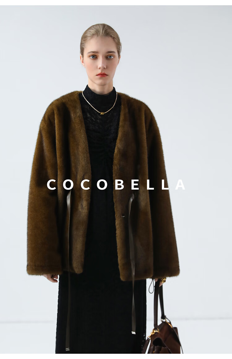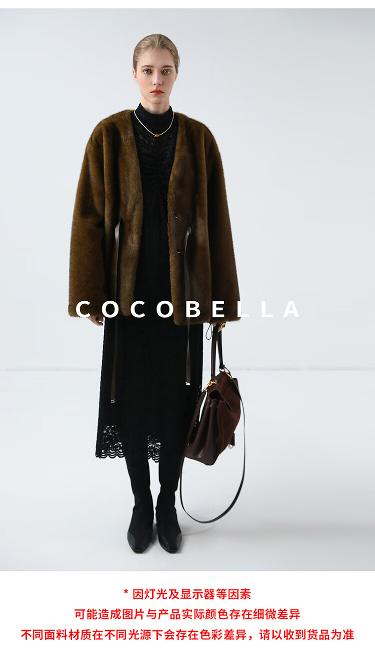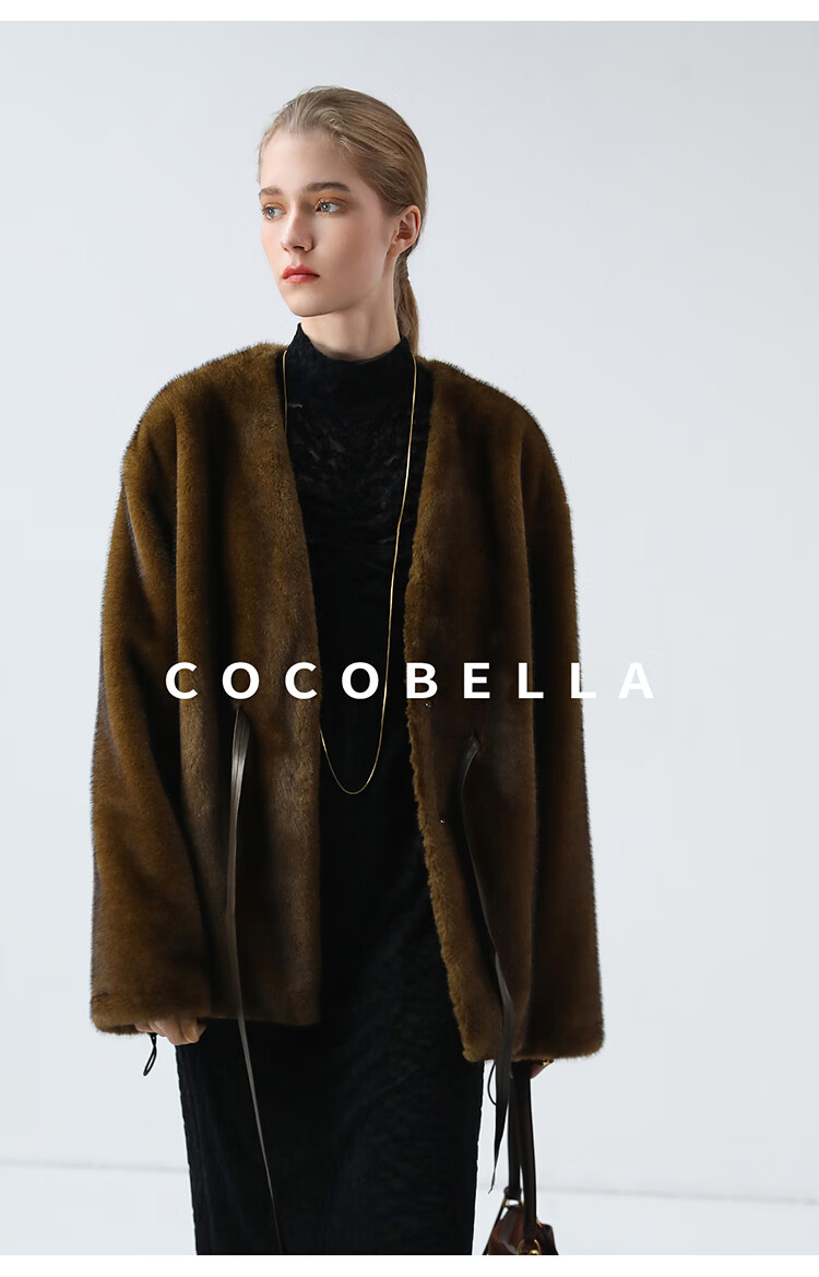 COCOBELLA高奢原色仿貂绒环保皮草外套PU腰带短款大衣FU3003-2