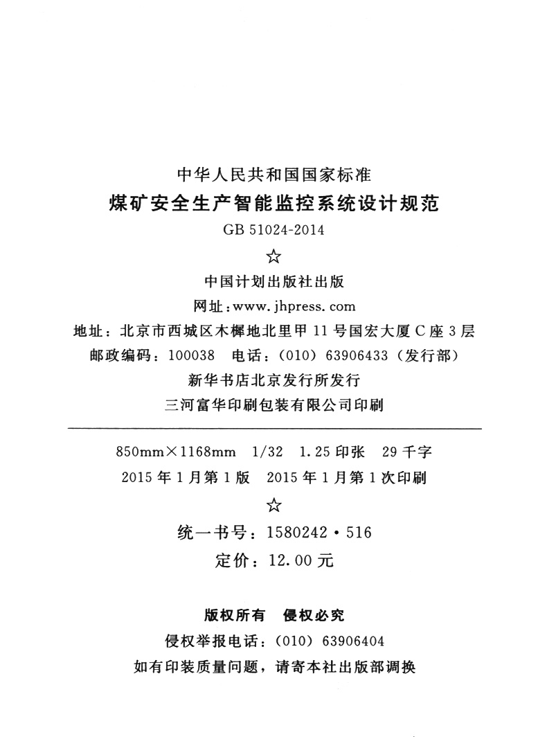 书名:GB 51024-2014 煤矿安全生产智能监控系统设计规范