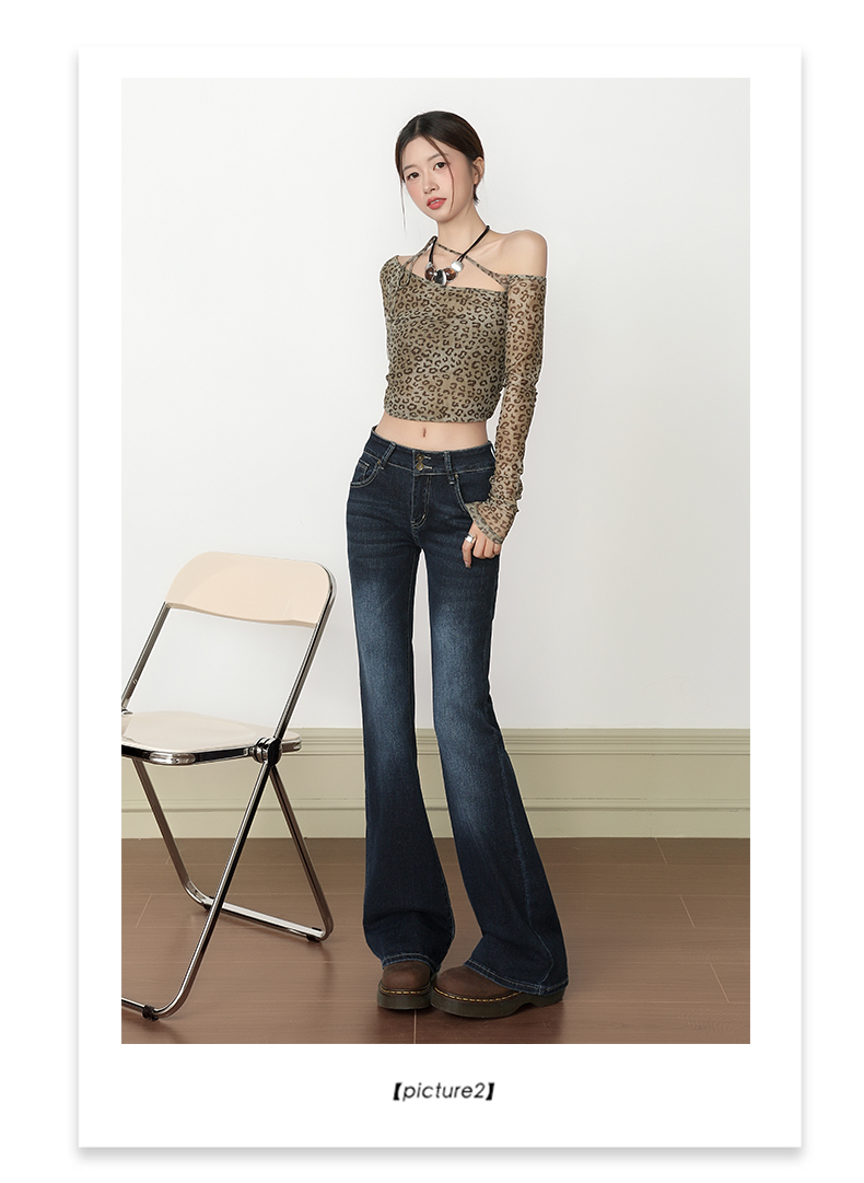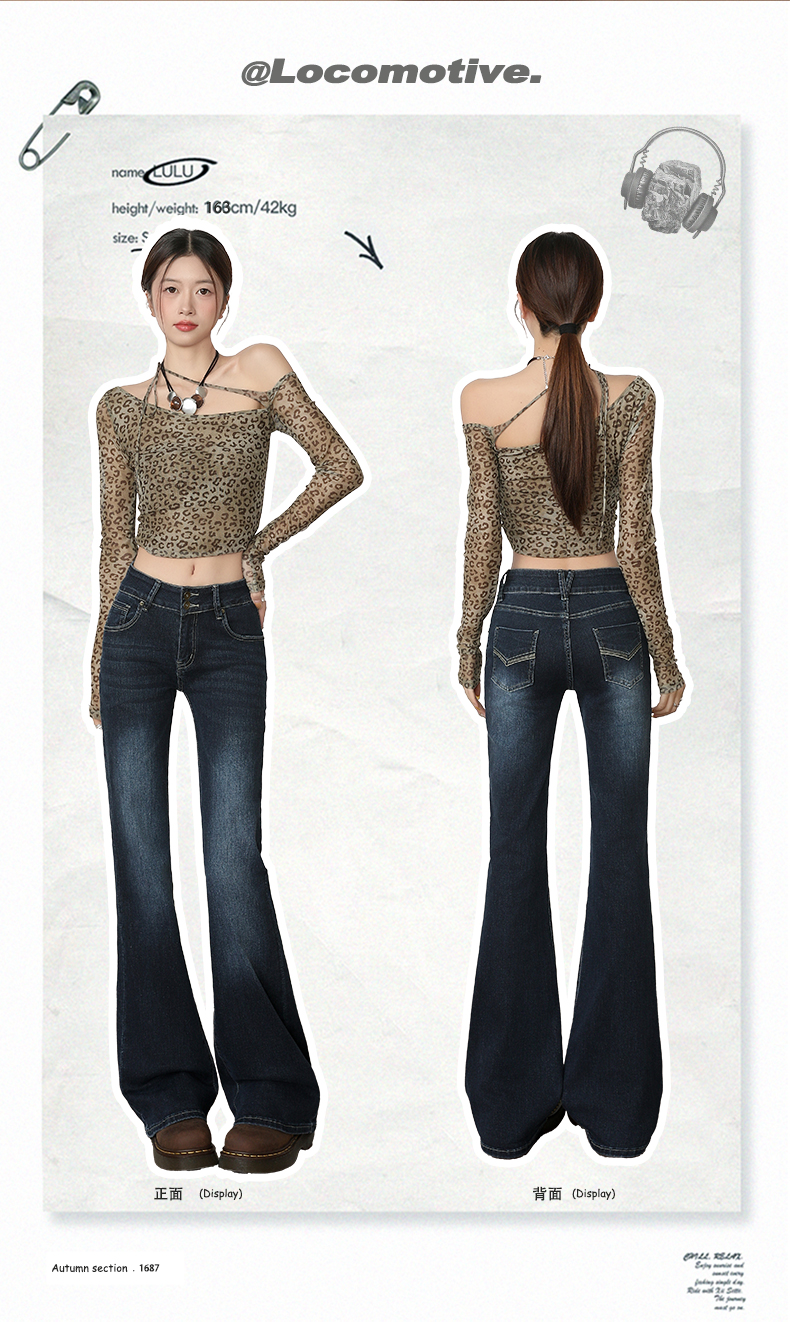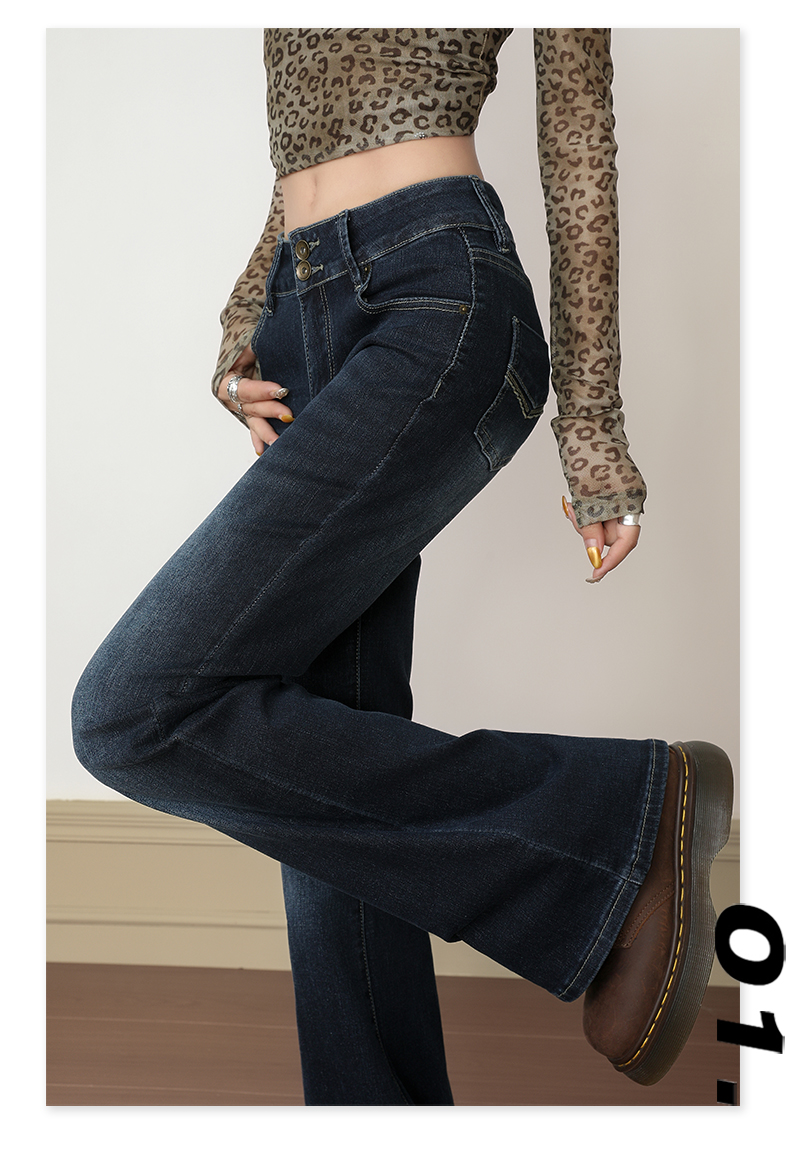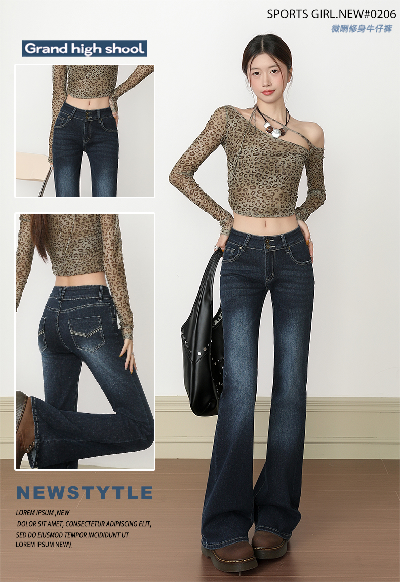罗蒙女士牛仔裤美式复古低腰微喇辣妹修身直筒长裤子百搭弹力拖地喇叭裤子
